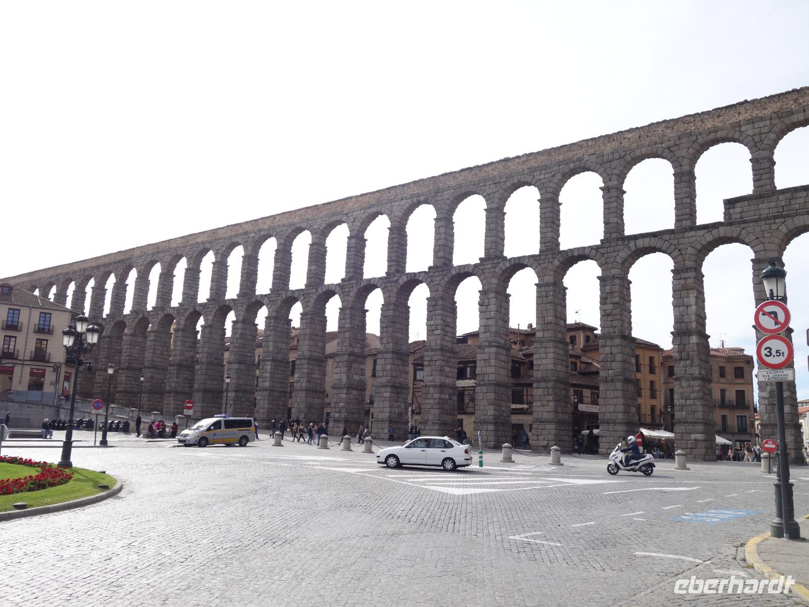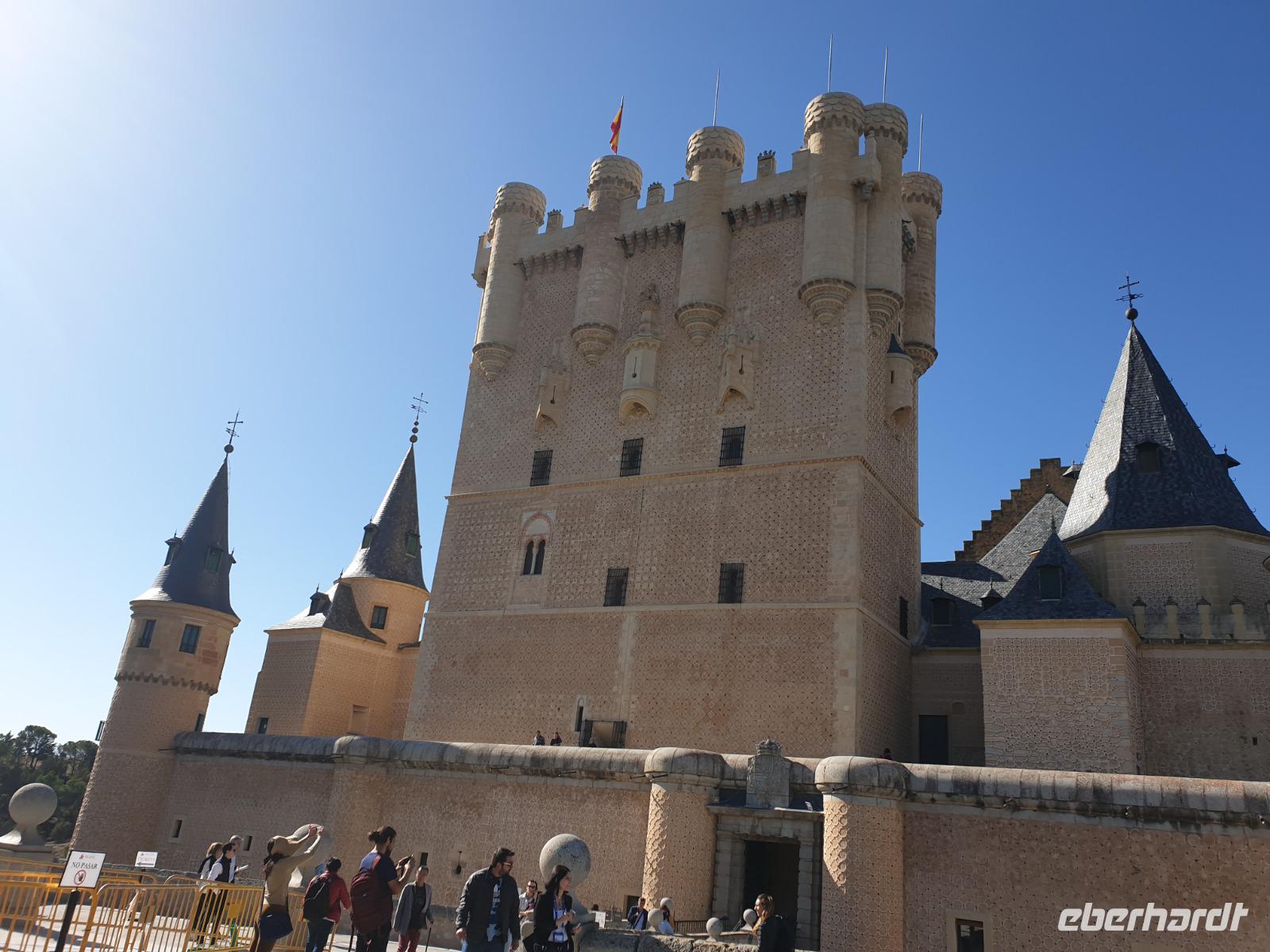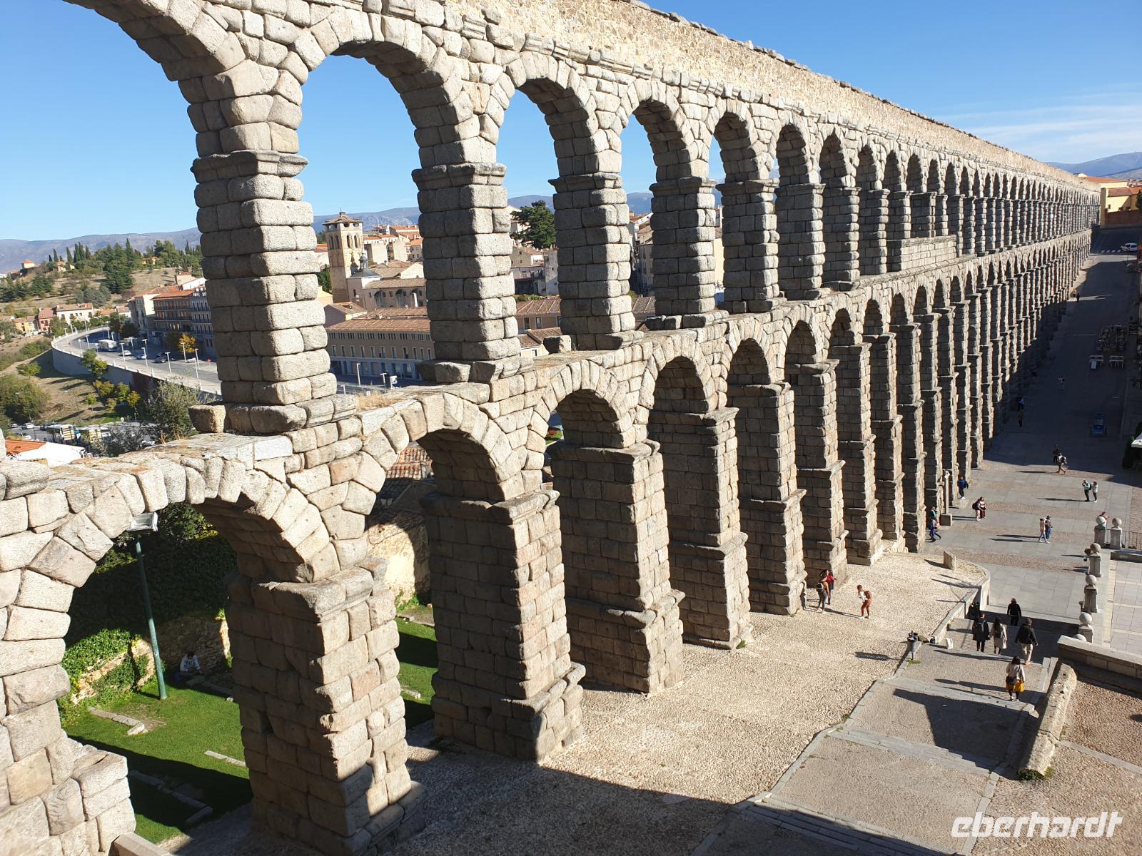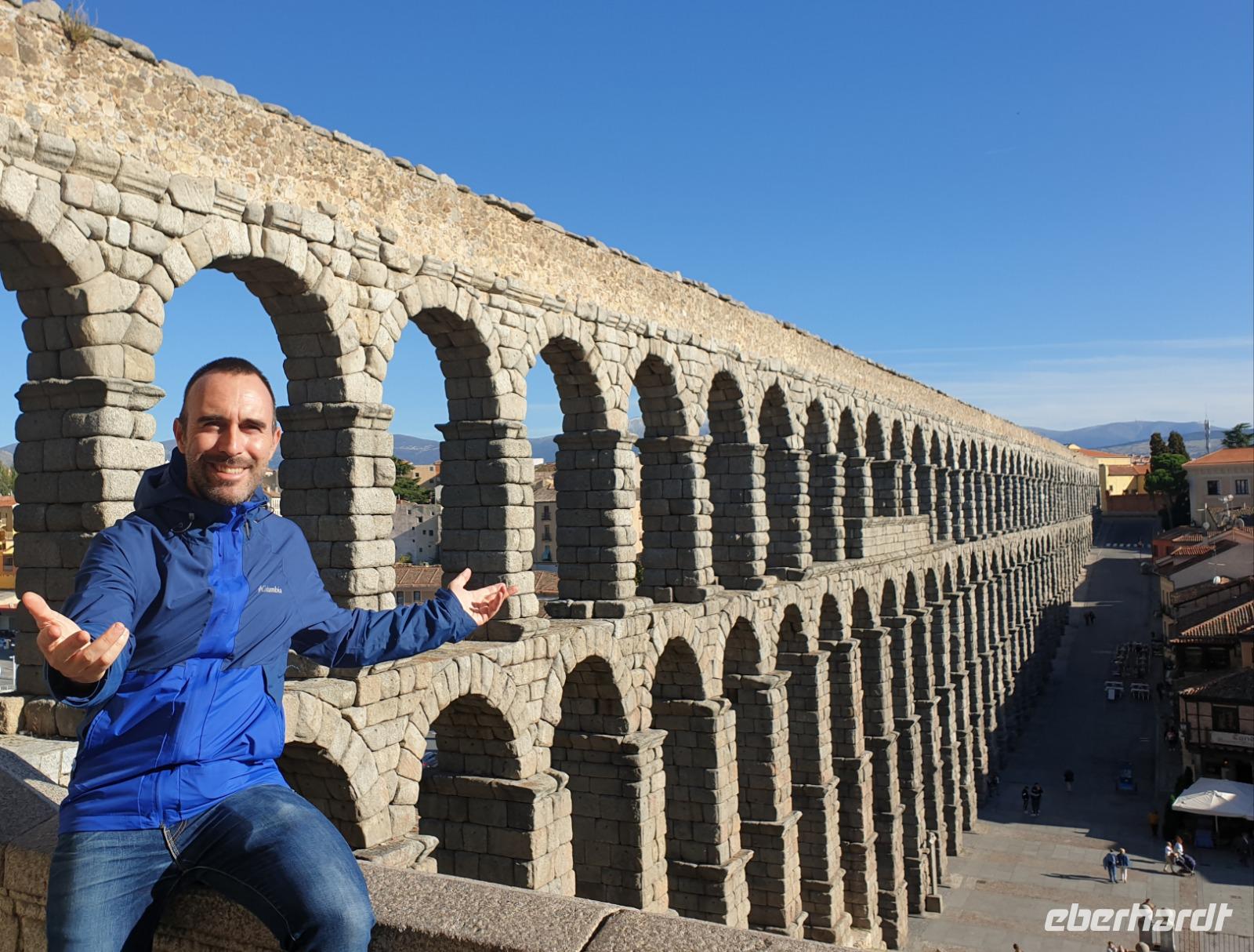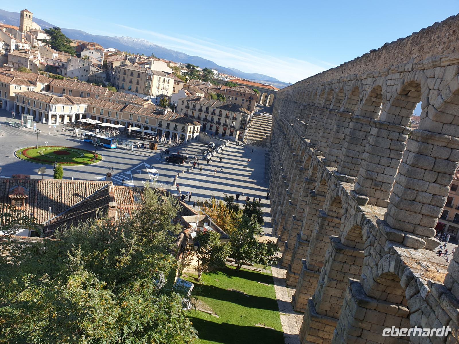Mittags fahren Sie weiter in die Stadt Segovia, die insbesondere für ihre zahlreichen Kirchen aus romanischer Zeit Berühmtheit genießt. Wir spazieren durch Segovia mit den Bergen im Hintergrund. Wir besuchen die Alcazar oder Befestigung. Zu Beginn eines jeden Walt-Disney-Films ist am Anfang ein Schloss zu sehen. Walt Disney hat sich dafür von zwei Schlössern auf der Welt inspirieren lassen - dem bayrischen Schloss Neunschwanstein und dem Alcazar von Segovia, welche uns sehr gut gefallen hat mit ihren Türmen und verschieden Räumen und Dächern. Vorhin haben wir auch die Kathedrale gesehen, die nicht so groß ist wie die von Toledo, aber auch wunderschön. Die Sonne scheint und ist herrlich, aber in der Kathedrale und ihrem Kloster ist angenehmen kühl. Segovia gefällt uns sehr, aber als besonderer Höhepunkt gilt das über 28 Meter hohe antike römische Aquädukt. Majestätisch erhebt sich dieser eindrucksvolle Bau inmitten der Stadt und durchläuft diese auf 700 Meter Länge. Zum Mittagessen konnte man die berühmte Spezialität Cochinillo (Ferkel) essen. Andere von uns aßen ein Menü mit Vorspeise, Hauptspeise, Brot, Wein, Nachtisch und Kaffee... für nur 11 Euro! Und es hat gut geschmeckt. Am Nachmittag kehrten wir zurück nach Madrid und genossen auf der Rückfahrt den Blick auf die frische schneebedeckten Berge. Zurück nach Madrid fuhren wir über die Berge und checkten in unserem, am Rand des Zentrums von Madrid gelegenen, 4-Sterne-Hotel Ganivet in Puerta de Toledo ein, wo wir die nächsten 4 Nächte schlafen werden.