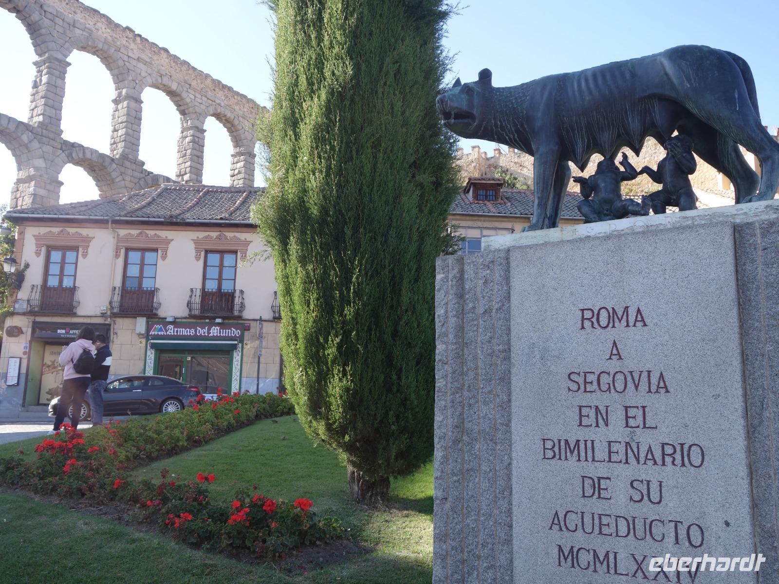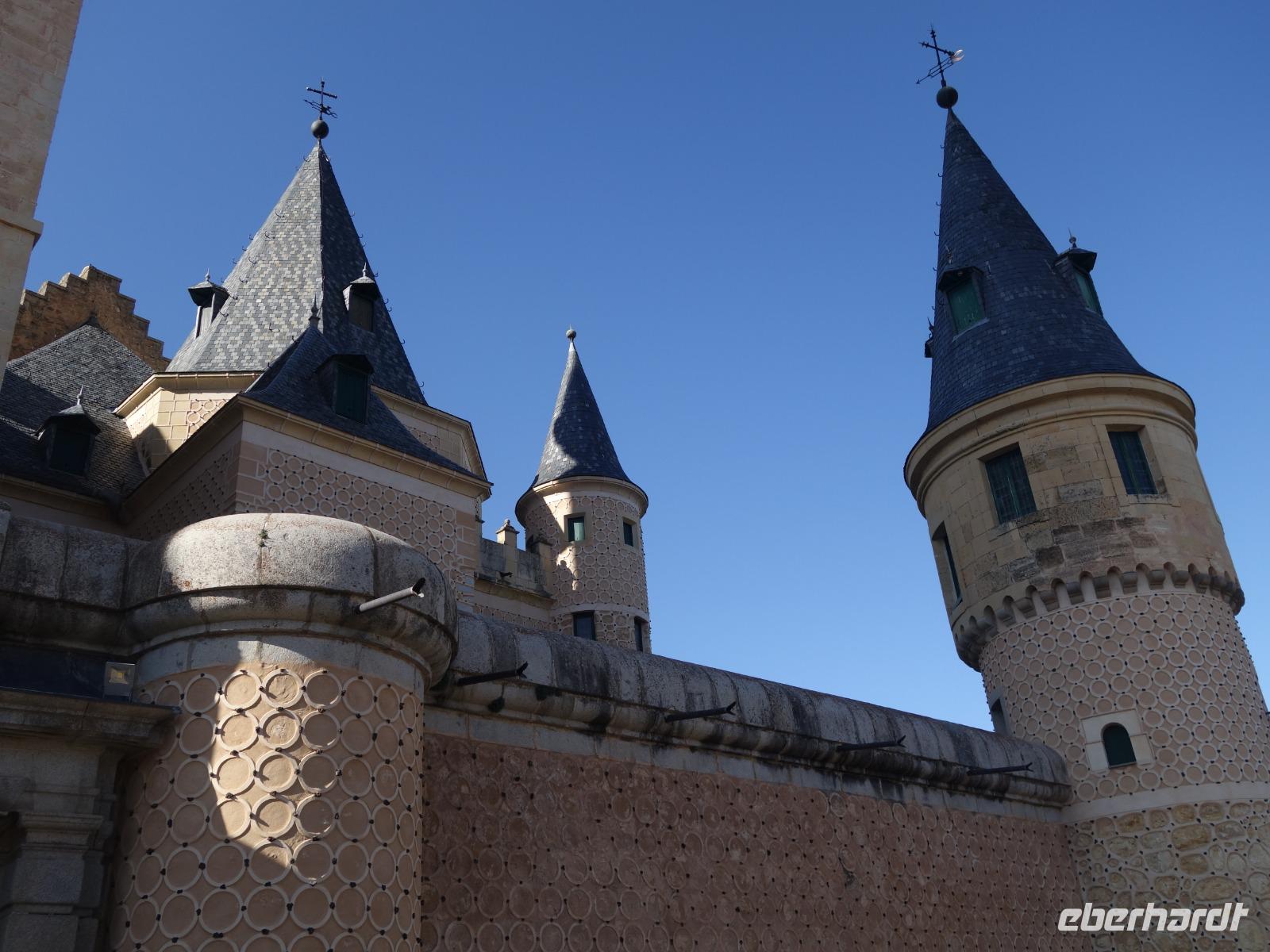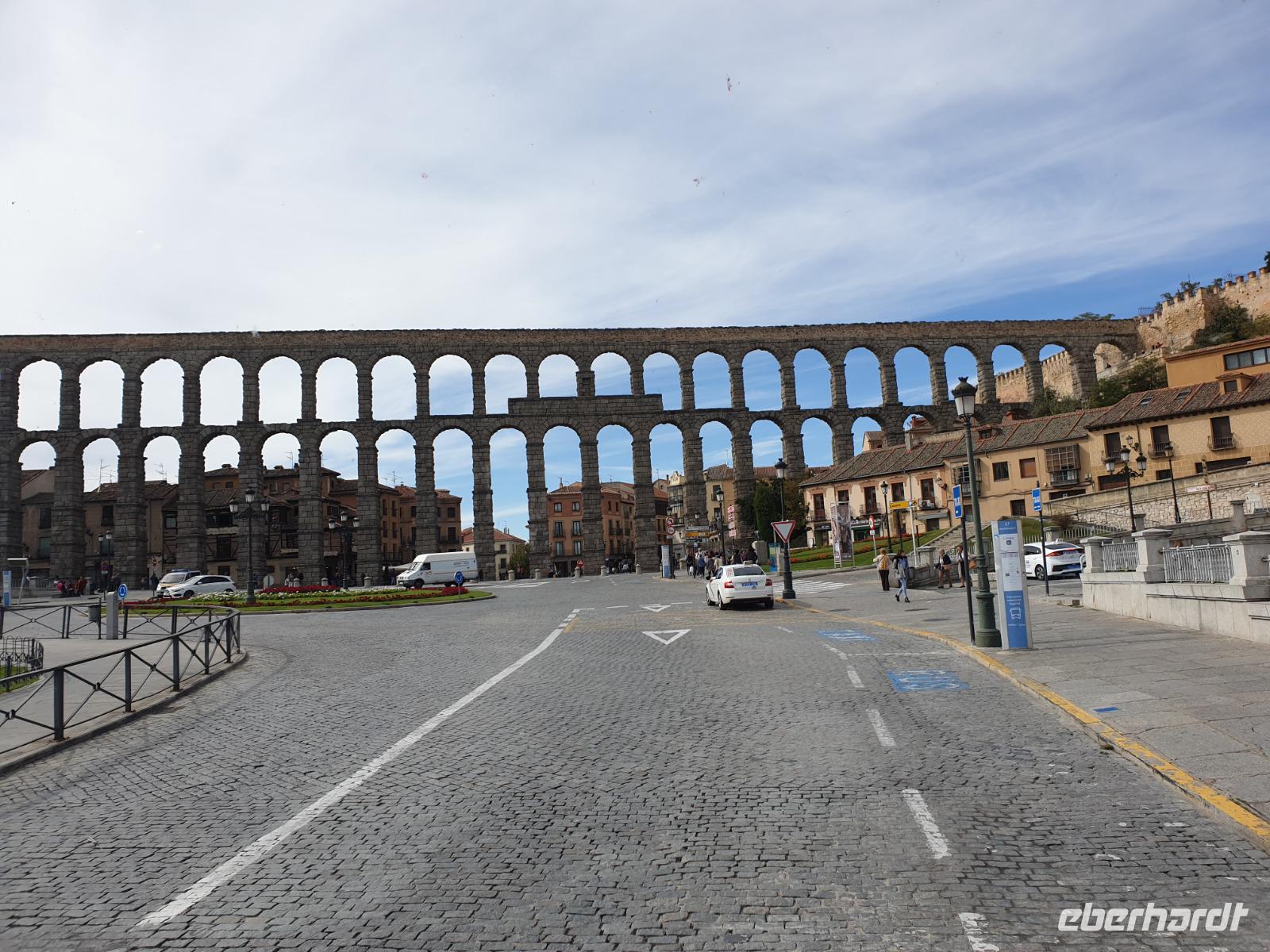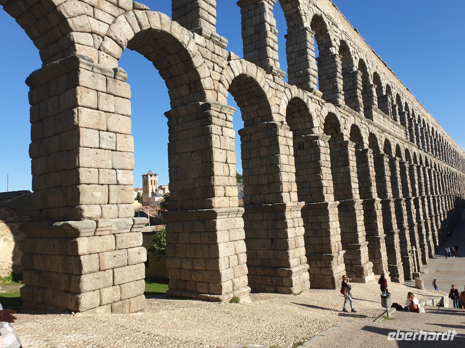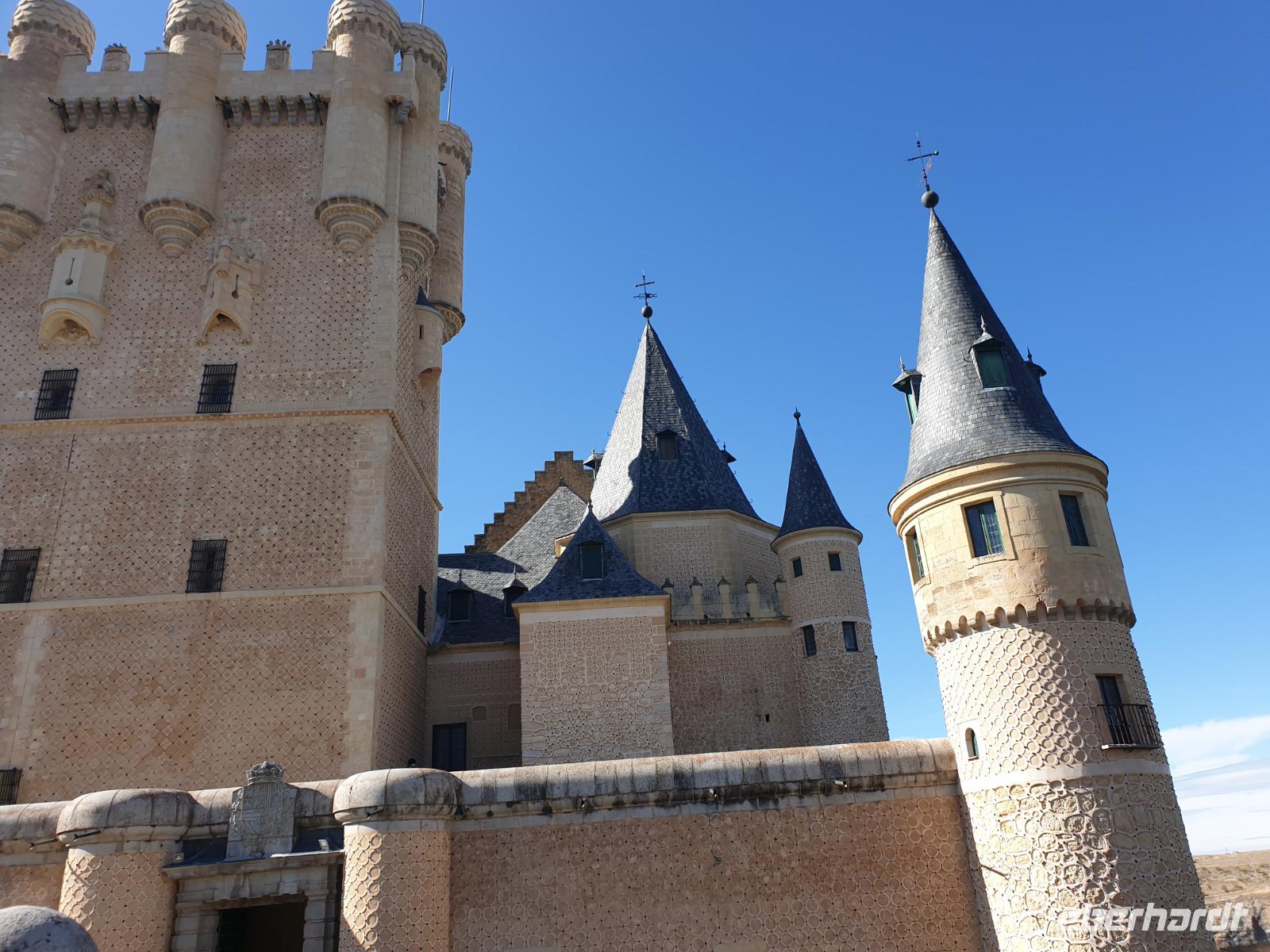 Mittags fahren Sie weiter in die Stadt Segovia, die insbesondere für ihre zahlreichen Kirchen aus romanischer Zeit Berühmtheit genießt. Wir spazieren durch Segovia mit den Bergen im Hintergrund. Wir besuchen die Alcazar oder Befestigung. Zu Beginn eines jeden Walt-Disney-Films ist am Anfang ein Schloss zu sehen. Walt Disney hat sich dafür von zwei Schlössern auf der Welt inspirieren lassen - dem bayrischen Schloss Neunschwanstein und dem Alcazar von Segovia, welche uns sehr gut gefallen hat mit ihren Türmen und verschieden Räumen und Dächern. Vorhin haben wir auch die Kathedrale gesehen, die nicht so groß ist wie die von Toledo, aber auch wunderschön. Die Sonne scheint und ist herrlich, aber in der Kathedrale und ihrem Kloster ist angenehmen kühl. Segovia gefällt uns sehr, aber als besonderer Höhepunkt gilt das über 28 Meter hohe antike römische Aquädukt. Majestätisch erhebt sich dieser eindrucksvolle Bau inmitten der Stadt und durchläuft diese auf 700 Meter Länge. Zum Mittagessen konnte man die berühmte Spezialität Cochinillo (Ferkel) essen. Andere von uns aßen ein Menü mit Vorspeise, Hauptspeise, Brot, Wein, Nachtisch und Kaffee... für nur 11 Euro! Und es hat gut geschmeckt. Am Nachmittag kehrten wir zurück nach Madrid und genossen auf der Rückfahrt den Blick auf die frische schneebedeckten Berge. Zurück nach Madrid fuhren wir über die Berge und checkten in unserem, am Rand des Zentrums von Madrid gelegenen, 4-Sterne-Hotel Ganivet in Puerta de Toledo ein, wo wir die nächsten 4 Nächte schlafen werden.