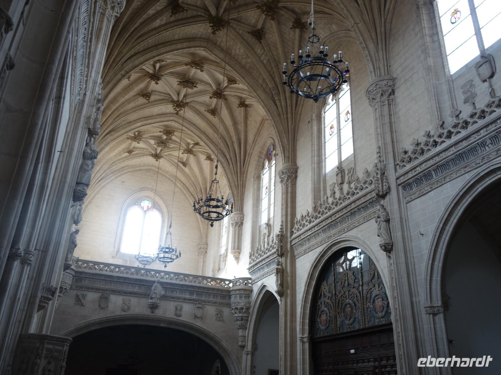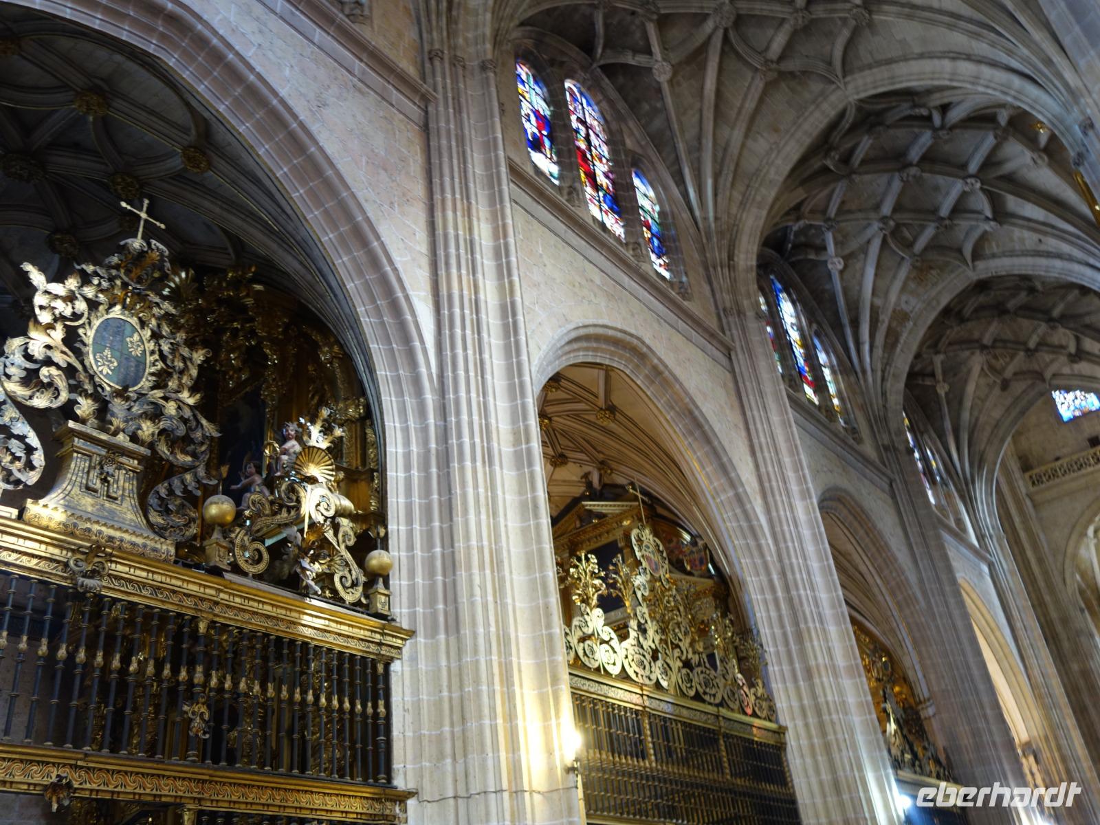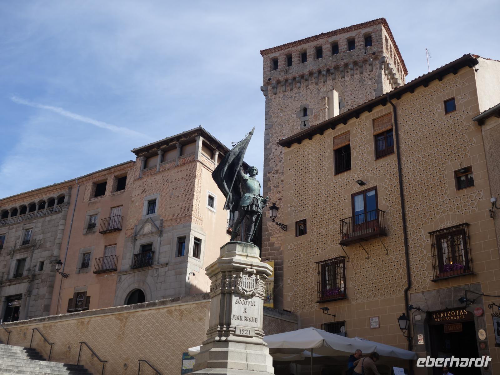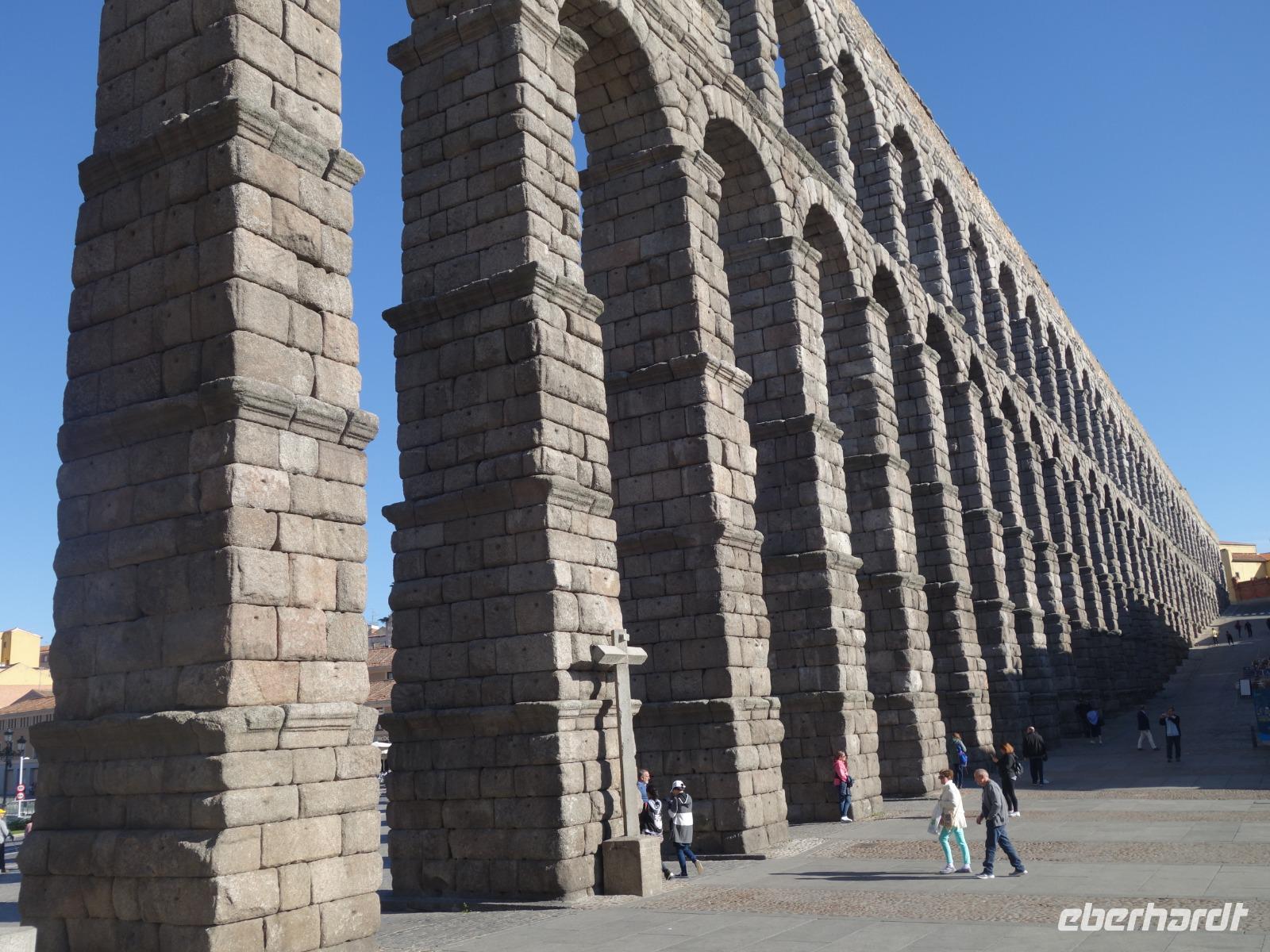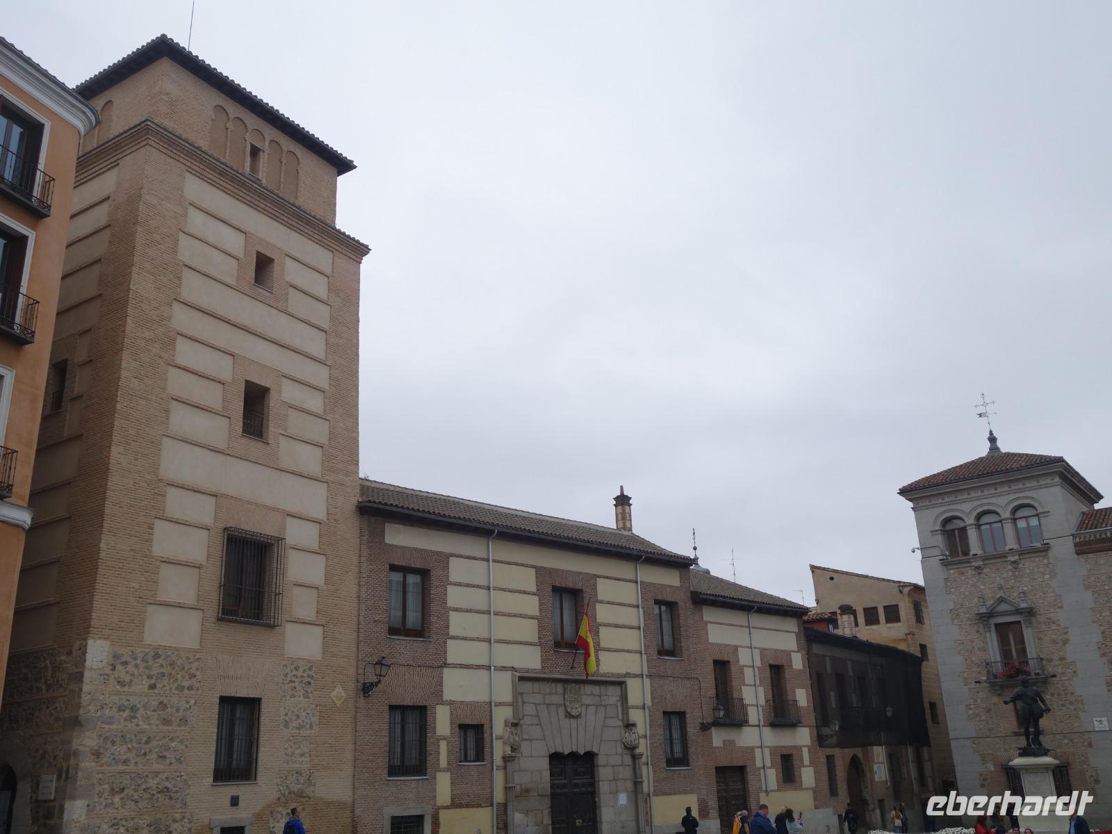 Mittags fahren Sie weiter in die Stadt Segovia, die insbesondere für ihre zahlreichen Kirchen aus romanischer Zeit Berühmtheit genießt. Wir spazieren durch Segovia mit den Bergen im Hintergrund. Wir besuchen die Alcazar oder Befestigung. Zu Beginn eines jeden Walt-Disney-Films ist am Anfang ein Schloss zu sehen. Walt Disney hat sich dafür von zwei Schlössern auf der Welt inspirieren lassen - dem bayrischen Schloss Neunschwanstein und dem Alcazar von Segovia, welche uns sehr gut gefallen hat mit ihren Türmen und verschieden Räumen und Dächern. Vorhin haben wir auch die Kathedrale gesehen, die nicht so groß ist wie die von Toledo, aber auch wunderschön. Die Sonne scheint und ist herrlich, aber in der Kathedrale und ihrem Kloster ist angenehmen kühl. Segovia gefällt uns sehr, aber als besonderer Höhepunkt gilt das über 28 Meter hohe antike römische Aquädukt. Majestätisch erhebt sich dieser eindrucksvolle Bau inmitten der Stadt und durchläuft diese auf 700 Meter Länge. Zum Mittagessen konnte man die berühmte Spezialität Cochinillo (Ferkel) essen. Andere von uns aßen ein Menü mit Vorspeise, Hauptspeise, Brot, Wein, Nachtisch und Kaffee... für nur 11 Euro! Und es hat gut geschmeckt. Am Nachmittag kehrten wir zurück nach Madrid und genossen auf der Rückfahrt den Blick auf die frische schneebedeckten Berge. Zurück nach Madrid fuhren wir über die Berge und checkten in unserem, am Rand des Zentrums von Madrid gelegenen, 4-Sterne-Hotel Ganivet in Puerta de Toledo ein, wo wir die nächsten 4 Nächte schlafen werden.