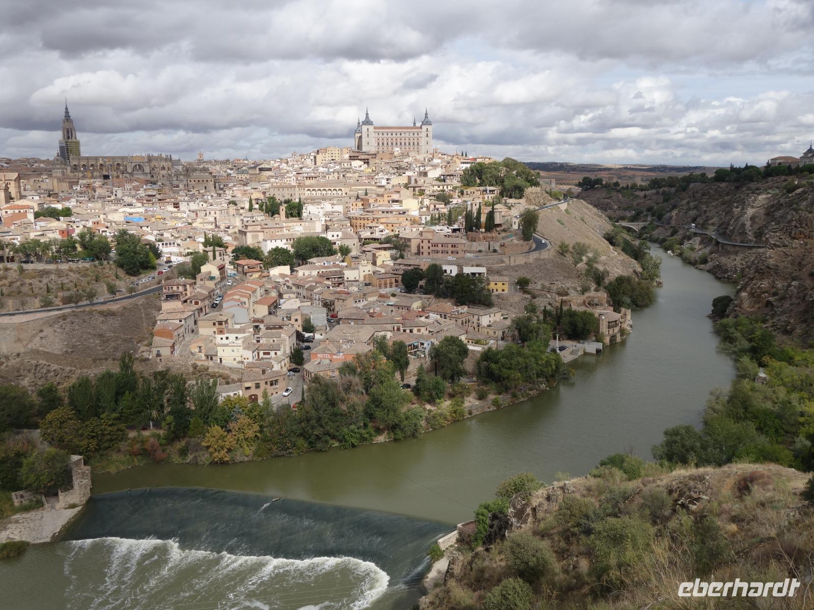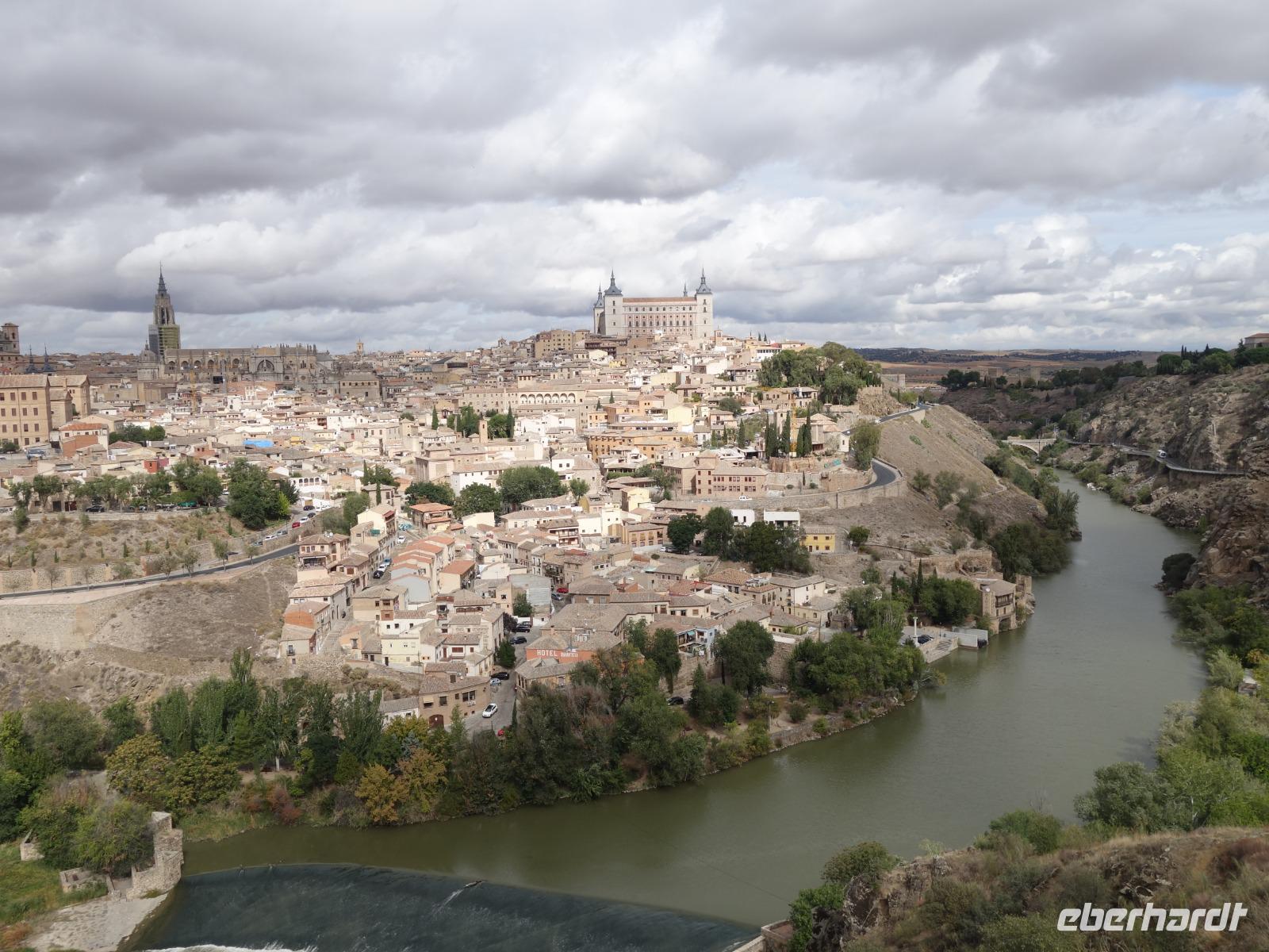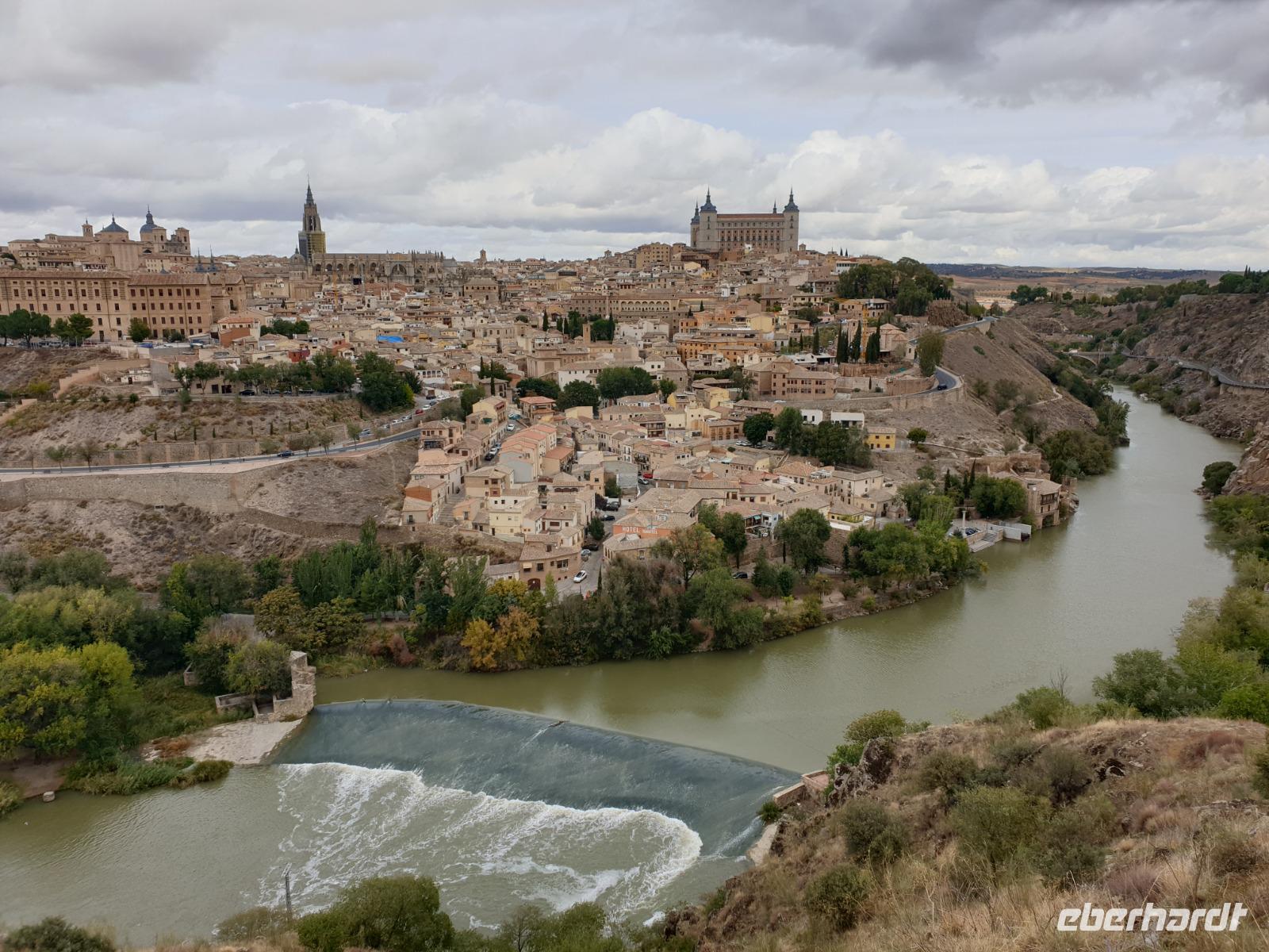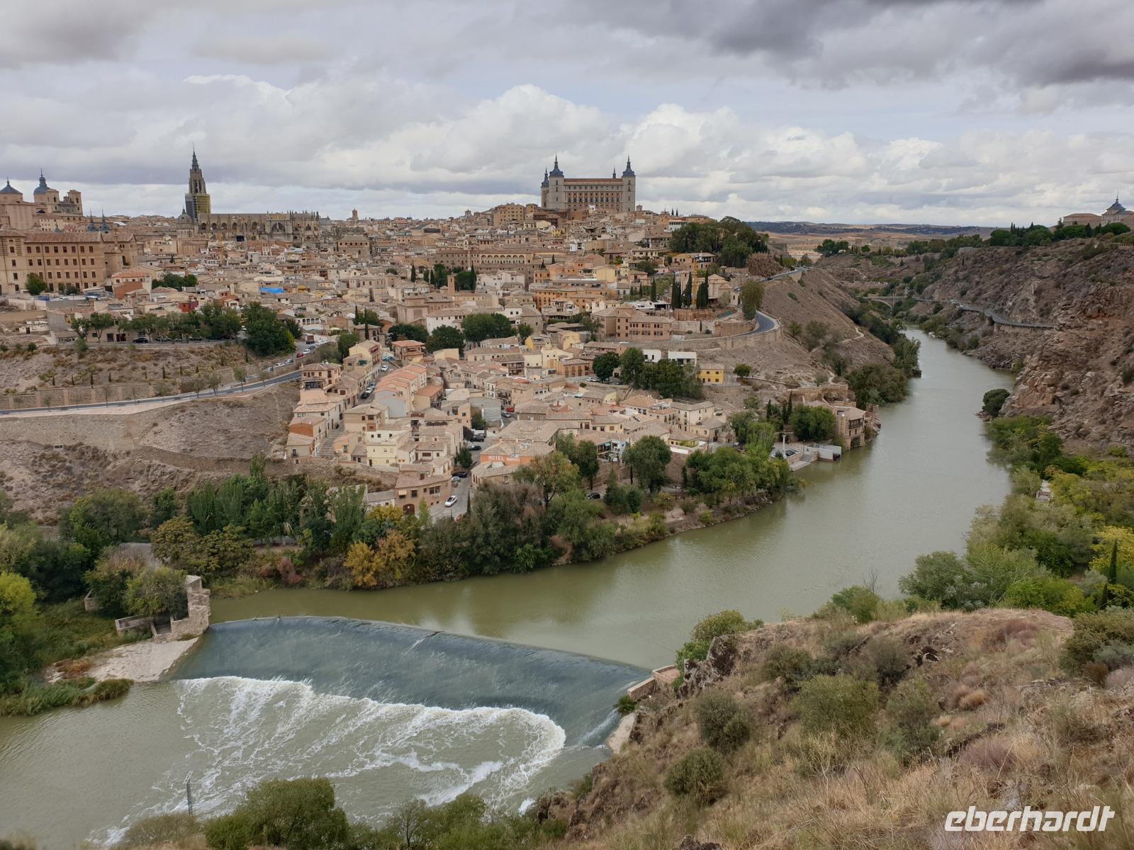 Im Anschluss an die Besichtigung fahren wir weiter zur eindrucksvollen Stadt Toledo. Wir freuen uns alle darauf. Viele haben viel über Toledo und El Greco gelesen und wollen dies endlich auch vor Ort selbst erkunden. Die prächtige historische Metropole thront hoch über dem Ufer des Tajo, der sich an dieser Stelle tief in das Hochland eingeschnitten hat. Um diesen einmaligen Blick zu haben, fuhren wir erstmal außerhalb Toledos, wo wir diesen Panorama Blick genießen konnten.