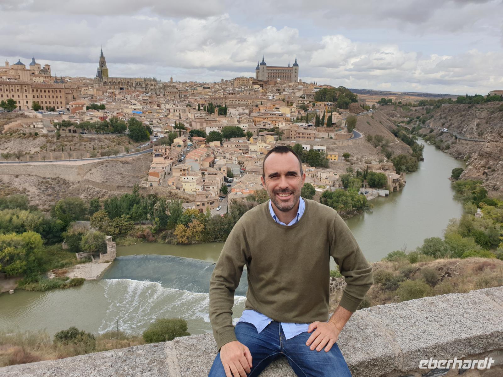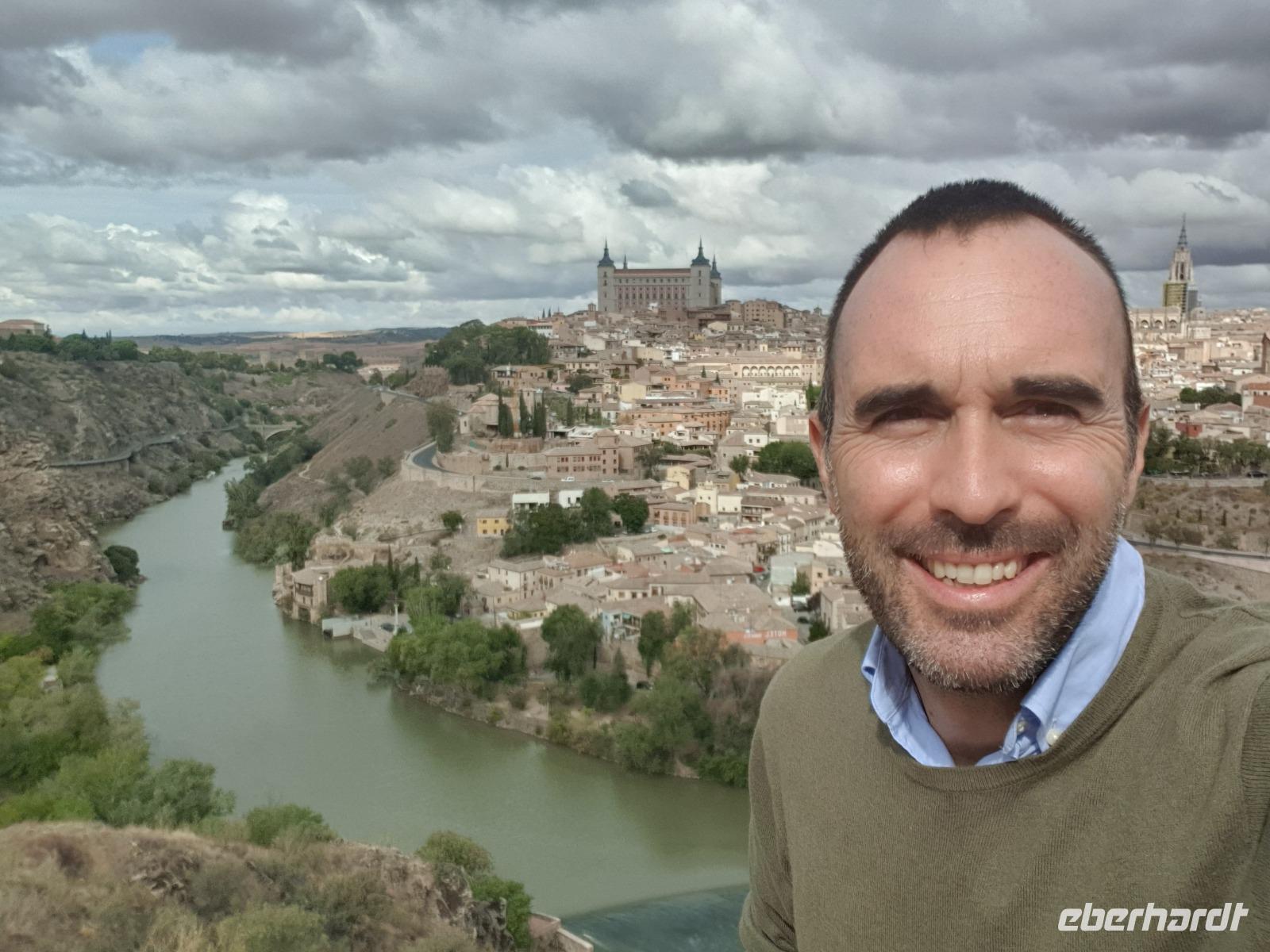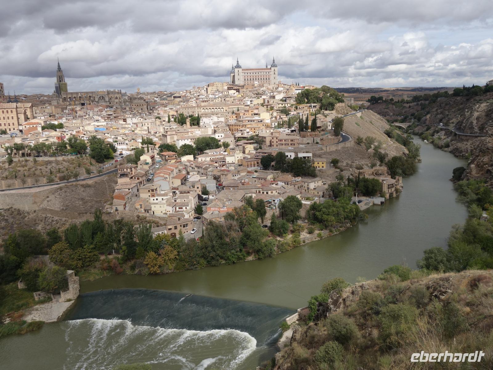 Im Anschluss an die Besichtigung fahren wir weiter zur eindrucksvollen Stadt Toledo. Wir freuen uns alle darauf. Viele haben viel über Toledo und El Greco gelesen und wollen dies endlich auch vor Ort selbst erkunden. Die prächtige historische Metropole thront hoch über dem Ufer des Tajo, der sich an dieser Stelle tief in das Hochland eingeschnitten hat. Um diesen einmaligen Blick zu haben, fuhren wir erstmal außerhalb Toledos, wo wir diesen Panorama Blick genießen konnten.