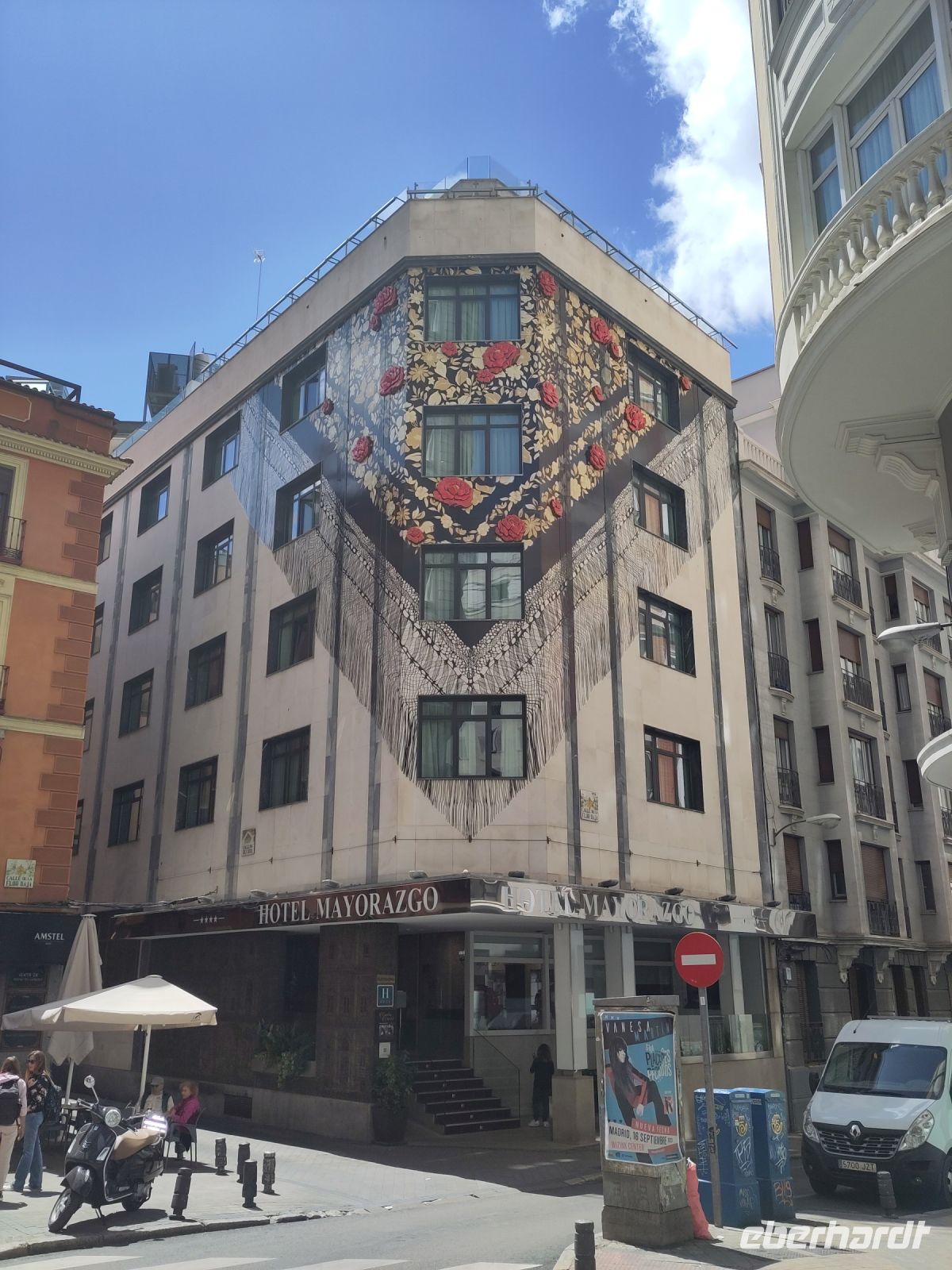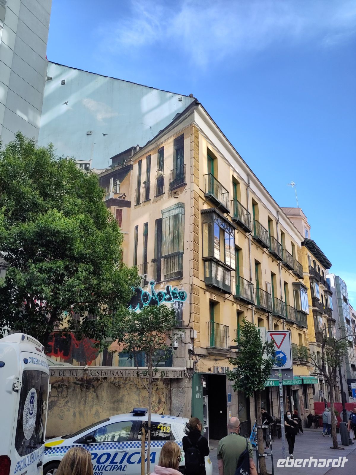 Chema kann uns leider nicht bis direkt vors Hotel bringen und da er nicht links abbiegen darf, machen wir noch eine Ehrenrunde über die Gran Vía, dann können wir an der Plaza de España aussteigen und zum Hotel laufen. Die ersten sind schon an der Rezeption, andere noch draußen an der Rampe, als draußen plötzlich Geschrei ertönt. Ein junges Pärchen Taschendiebe hatte sich zwischen zwei Mitreisende gedrängt, um an einen Rucksack zu gelangen, durch das Rufen werden sie aber erfolgreich vertrieben.