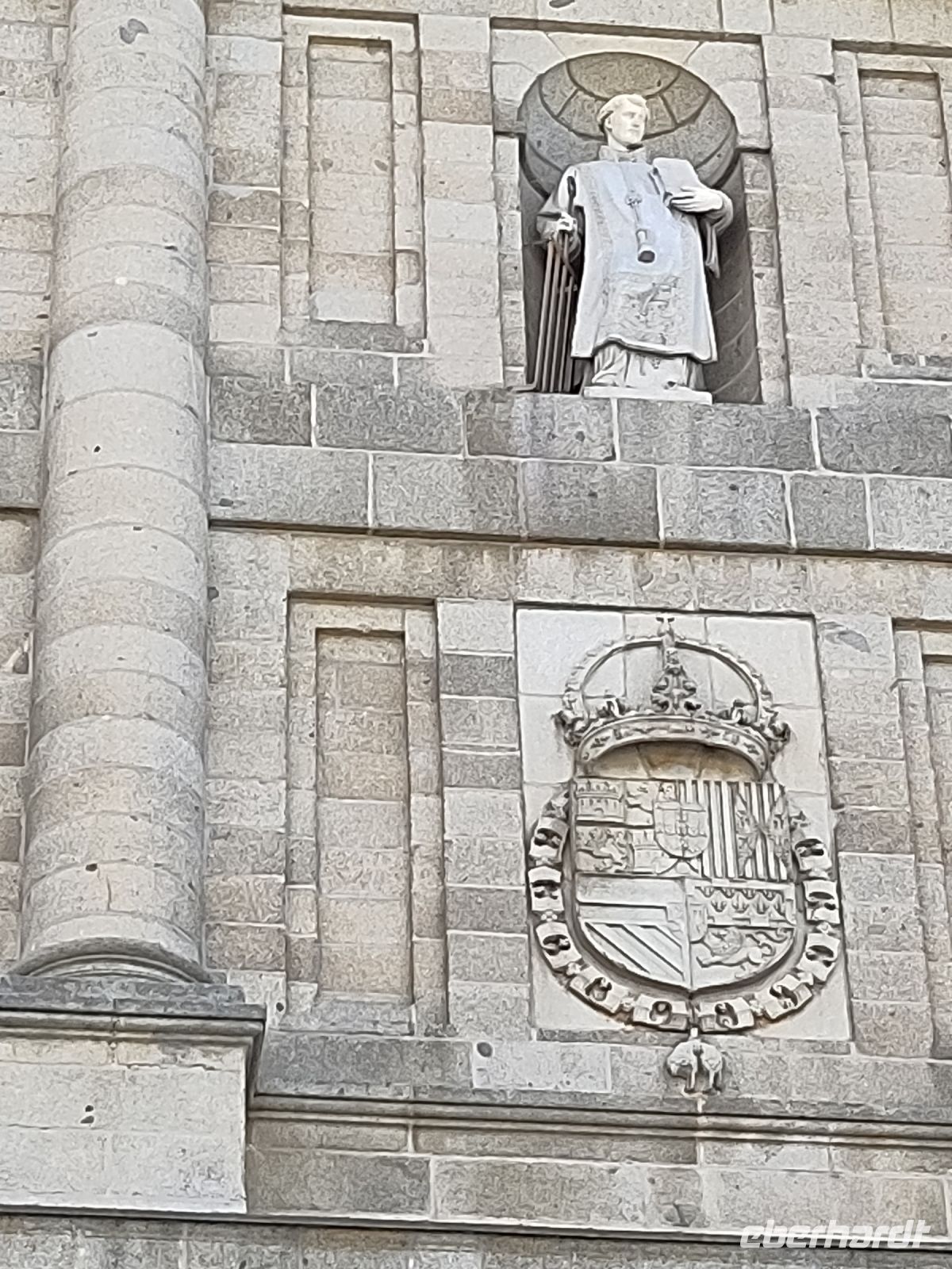 Marta erklärt uns auf dem Klostervorplatz ein wenig die Statue des Heiligen Lorenzo mit seinem Grillrost. Die Legende überliefert, dass er zu den römischen Soldaten, die ihn auf dem Grillrost zu Tode marterten, sagte, dass er auf der einen Seite schon gut „durch“ sei, ob sie ihn nicht wenden könnten. Dann betreten wir den Palast.
