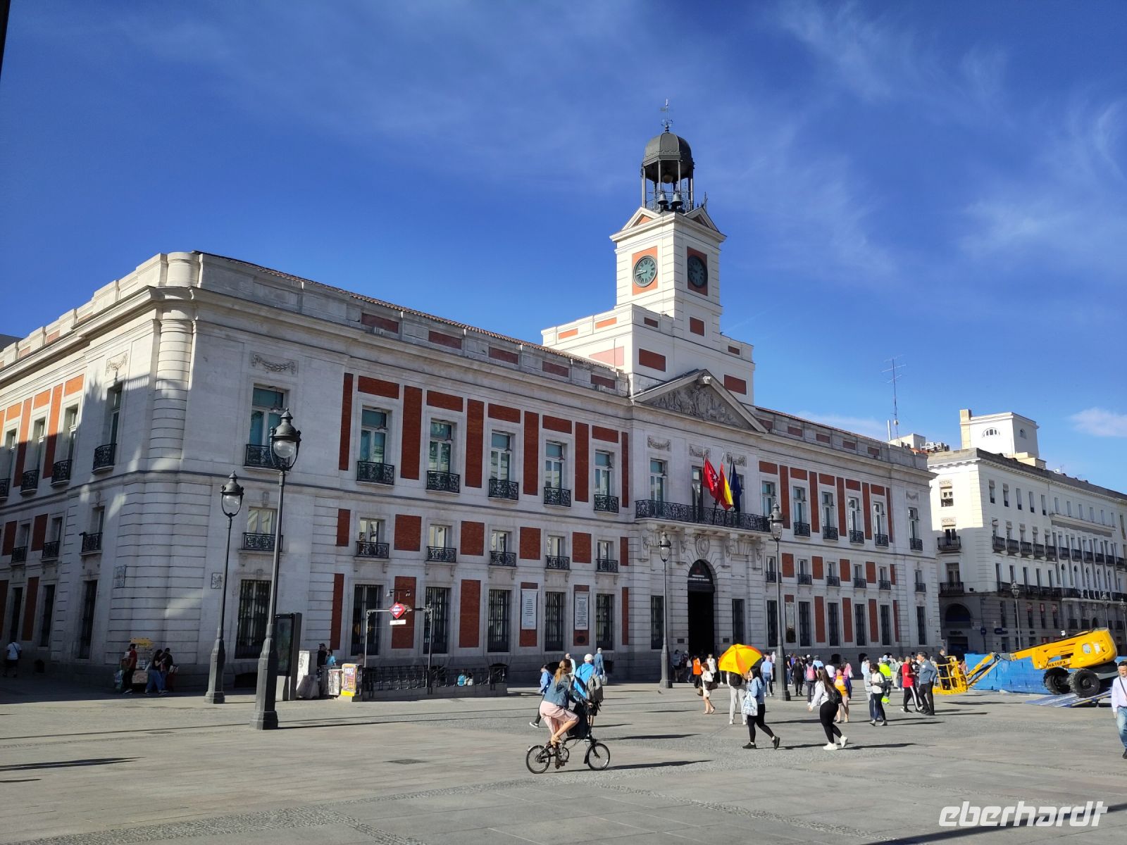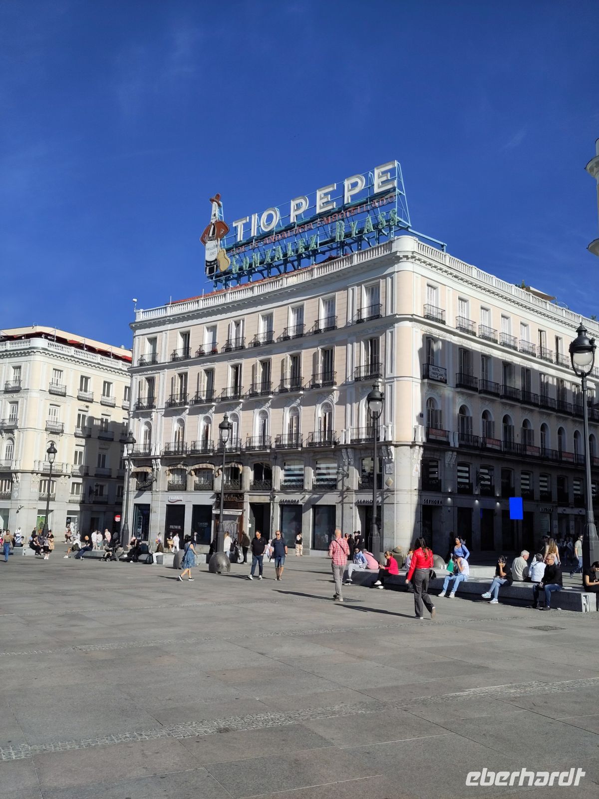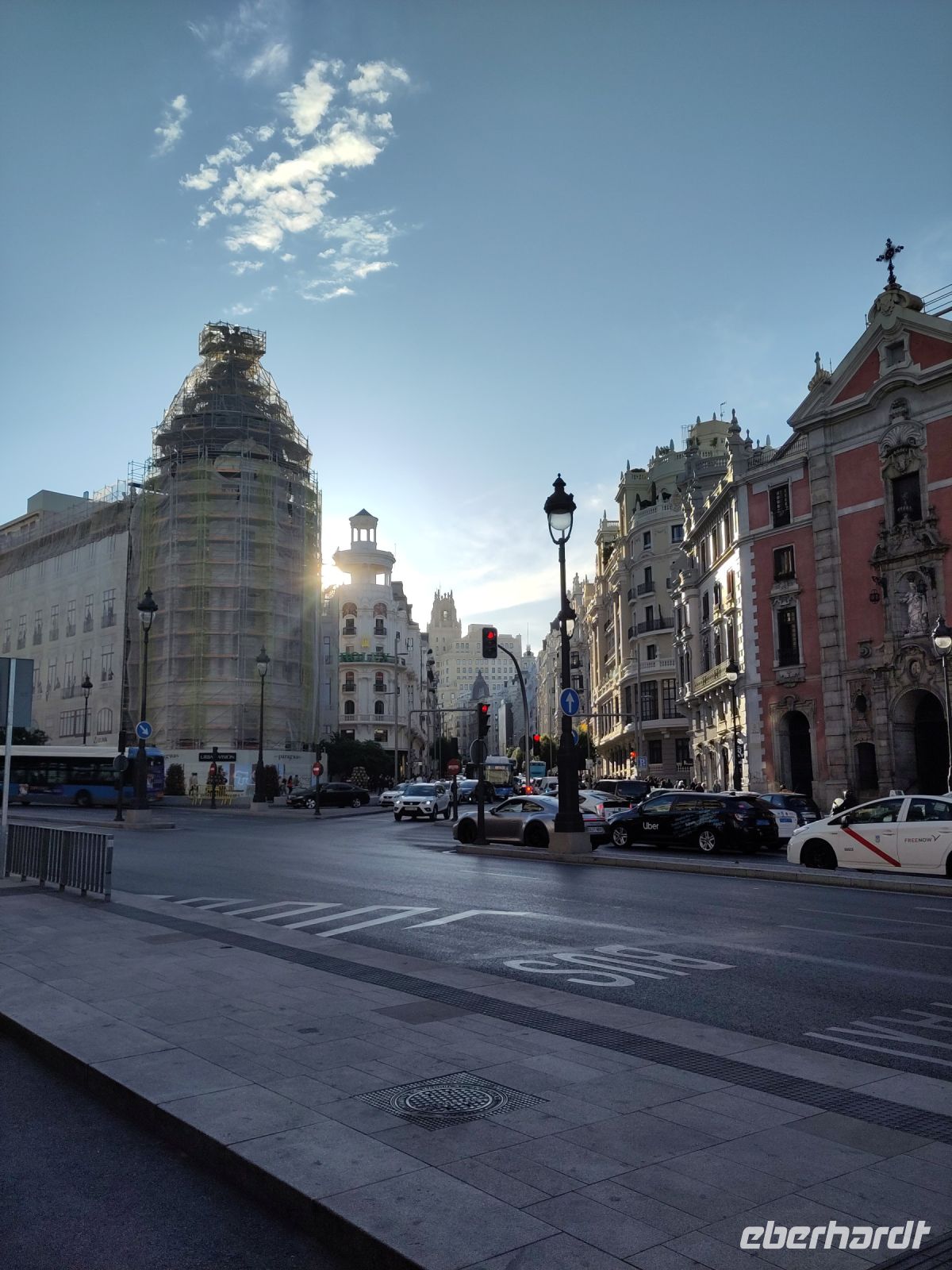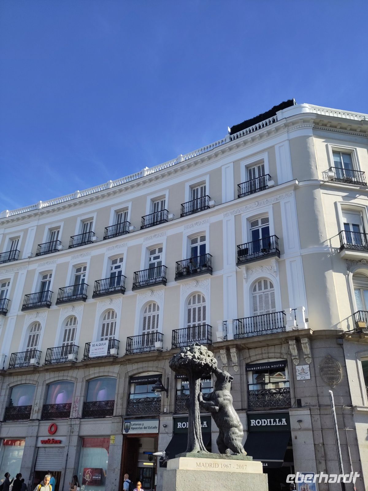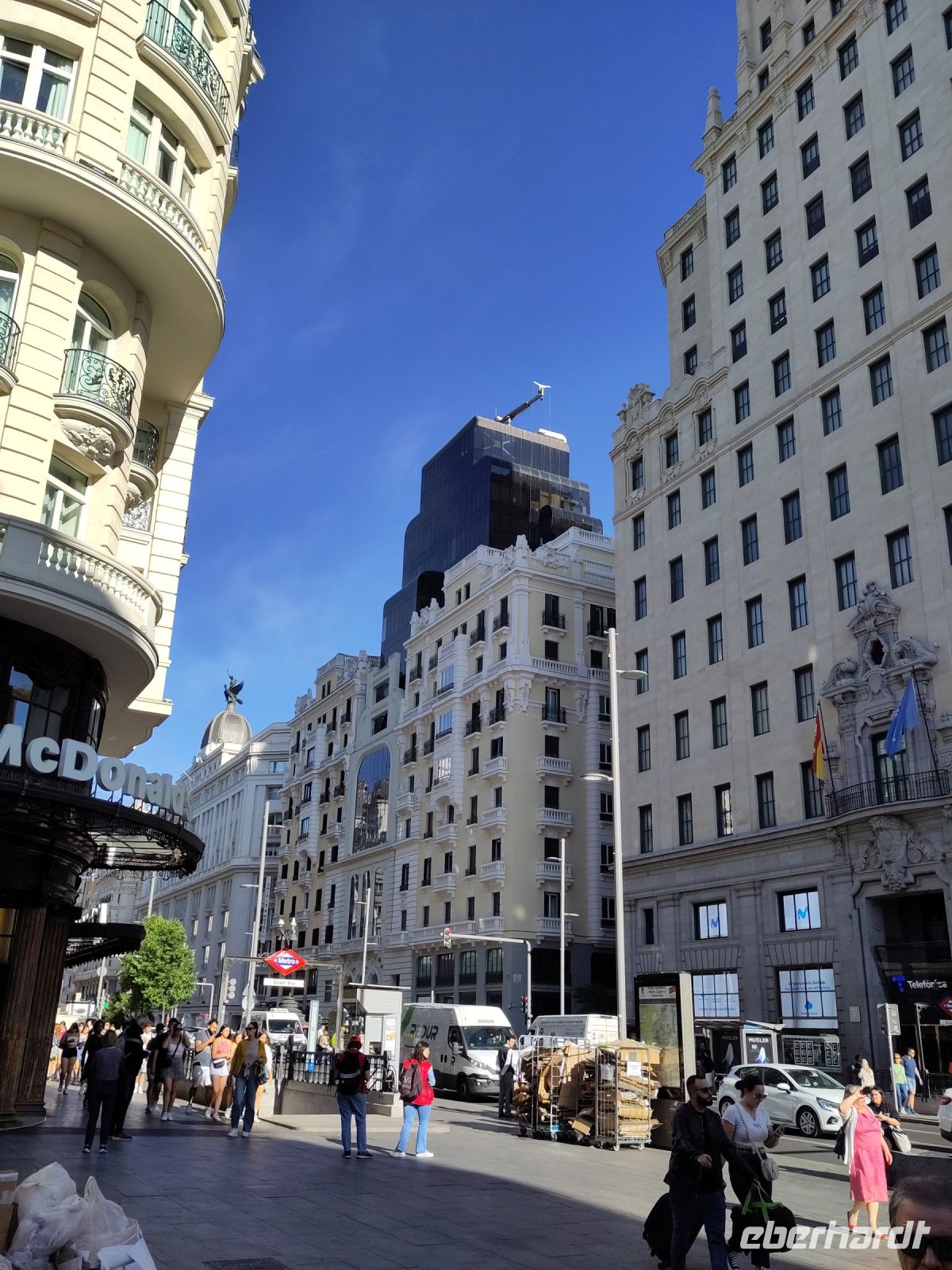 Beim Edificio Telefónica, seinerzeit mit 89 m das höchste Gebäude Madrids (1929 - 1953), der erste Wolkenkratzer Madrids, der zweite Spaniens, im spanischen Bürgerkrieg Aussichtsturm für das Oberkommando Madrids und die internationale Presse, biegen wir nach Süden ab. Unser Ziel ist die Puerta de Sol bzw. der nach diesem nicht mehr existenten Stadttor benannte Platz, der eben zur verkehrsberuhigten Zone umgestaltet wird. Kurios, dass auf einem nun autofreien Platz der Nullpunkt der wichtigsten spanischen Autobahnen liegt. Was hier fehlt, kritisiert Thomas, sind schattenspendene Bäume und feuchtigskeitsspendende Begrünung.