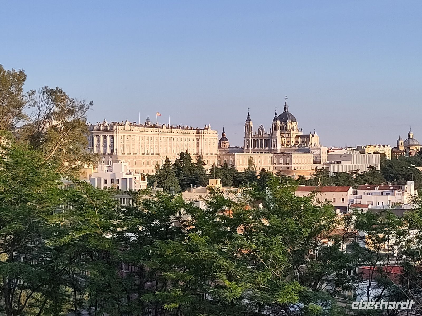 Weiter geht es in Richtung der Plaza Mayor, wo schon alles für die Feierlichkeiten zu Madrids Stadtheiligen San Isidro Labrador (nicht zu verwechseln mit dem berühmteren Isidor von Sevilla) vorbereitet wird, so wird die schönste Fassade, die der Casa de Panaderos, durch eine Bühne verdeckt. Weiter geht es am ehemaligen Mercado de San Miguel vorbei - wo man sich heute ganz dem Tapeo widmen kann, dem Tapas essen - an Bausünden der Siebziger Jahre und einem Nonnenkonvent entlang zum ehemaligen Rathaus. Von hier aus ziehengen wir weiter zur Almudena-Kathedrale und dem Residenzschloss der spanischen Könige in Madrid (von der spanischen Königsfamilie seit 1931 nicht mehr als Residenz benutzt, auch nach 1975, bei der Wiedereinsetzung der Monarchie nicht). Zur Almudena-Kathedrale erzählt uns Thomas die Legende von der Statue der Almudena, die von den Bewohnern Madrids vor den heranrückenden Mauren in der Mauer versteckt worden sei. Als Madrid im 11. Jhdt. von den Christen erobert wurde, haben die christlichen Soldaten in der Nacht um die Wiederauffindung der Statue gebetet. Da sei die Mauer, welche die Nische, in der die Statue versteckt gewesen sei, verblendete, heruntergebröckelt und habe die Ansicht auf die Statue freigegeben. Aber natürlich wissen wir, dass Almudena ein arabisches Wort ist, al-Mudayna ist die Verkleinerungsform von al-Madina, ‚Stadt‘, und können so die Geschichte leicht ins Reich der Legende verweisen.