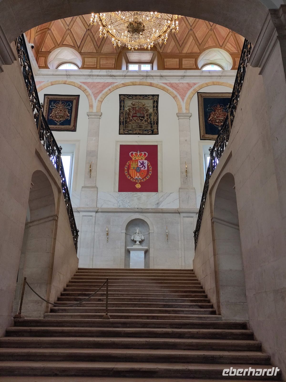 Jetzt betreten wir aber den Palast. Die Sorolla-Ausstellung, die hier gerade stattfindet, ist in einem Teil, den wir nicht besichtigen werden. Wir sehen die Staatsgemächer. U.a. den Saal, in dem der EU- und der NATO-Beitritt Spaniens unterzeichnet wurden, der Tisch, mit den Edelsteineinlegearbeiten auf vier Sphinxen, ganz nach dem Geschmack des 19. Jhdts., auf dem die Verträge unterzeichnet wurden, steht in einem anderen Raum, aber wir sehen ihn auch. Auch die ausladende spanische Krone sehen wir, aber sie wird von keinem König mehr getragen (ist sowieso viel zu überdimensioniert für einen Kopf); anders, als der englische König wird der spanische König nicht gekrönt, sondern ernannt. Die Krone kommt nur als Sargschmuck als Requisit in den Einsatz. Der daneben liegende Zepter ist auch viel mehr wert, als das vergoldete, überdimensionierte Blechkrönchen. Über einen Koh-i-Noor verfügt Spanien auch nicht.