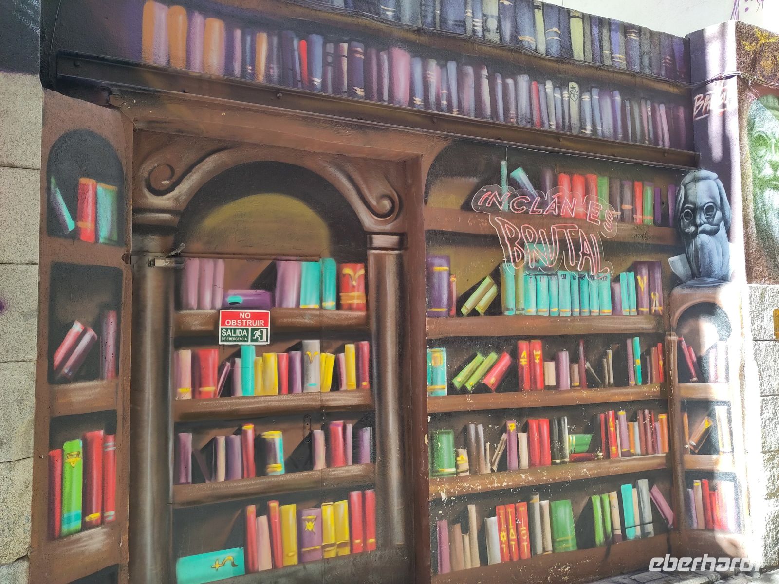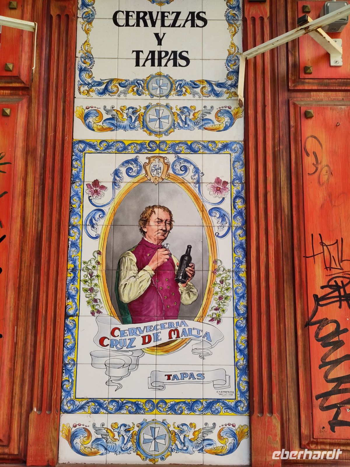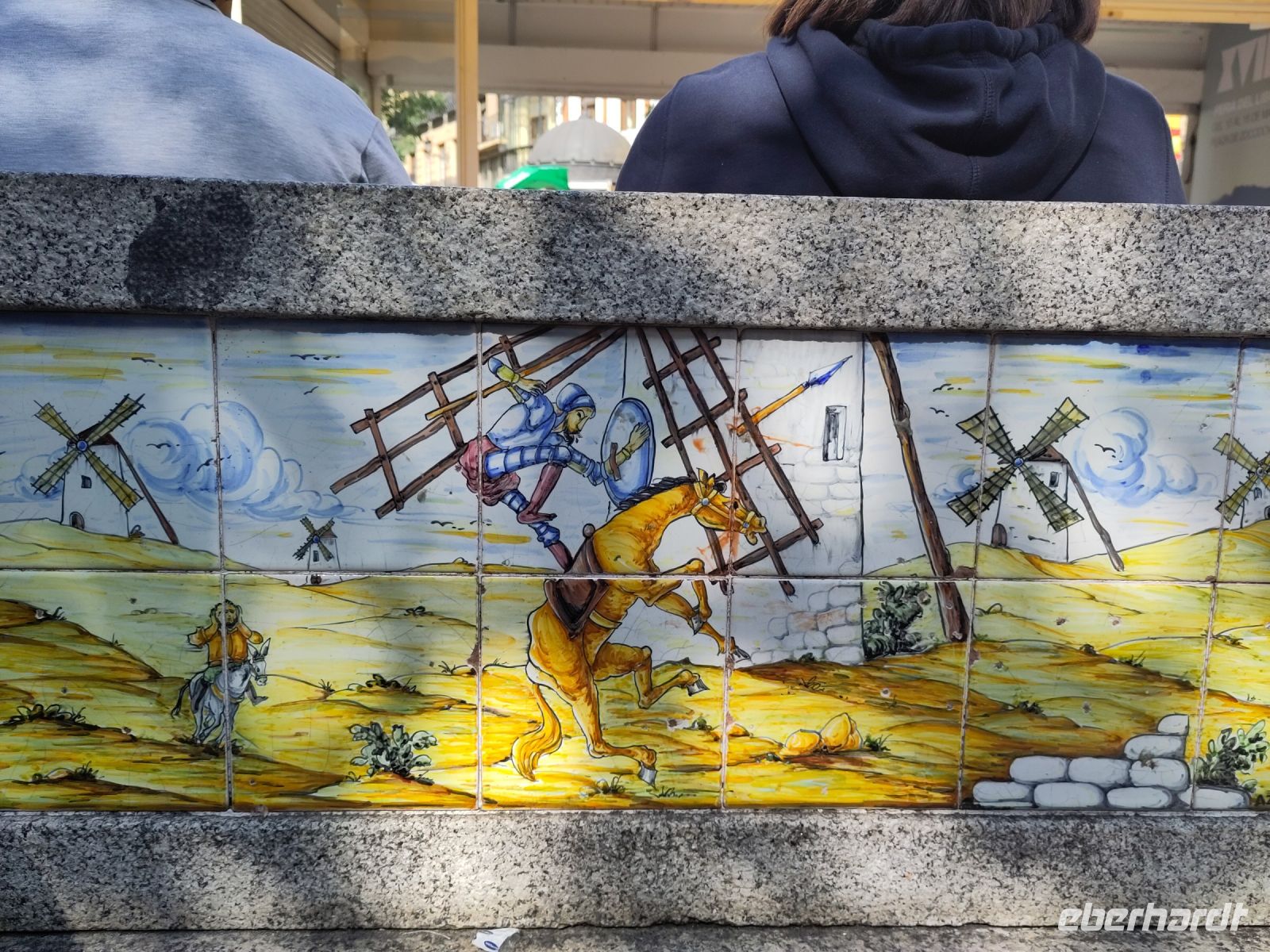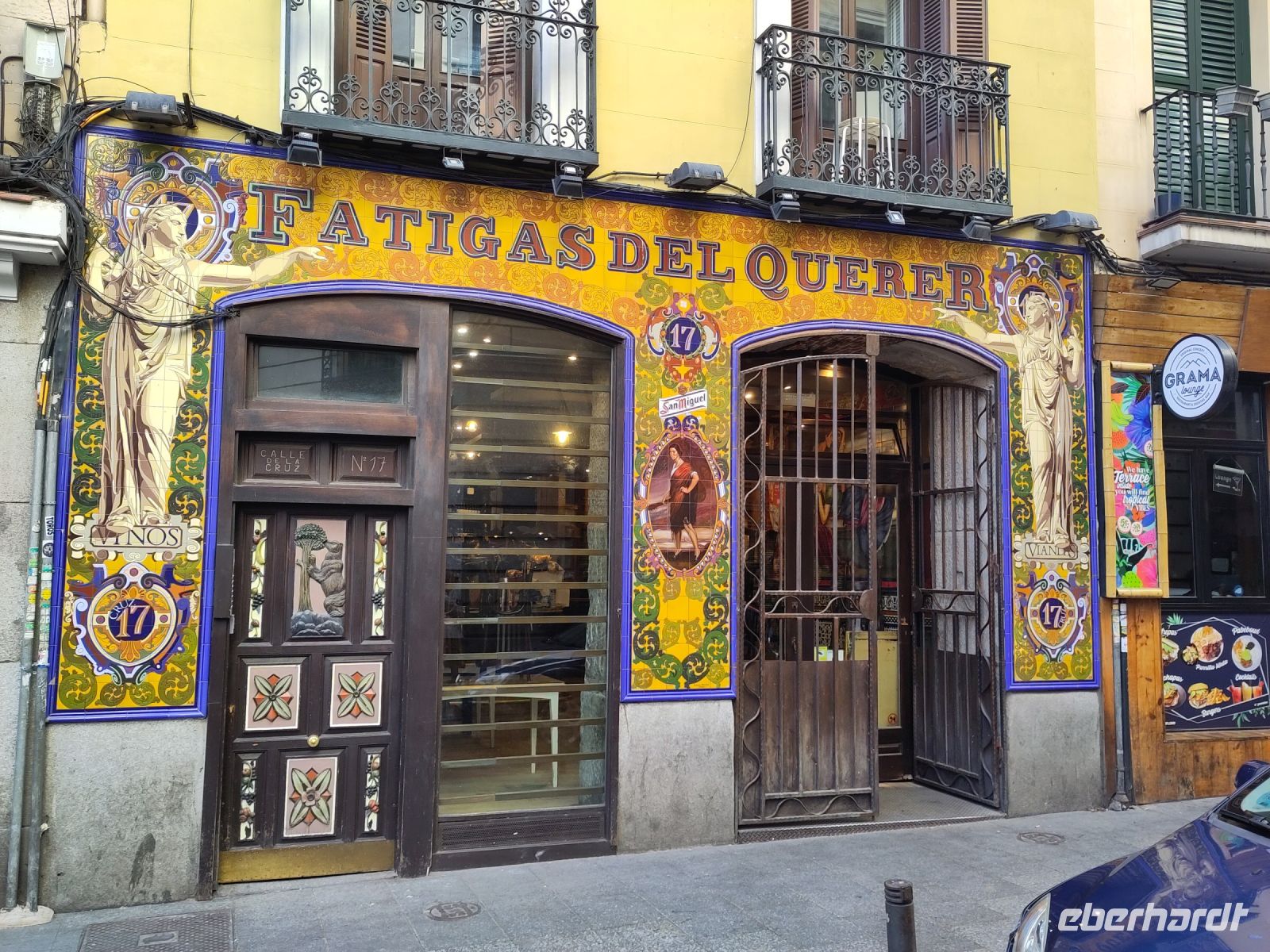 Thomas führt uns ins Barrio de Letras, ins Schriftsteller und Theaterviertel und freut sich an der Plaza de Santa Ana, an deren Kopfende das Teatro Español liegt, dass Lope de Vega, Quevedo und Góngora keine Unbekannten sind. Jeden Tag, so berichtet er, verlangte das Theaterpublikum von Madrid ein neues Stück. Das 17. Jhdt. scheint eine gute Zeit für Dramaturgen und Schauspieler gewesen zu sein. Hier, im Barrio de Letras lassen sich die bunt gekachelten Geschäfte und vor allem Bars bewundern.