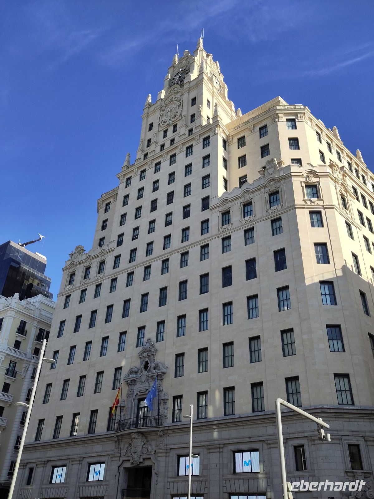 Unser örtlicher Reiseleiter ist Thomas, ein Kunsthistoriker, der in Spanien und Deutschland studiert hat und dann nach Spanien übergesiedelt ist. Thomas, der uns die nächsten zwei Tage begleiten wird, führt uns zunächst die Gran Vía hoch. Er macht uns darauf aufmerksam, wie die verschiedenen Baustile das Bild der Gran Vía prägen, Empire wechselt mit Art Nouveau/Jugendstil mit den nüchternen Formen der dreißiger Jahre und jeder Architekt achtete darauf die Verzierungen in den oberen Etagen nicht zu vergessen. Eine Prachtstraße eben.