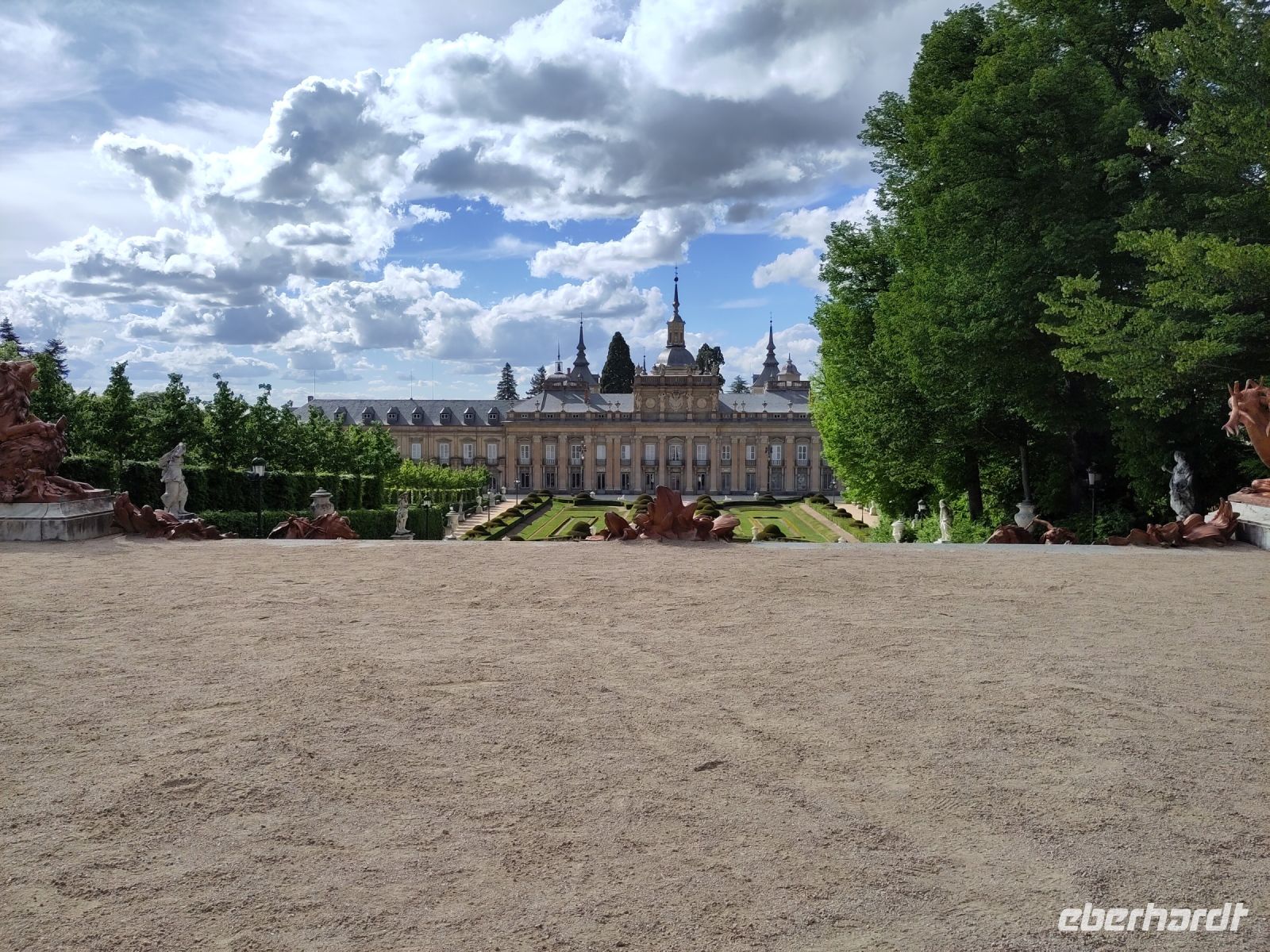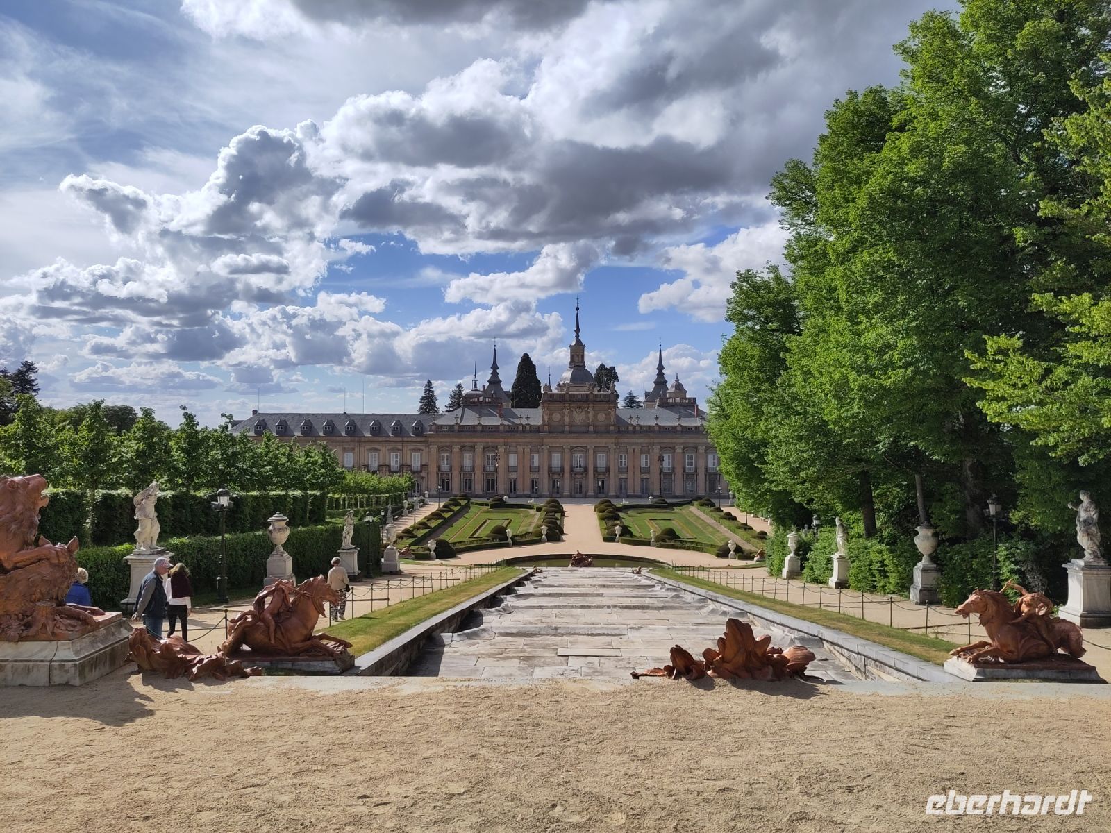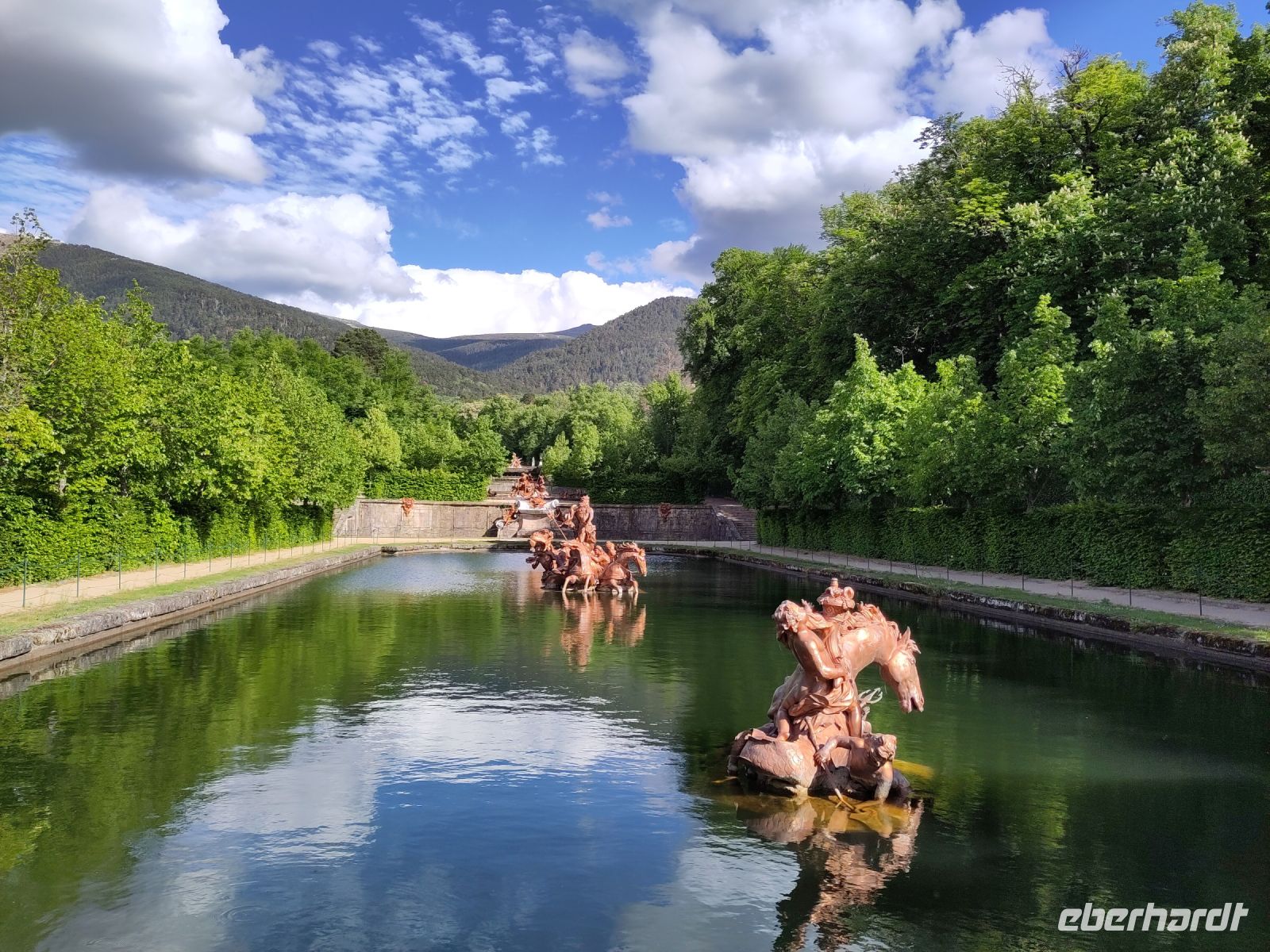 Nach dem Besuch der zwei Städte Ávila und Segovia sind wir alle schon ziemlich platt. Bevor bevor wir jedoch endlich wieder die Sierra de Guadarrama (das Gebirge vom sandigen Fluss), überqueren, um unser Hotel in Madrid zu beziehen, haben wir noch eine Verabredung mit La Granja de San Ildefonso. La Granja de San Ildefonso ist eine bourbonische Sommerresidenz, ein am Westhang der Sierra gelegenes Jagdschloss. Während Madrid mit seinen 650 Metern über dem Meeresspiegel im Sommer in seinem eigenen Saft schmorte, konnten sich die Bourbonen im 18. Jhdt. im Hochsommer in dieses auf fast 1.200 Metern gelegene Jagdschlösschen zurückziehen, Bootspartien auf dem nahegelegenen See genießen und sich des Lebens erfreuen. Wir besuchen die Wohnräume des Schlosses und machen noch eine Runde durch den Palastgarten mit seinen Brunnenanlagen. Dann fahren wir endlich in Spaniens Hauptstadt.