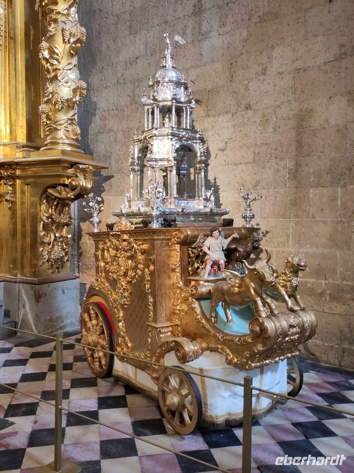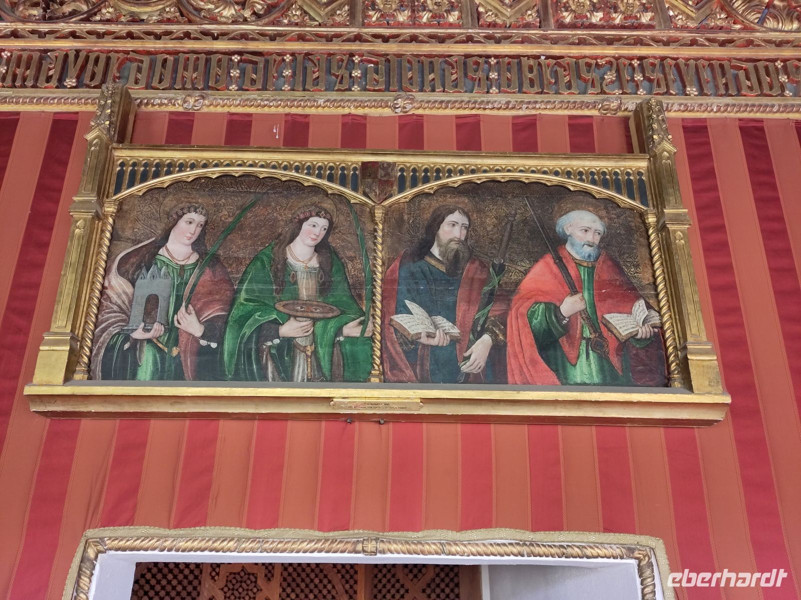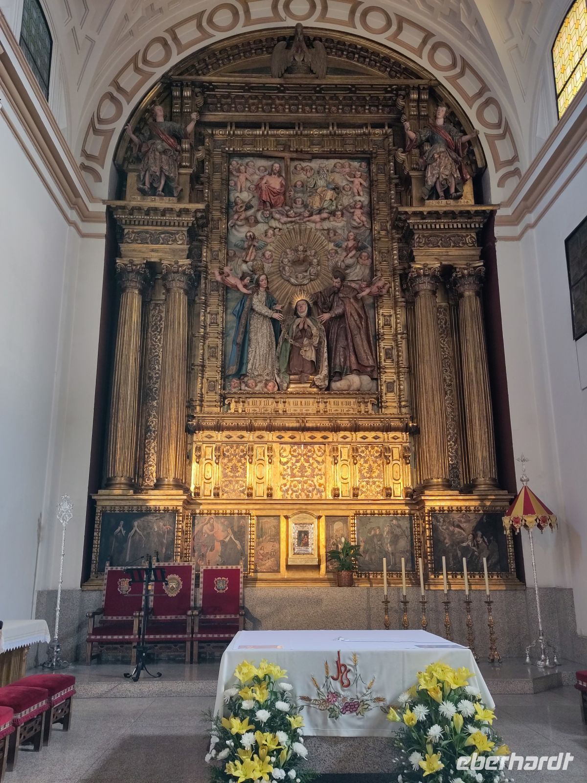 Die Basilika dürfen wir betreten, denn es findet gerade kein Gottesdienst statt. Aber einige Kinder üben gerade für eine anstehende Erstkommunionsfeier. Wir sehen eine Reihe von Fresken auch hier (fotografieren verboten), unter anderem eines, auf dem Carlos V. (Quinto de Alemania, primero de España - der fünfte von Deutschland, der erste von Spanien) und sein Sohn Philipp auf einer Wolke der Erhöhung des Kreuzes beiwohnen.