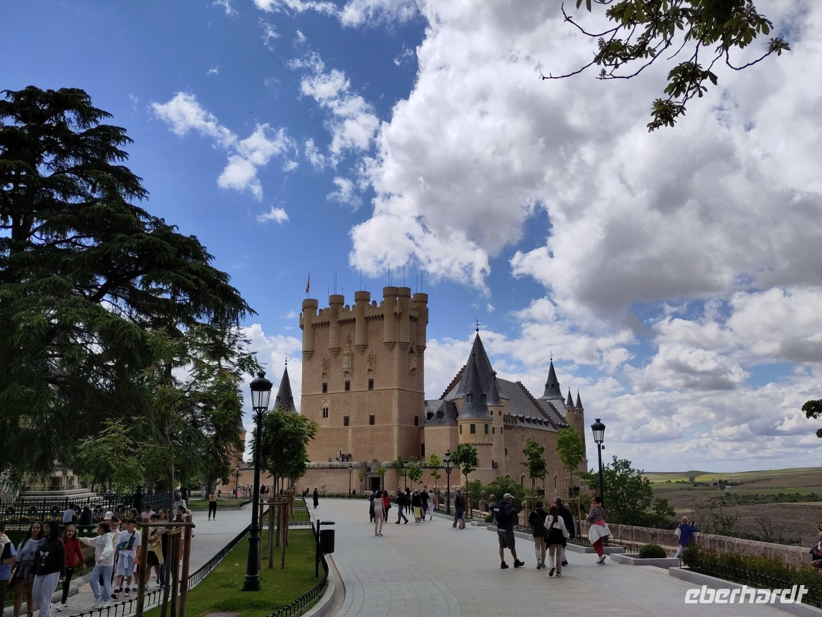 Auf dem Weg dorthin entdeckt jemand aus der Gruppe einen Schlüsselbund, der in einer Tür steckt. Niemand zu sehen. Was tun? Wir ziehen den Schlüssel ab und geben ihn in einem benachbarten Geschäft ab. „Der steckte in der roten Tür, zwei Häuser weiter.“ „Rote Tür? Weißt du etwas von einer roten Tür, María?“ - Schulterzucken - „Da, wo Don Quijote und Sancho Panza in Schaufenster sitzen.“ „Ah, dann muss das der Schlüssel von José sein.“ mit diesen Worten wird der Schlüssel angenommen und wir können unseren Weg in Richtung des Alcázar guten Gewissens fortsetzen. Hier sehen wir Gemächer Philipps II. - die auch an die Gestaltung seiner Räume im Escorial erinnern, den wir ja noch besuchen würden - und den Thronsaal von seiner Urgroßmutter, der Katholischen Königin Isabel, welche ihre Nichte ausgebootet hatte, indem sie diese - sie ist bis heute als la Beltraneja bekannt, weil ihr Vater eben nicht der König (Heinrich IV., der Impotente) sondern der Liebhaber der Königin, Beltrán, gewesen sein soll - als Kuckuckskind brandmarkte. So folgte Isabel ihrem Bruder auf den Thron und heiratete heimlich den Thronfolger von Aragón, Ferdinand. Diese Hochzeit war Grundlage für die Vereinigung der Königreiche Kastilien-León und Katalonien-Aragón zu Spanien unter ihrem Enkel, dem spanischen König und deutschen Kaiser Karl V.