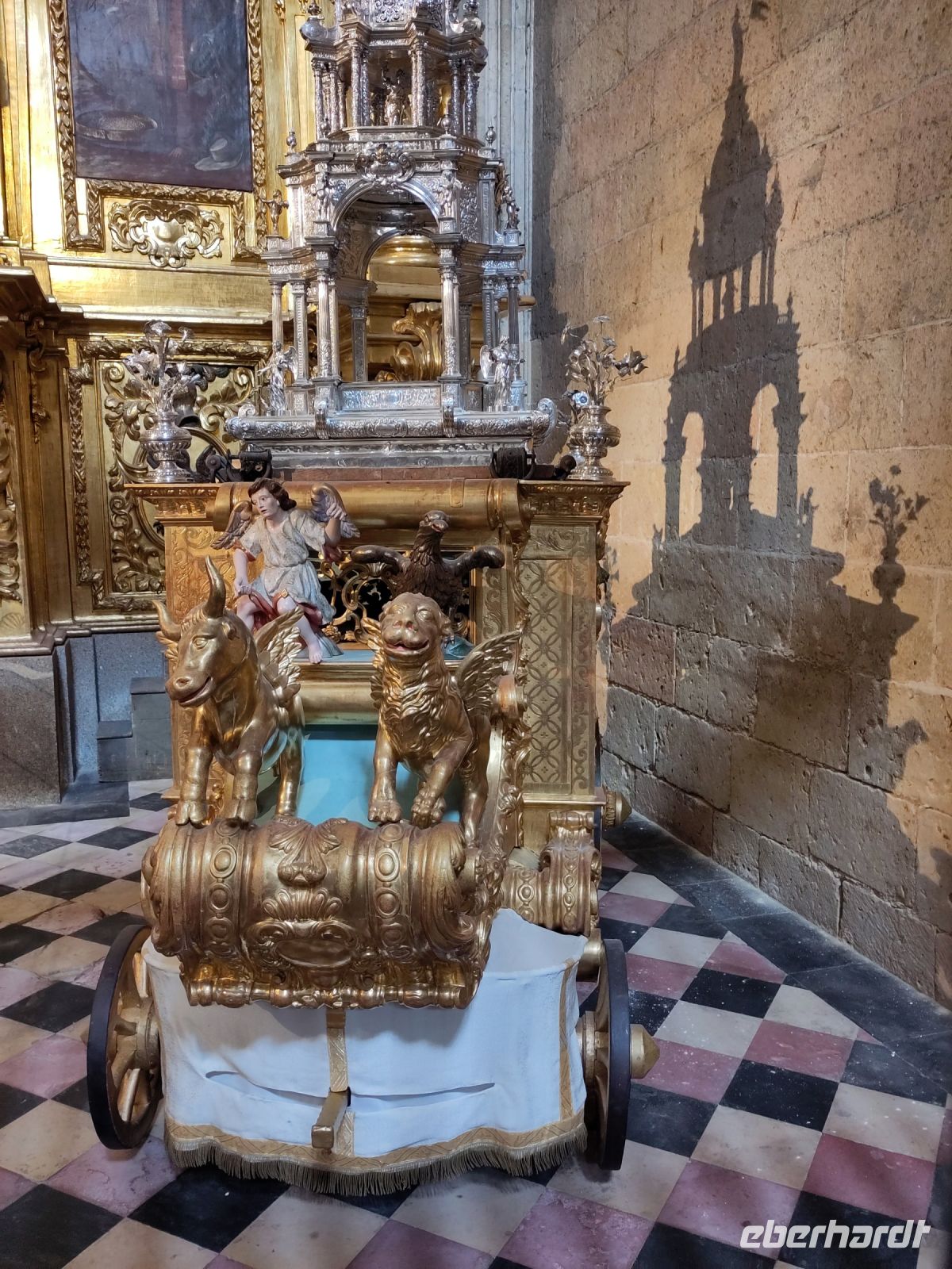 Wir sehen auch eine Sänfte, die gleichzeitig auch ein früher Rollstuhl ist, hierin wurde Phillip kurz vor seinem Tod aus Madrid in den Escorial gebracht.