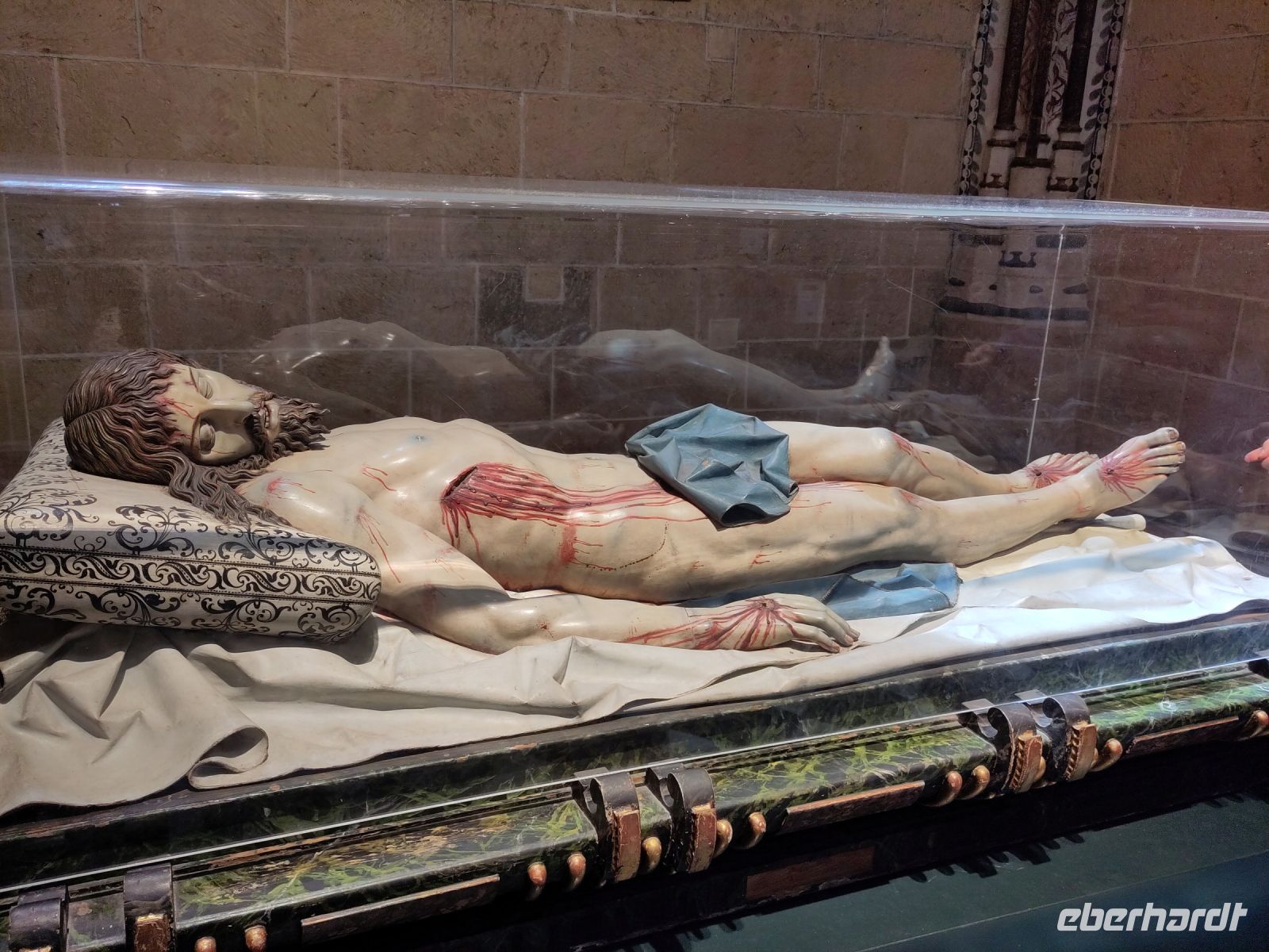 Weiter geht es, zunächst durch die Judería mit ihren SEFARAD-Symbolen - die iberische Halbinsel in den hebräischen Lettern SFRD (S = Samech), wobei das D von Sefarad Portugal darstellt - wie man sie in vielen spanischen Städten, entweder als Bronze- oder Messingplaketten oder als Kacheln an Hauswänden oder im Straßenpflaster ähnlich unseren Stolpersteinen findet - zur Kathedrale. Hier sehen wir unter anderem den „liegenden Christus“ von Gregorio Fernández, einem Barockkünstler der für seine lebensechten Plastiken bekannt geworden ist.