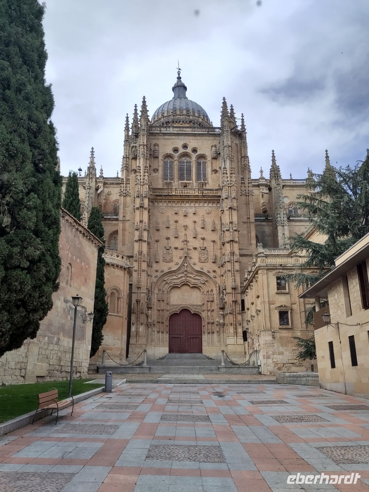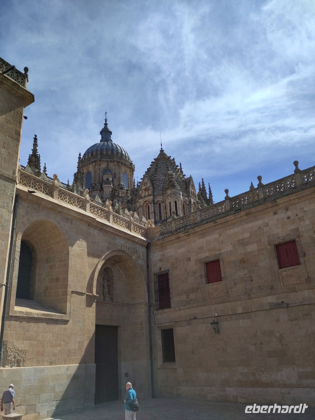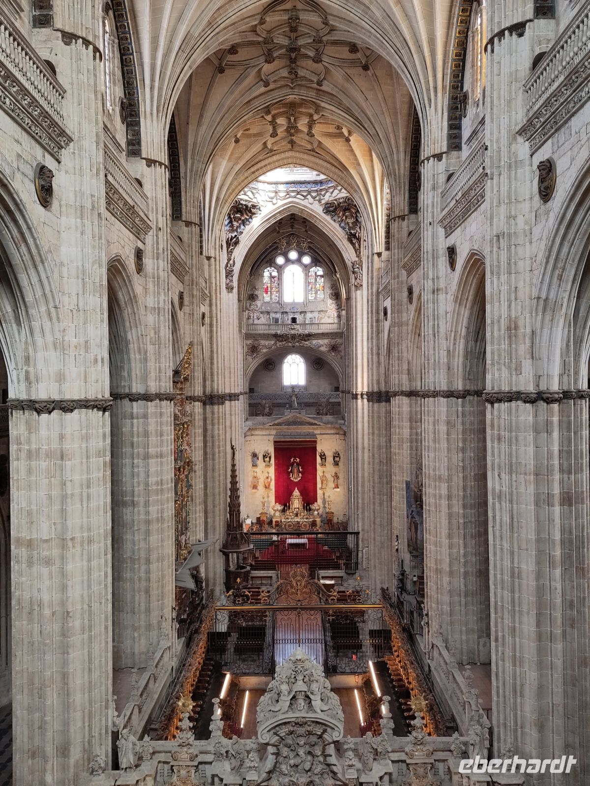 In der Kathedrale ging unser Blick nach oben. Gotik halt. Die zieht den Blick nach oben, wie Alicia bemerkt. Wir sehen uns zunächst die neue (spätgotisch-renaissancistische) und etwas danach die alte (romanisch-gotische) Kathedrale an, die Wand an Wand stehen, bzw. anders ausgedrückt: Die Nordwand der alten Kathedrale ist Teil der Südwand der neuen Kathedrale, wobei die neue Kathedrale im Hauptschiff etwa doppelt so lang ist, wie die alte. Die neue Kathedrale von Salamanca rühmt sich, über die höchste Kuppel Spaniens zu verfügen. Nach der Kathedrale von Sevilla (die drittgrößte und größte gotische Kathedrale der Welt, Neogotik ausgenommen) ist sie die größte Kathedrale Spaniens.