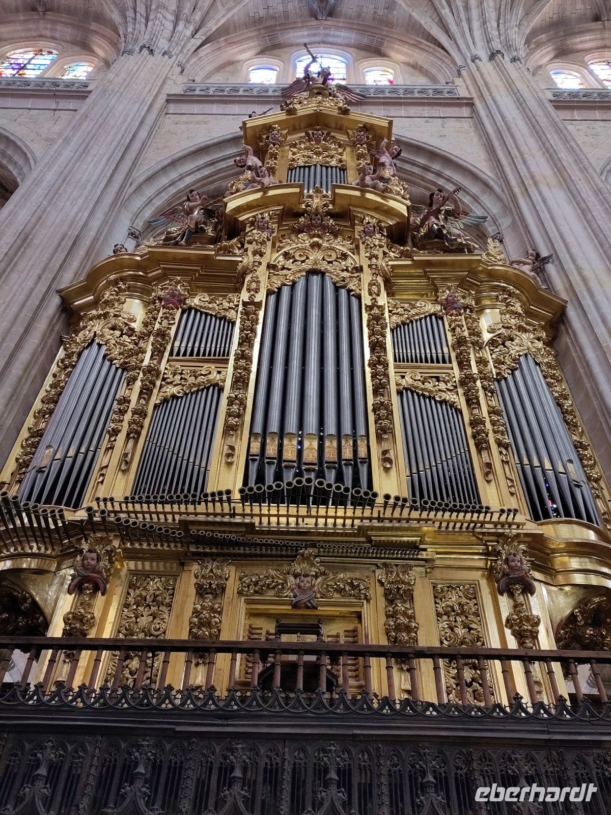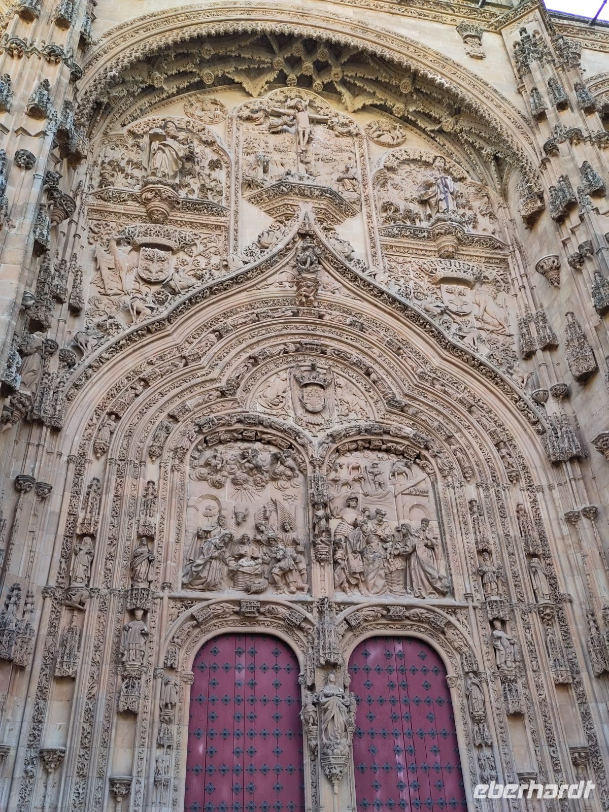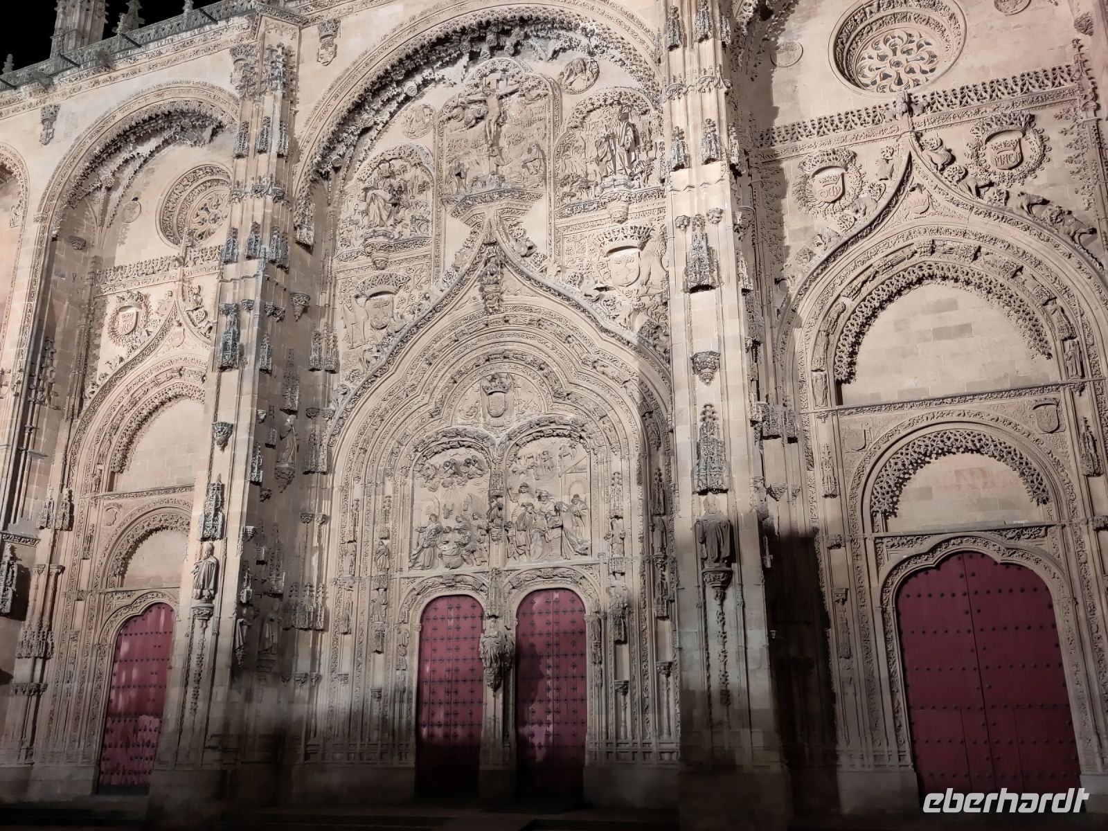 In der Kathedrale ging unser Blick nach oben. Gotik halt. Die zieht den Blick nach oben, wie Alicia bemerkt. Wir sehen uns zunächst die neue (spätgotisch-renaissancistische) und etwas danach die alte (romanisch-gotische) Kathedrale an, die Wand an Wand stehen, bzw. anders ausgedrückt: Die Nordwand der alten Kathedrale ist Teil der Südwand der neuen Kathedrale, wobei die neue Kathedrale im Hauptschiff etwa doppelt so lang ist, wie die alte. Die neue Kathedrale von Salamanca rühmt sich, über die höchste Kuppel Spaniens zu verfügen. Nach der Kathedrale von Sevilla (die drittgrößte und größte gotische Kathedrale der Welt, Neogotik ausgenommen) ist sie die größte Kathedrale Spaniens.