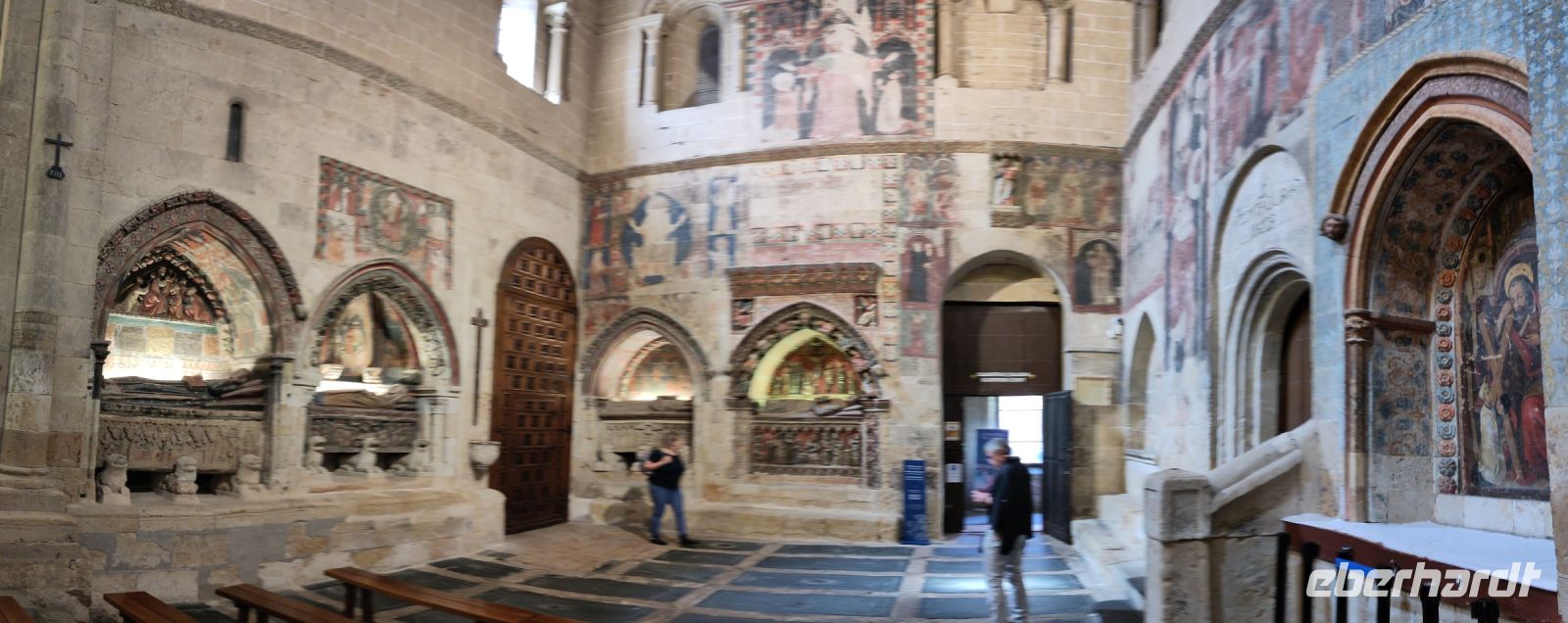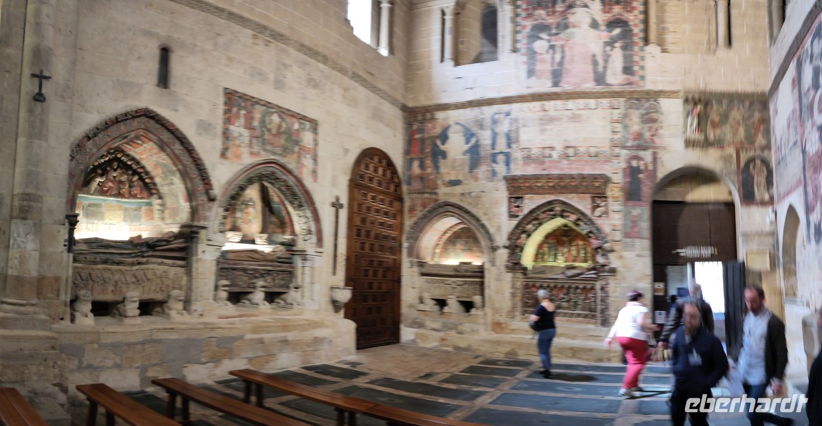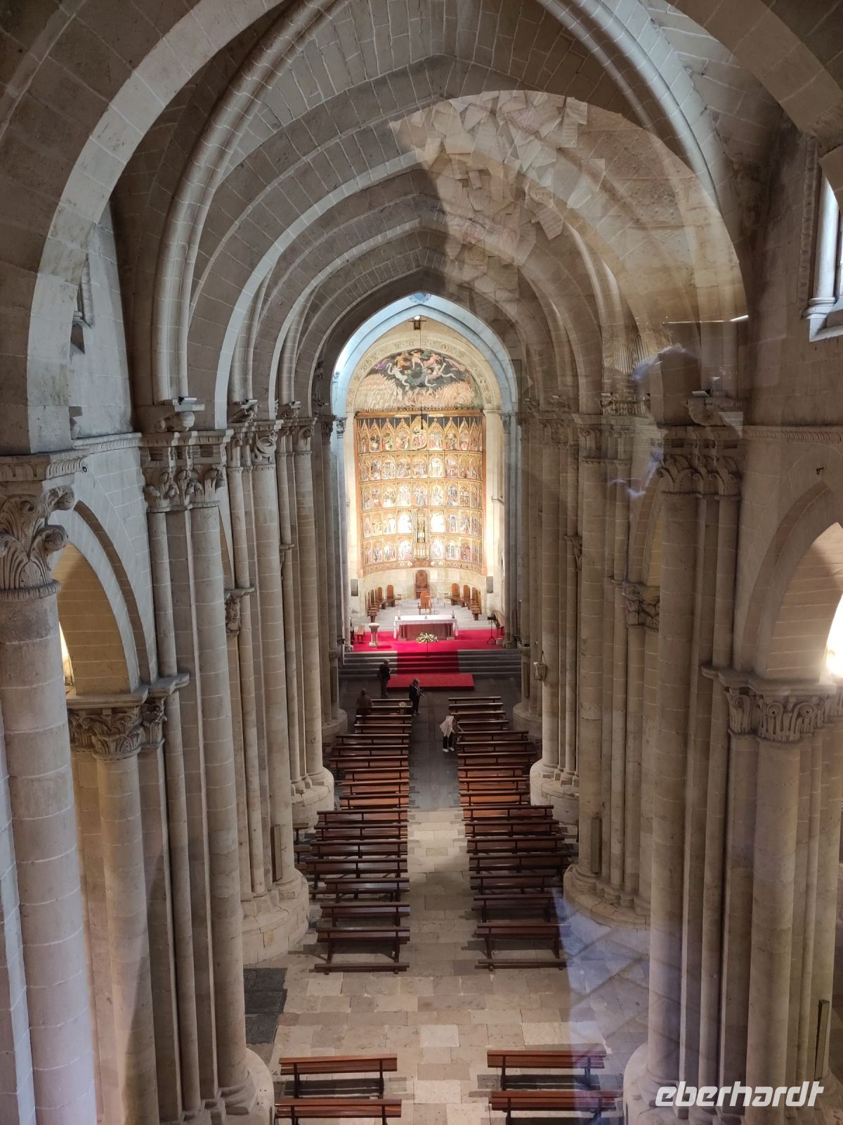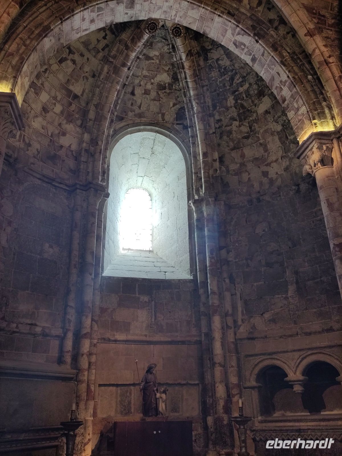 Adolfo Suárez liegt heute zusammen mit seiner Ehefrau in der Kathedrale von Ávila bestattet, die unser nächstes Ziel beim Stadtrundgang war. Die Kathedrale - genauer gesagt ihre Apsis - ist Teil der Stadtbefestigung von Ávila. Dieser Teil und ein großer Teil ihrer Mauern ist daher aus demselben Granit errichtet, wie die Stadtmauer und auch die meisten Adelspaläste der Stadt. In der Kathedrale sehen wir aber auch viel Buntsandstein, der ein interessantes Farbenspiel zeigt, besonders auch dort, wo die Sonne durch Buntglasfenster das rot-grau-gelbe Farbenspiel des Sandsteins um Blau- und Grüntöne bereichert.
