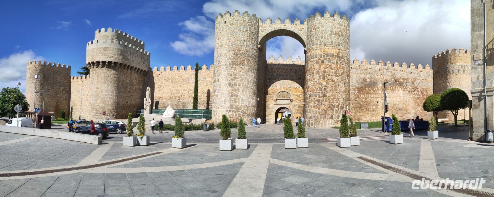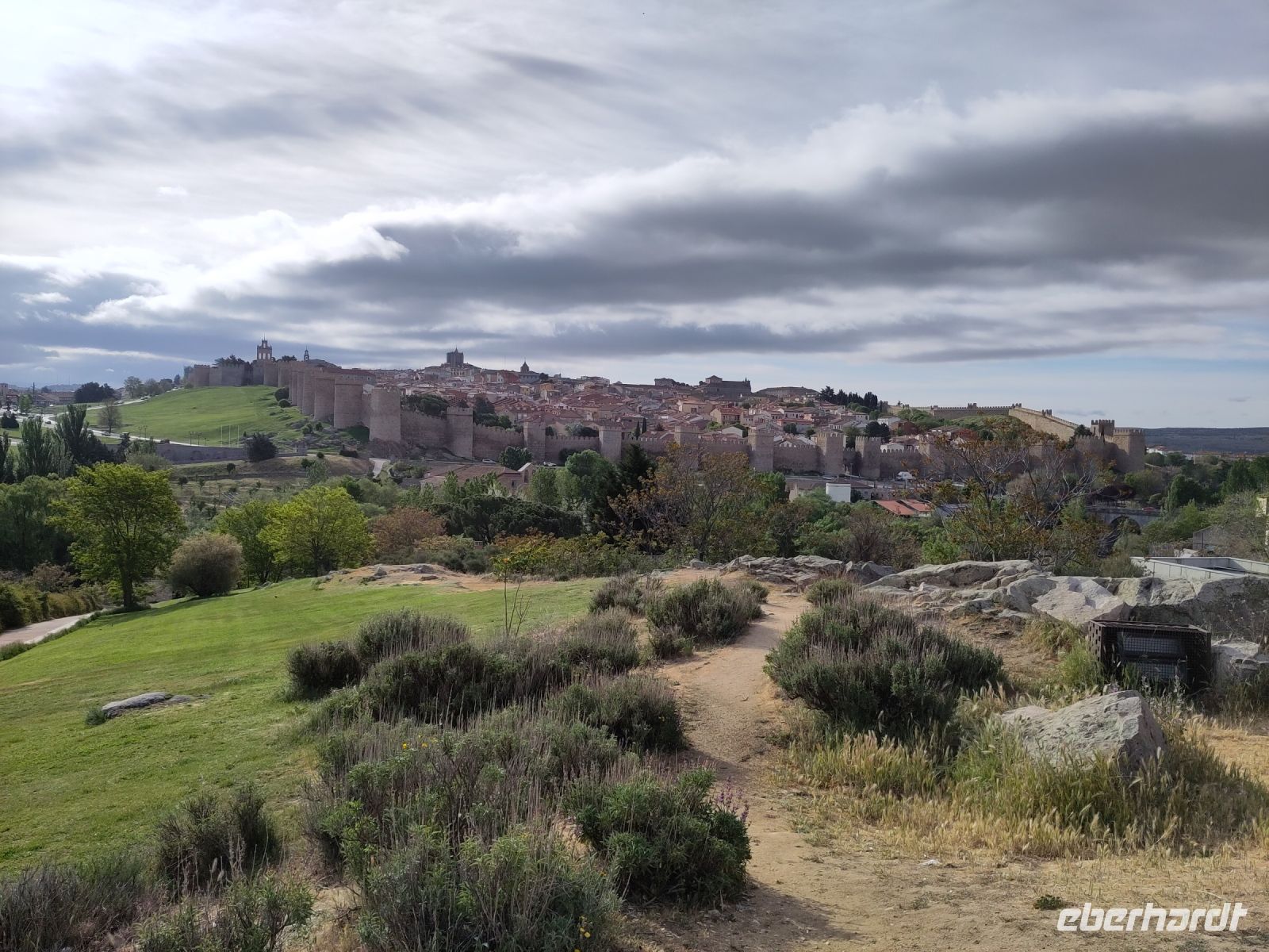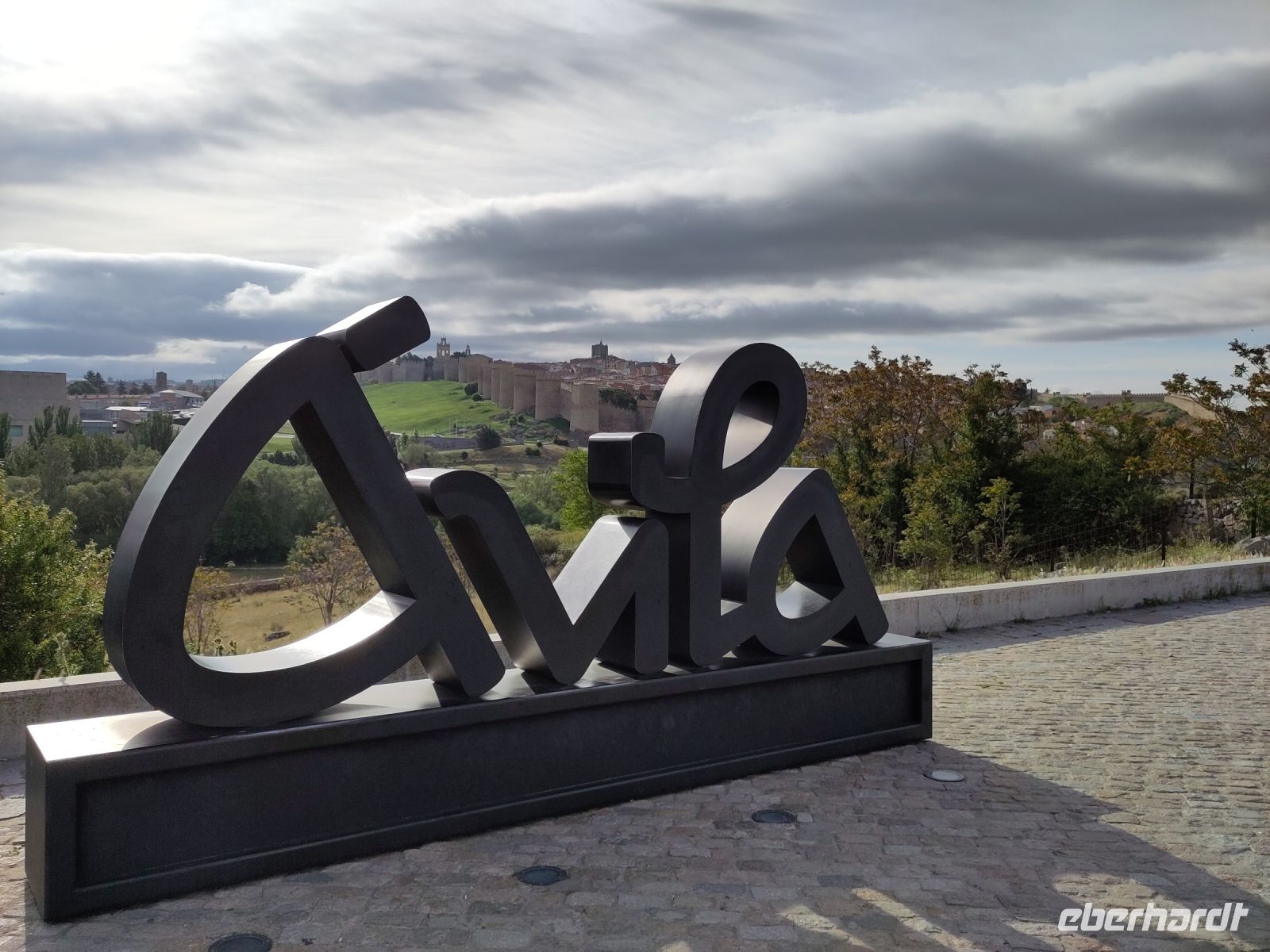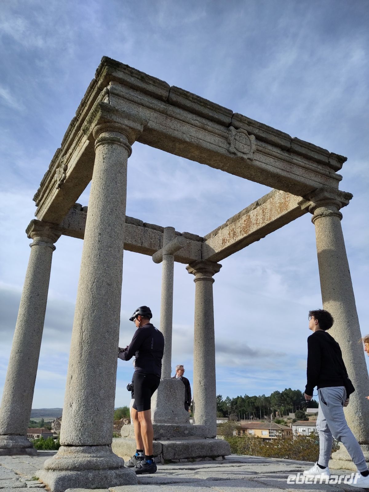 Heute führt uns unser Weg von Salamanca fort und wir fahren ins beschauliche Ávila. Zunächst machen wir halt bei den Cuatro Postes, vier Säulen, mit Balken obenauf, die rund um ein Granitkreuz stehen. Ein sogenannter Humilladero. Humillar bedeutet auf spanisch, 'erniedrigen', ein Humilladero ist ein Ort, an dem man sich, meist vor einem Kreuz, zu früheren Zeiten niedergeworfen hat, um während einer Reise ein Gebet zu sprechen. Hier vermutlich ein Dankgebet, dass man sein Ziel, Ávila erreicht hat, denn von hier aus hat man einen phantastischen Blick auf einen großen Teil des intakten mittelalterlichen Mauerrings der Stadt.