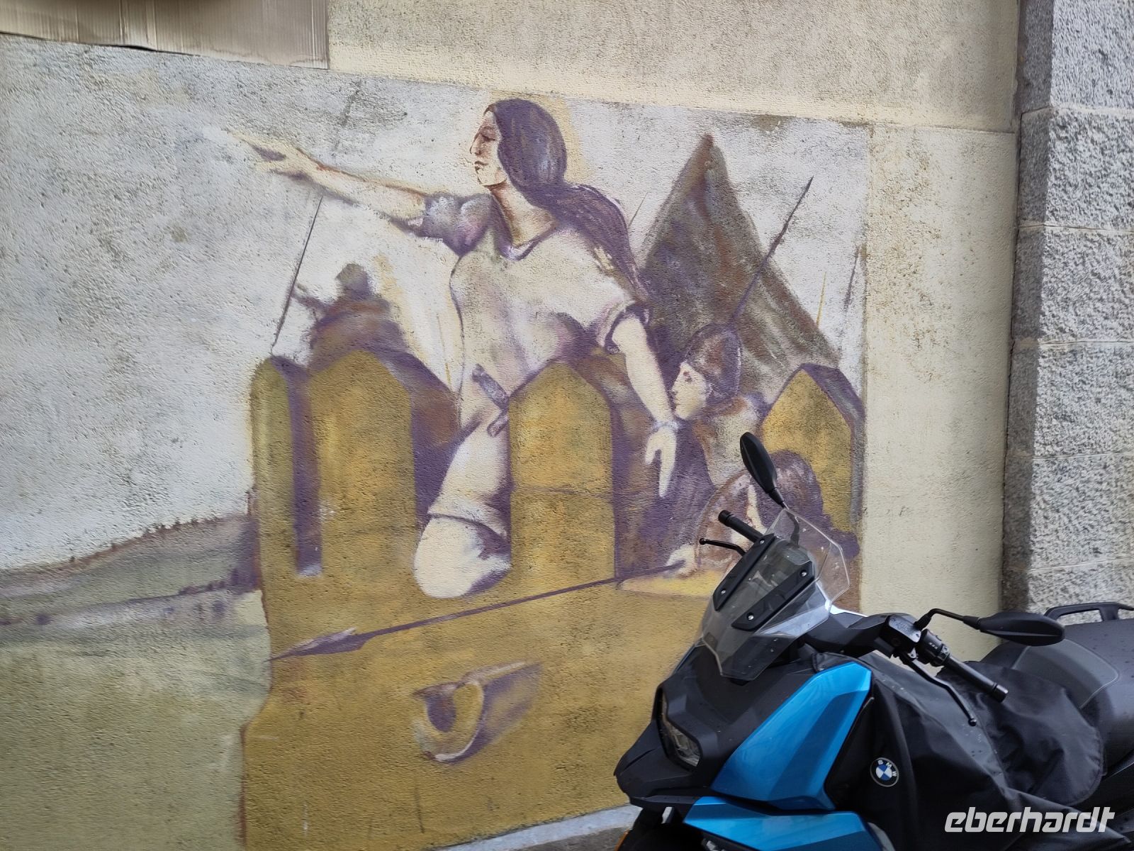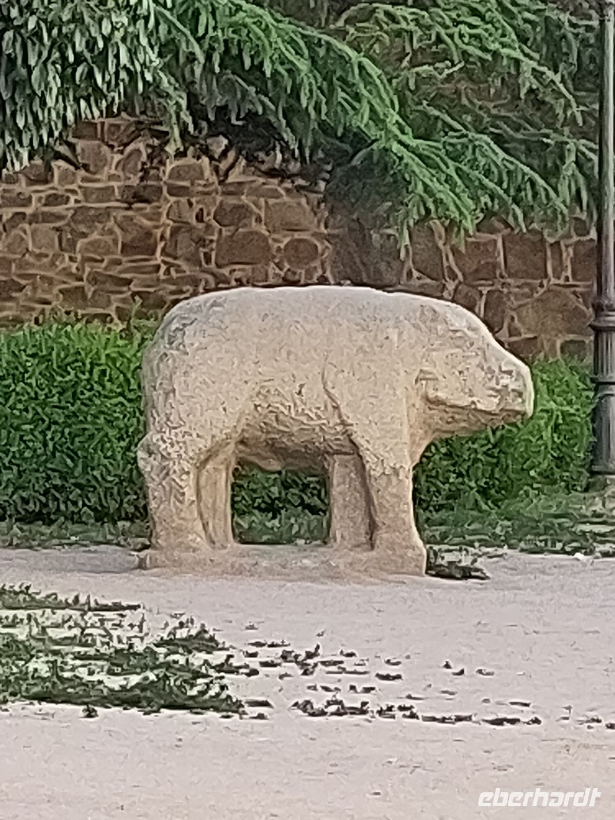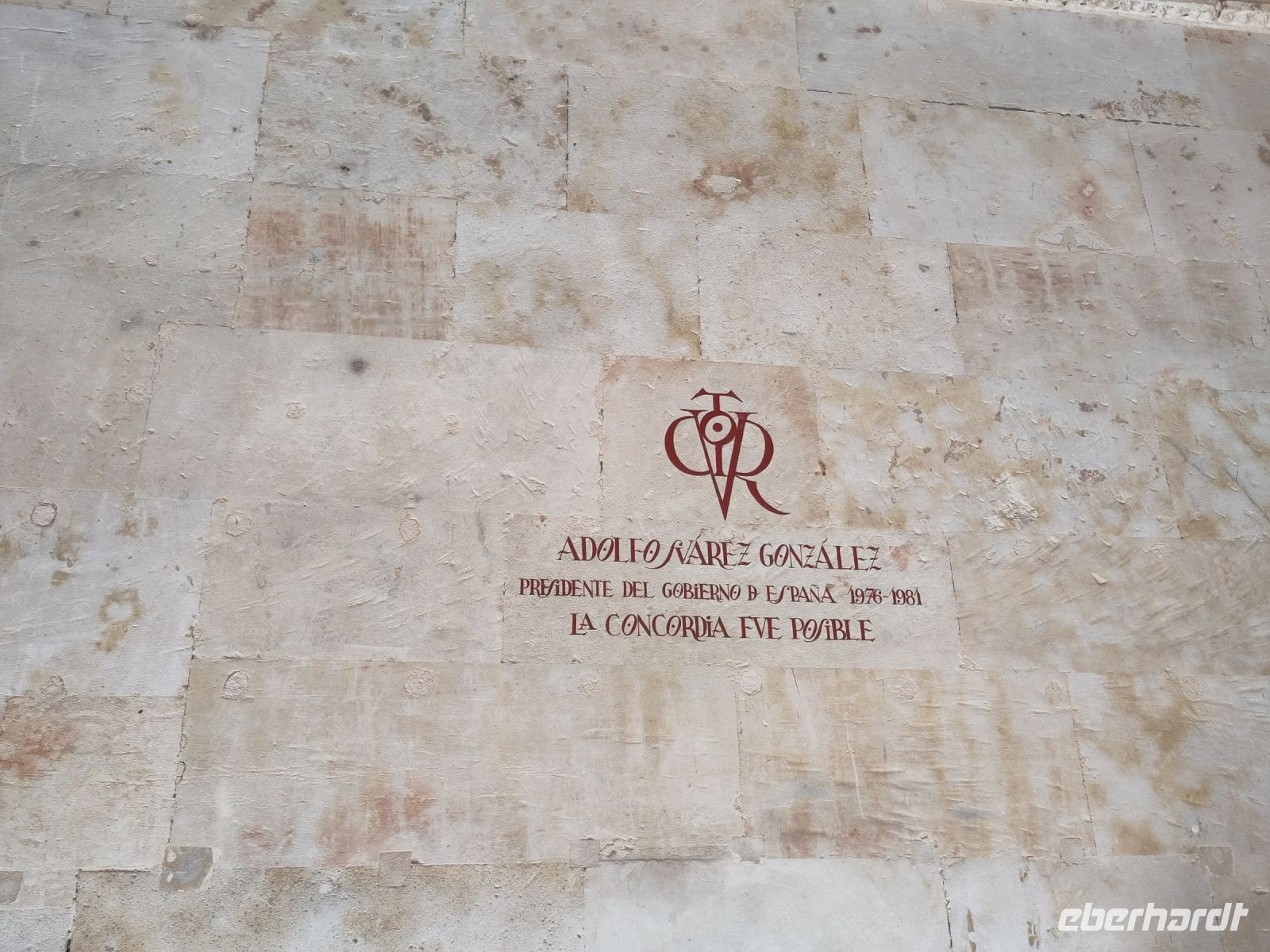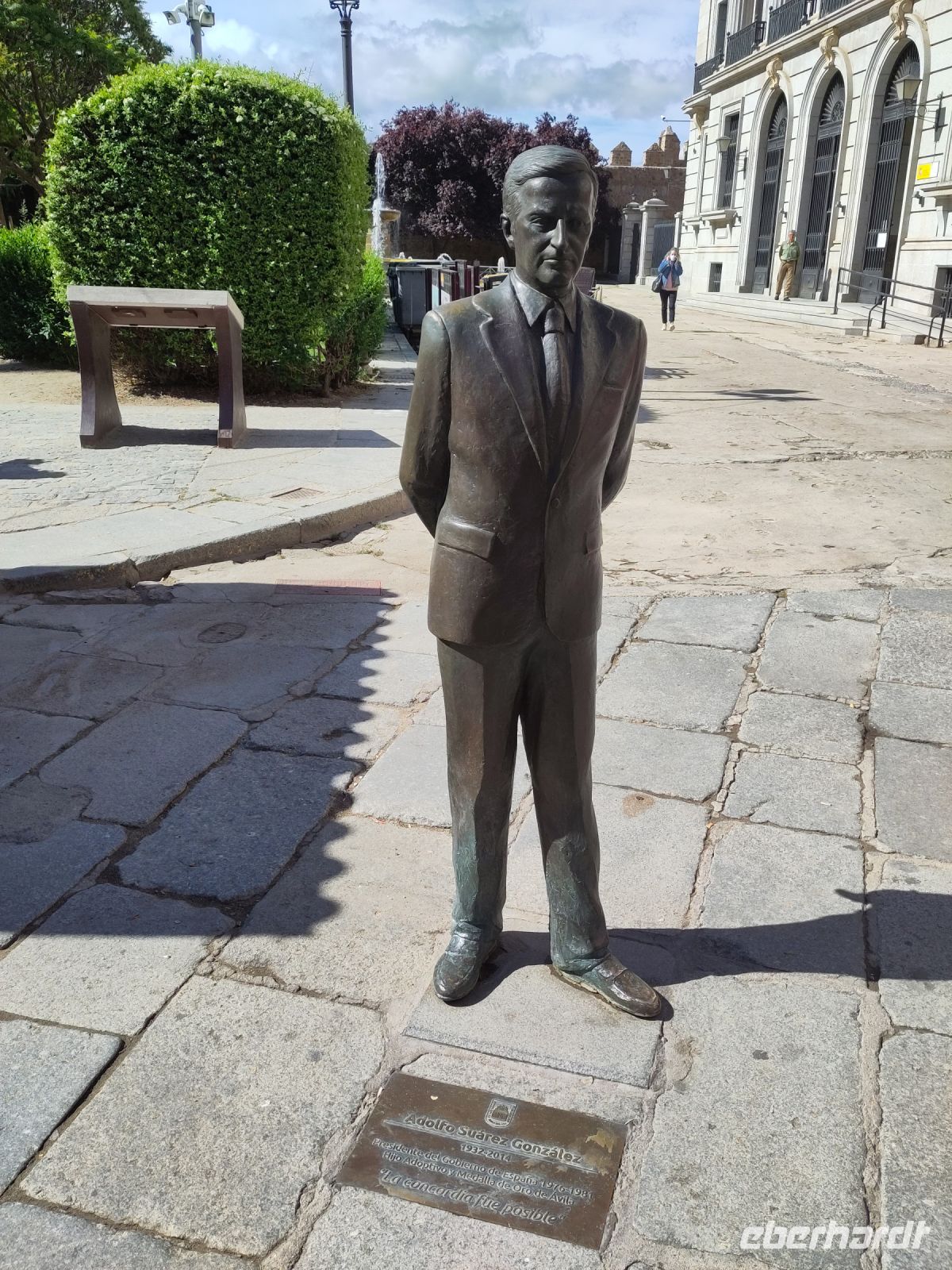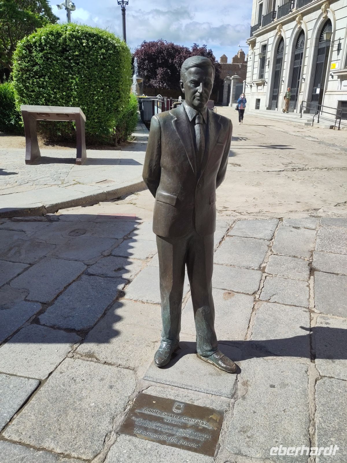 Unser Weg führte uns weiter zu einem der Nordosttore von Ávila, wo Adolfo Suárez eine Statue gewidmet war: La concordia fue posible - die Eintracht war möglich. Dies bezog sich auf die Transición, den Übergang von der Diktatur zur Demokratie, die unter Juan Carlos I. zwischen 1975 und 1978 projektiert war und deren Mastermind der bereits unter Franco als Minister tätige Adolfo Suárez war. Herzog Suárez, Opus Dei-Mann und bei Francos Tod (1975) General-Sekretär der faschistischen Falange, organisierte die Selbstauflösung der franquistischen Ständeversammlung, wurde Ministerpräsident (1976 - 81) für die kurzlebige christsoziale UCD und legalisierte als solcher die kommunistische Partei Spaniens.