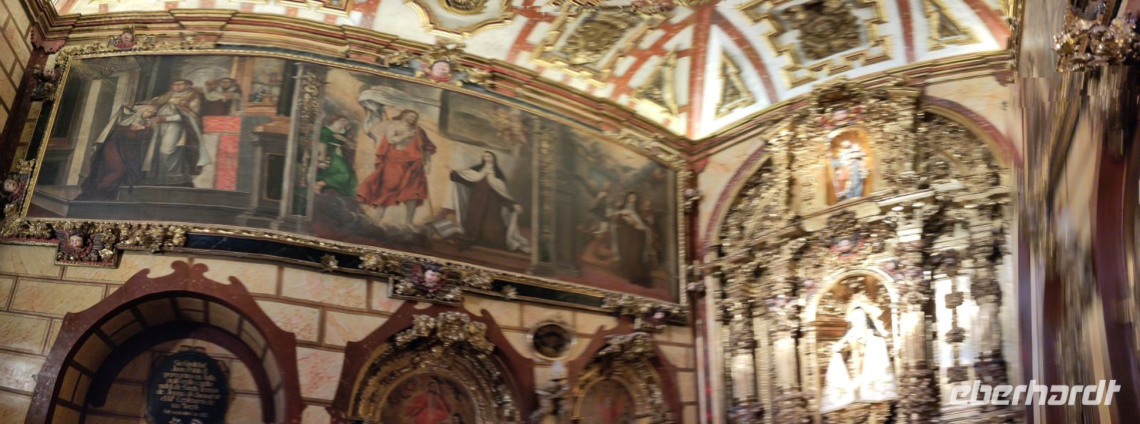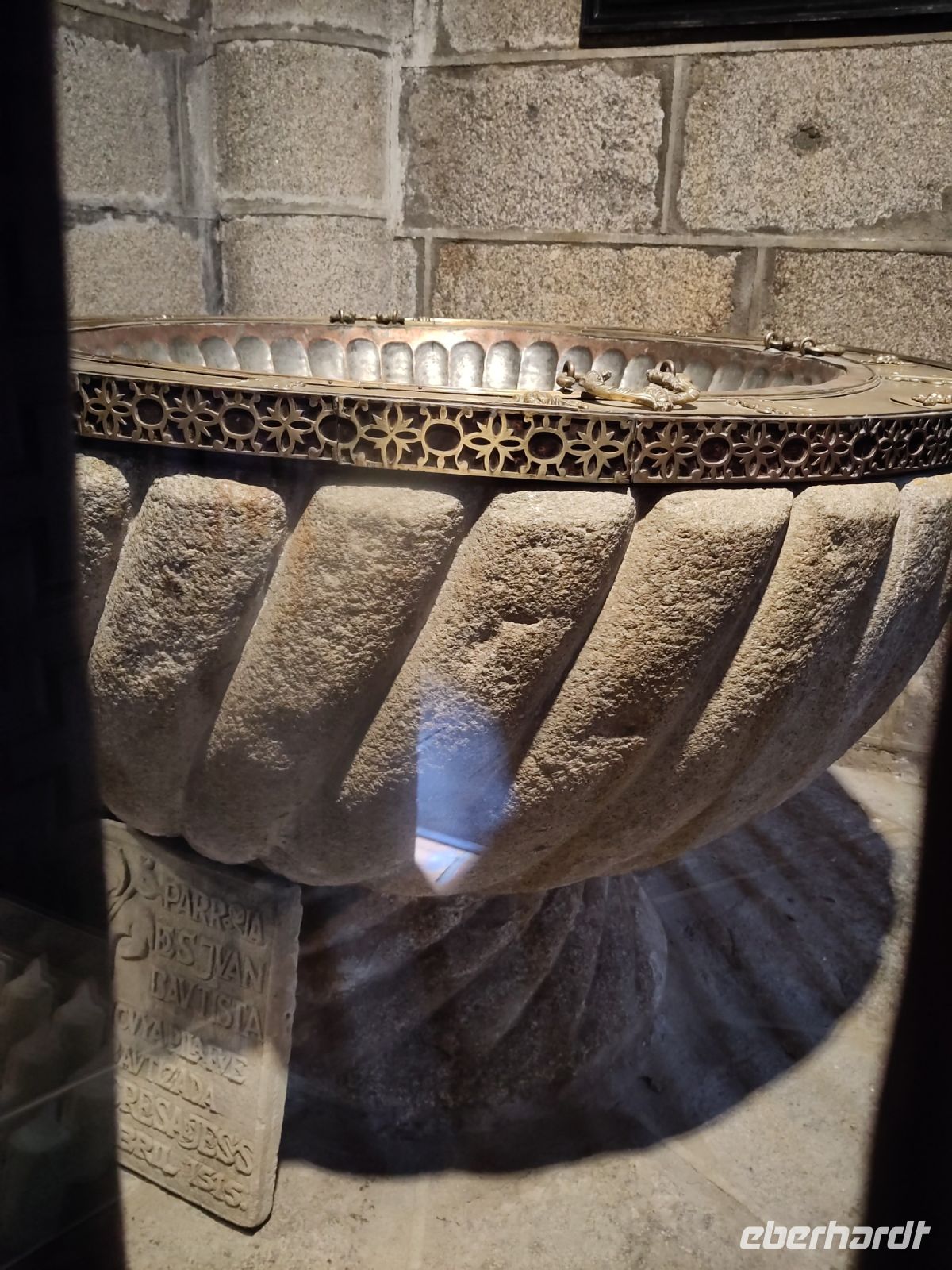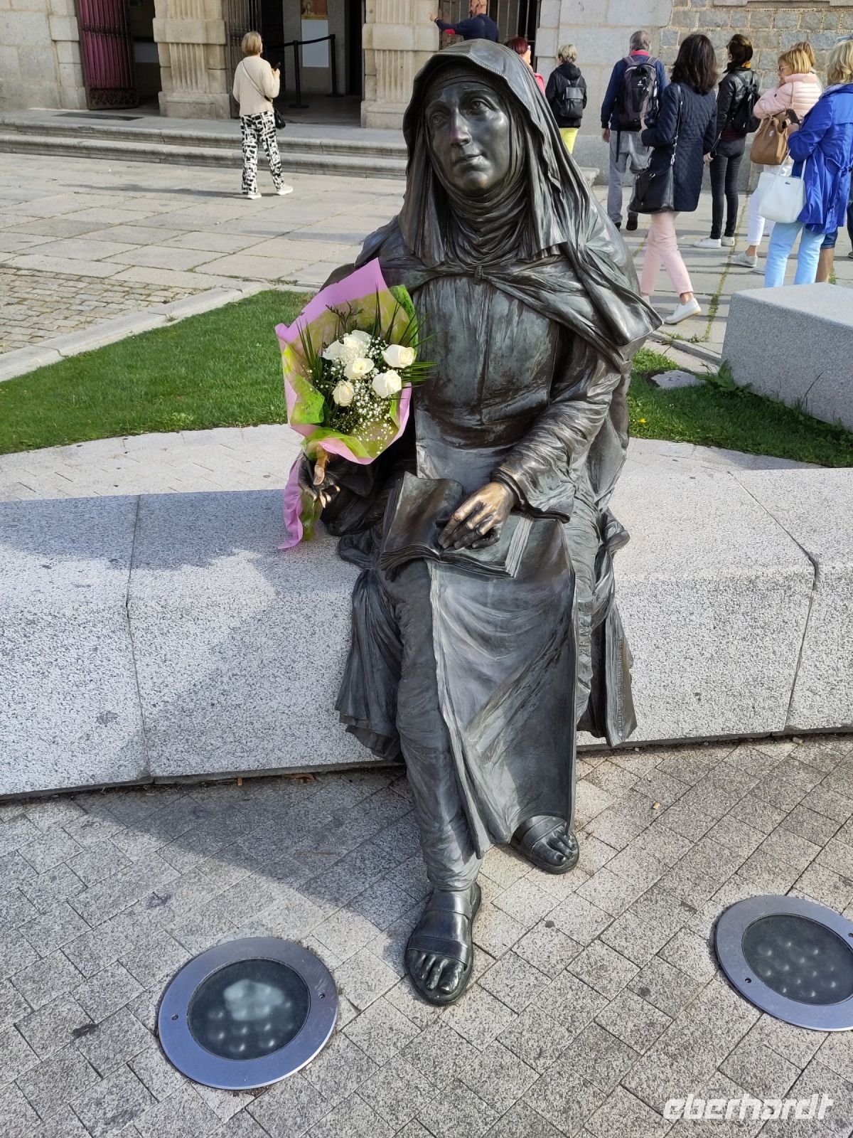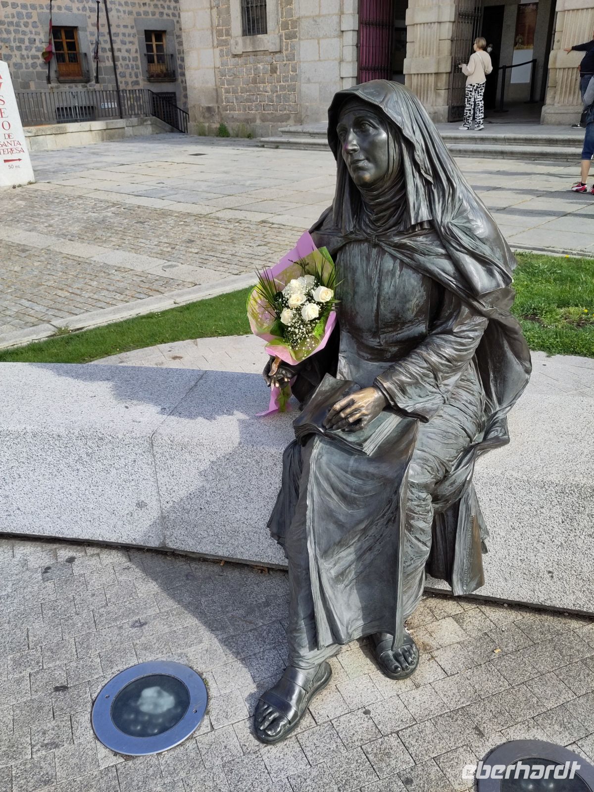 Es geht über den Mercado Chico (kleiner Markt), dessen Ausbau auf der Südseite von der Kirche verhindert wurde, zur Kirche Johannes des Täufers, in der wir das Taufbecken der Teresa von Ávila (und vieler anderer unbekannter Menschen) sehen. Anschließend geht es zum „Geburtshaus“ der Teresa von Ávila, deren Großvater ein Konvertit war, dieses ist längst zu einem Klosterkonvent umgestaltet worden und wir sehen, die Geburtskapelle der Teresa, an deren Wände Szenen aus Teresas Leben und - teils erotischen - Träumen bzw. Visionen gepinselt sind. David witzelt, dass Kloster, Kirche und Kapelle natürlich noch nicht existierten, als Teresa geboren wurde. Er schildert uns aber auch, dass Teresa außer als Mystikerin auch als Reformerin (nicht Reformatorin) wichtig war: Auf sie geht die Auszweigung der Unbeschuhten Karmeliterinnen aus dem Karmeliterinnen-Orden zurück. Teresa störte sich an der mangelnden Devotion der meist aus adeligem oder reichem Hause stammenden Nonnen, die oft Dienerinnen hatten. Sie, die selber aus einem betuchten Hause stammte, verlangte von den Schwestern Demut und Verzicht auf Luxus und opulente Haushalte und hatte damit Erfolg. Heute sind die unbeschuhten Karmeliterinnen der größte katholische Frauenorden.