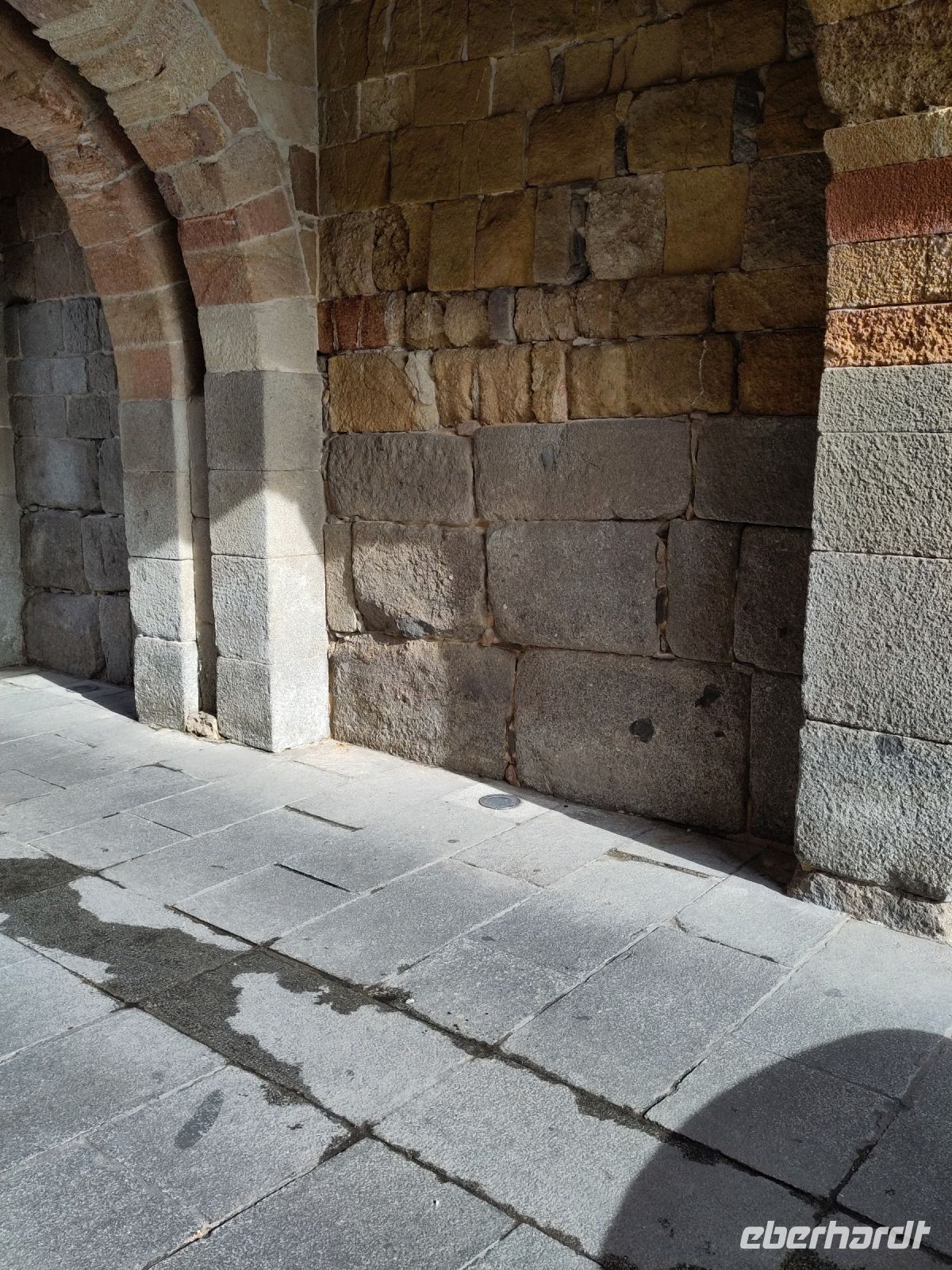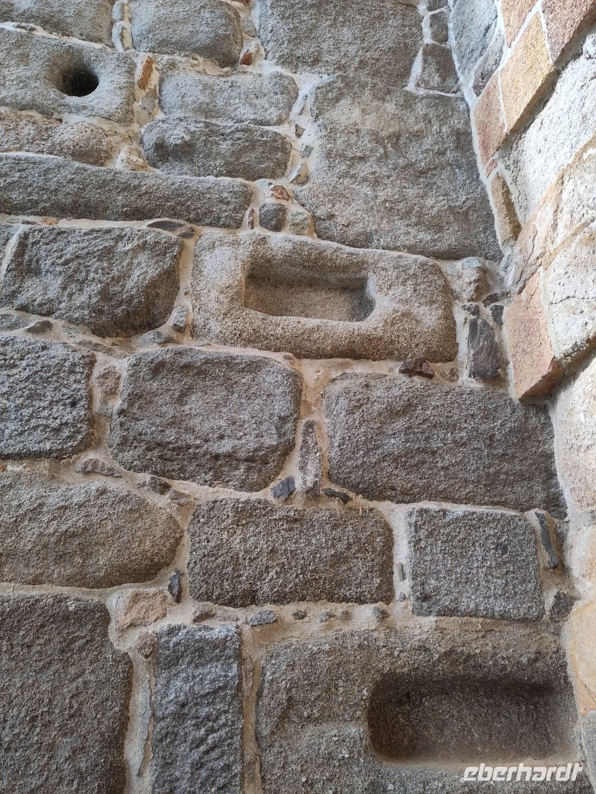 Kurz darauf treffen wir David - der sich natürlich nicht wie ein deutscher David ['da:vit] spricht, sondern spanisch [da'bi:th] (mit "englischem tee-eitsch"). David zeigt uns die antiken Cisten, welche als Spolien in der mittelalterlichen Stadtmauer verbaut sind. Bei den Cisten handelt es sich um in den Granitstein geschlagene Ascheurnen, in welche die Asche der Verstorbenen gefüllt wird, eine kleine Rinne diente dazu, die Asche der Verstorbenen mit wohlriechenden Ölen zu parfümieren.