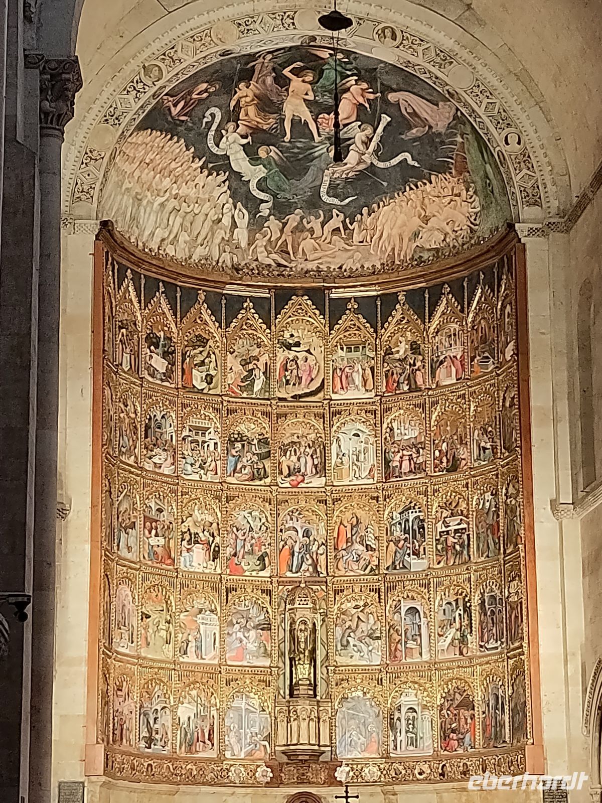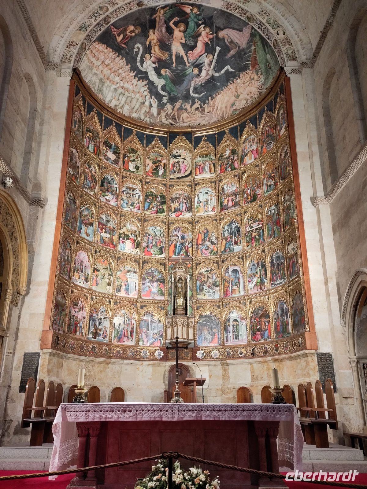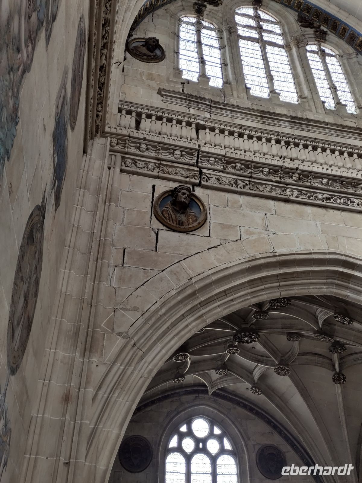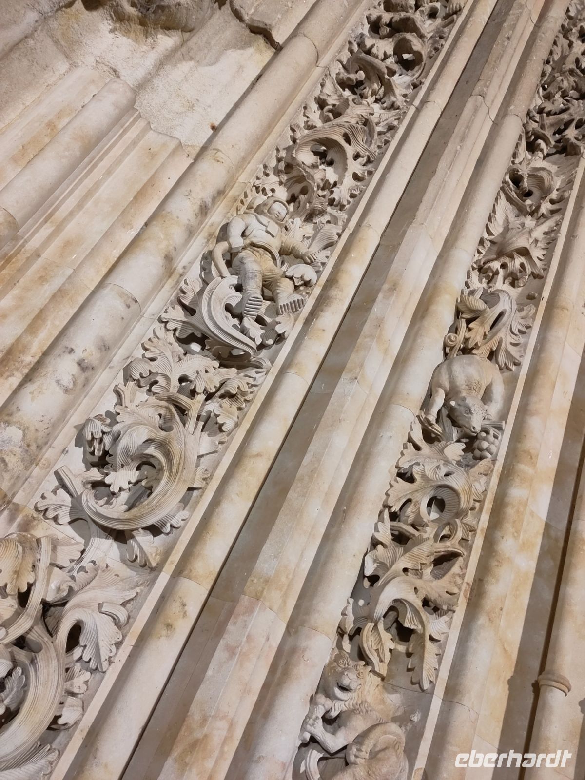 Etwas Zeit verbringen wir am Trascoro (in spanischen Kathedralen liegt der Chor oft zwischen Altarraum und Kirchenvolk und versperrt den Blick auf das Geschehen am Altar), dessen bildreiche Darstellung David uns erklärt und am Meisterwerk der Kathedrale, dem Grab des Getoasteten - El Tostado, so hieß der Bischof von Ávila Alonso Fernández de Madrigal mit Spitznamen, weil er, anders als andere Adelige, die ihre vornehme Blässe pflegten (blaues Blut kommt daher, dass Menschen, die nicht in der Sonne arbeiten mussten eben keine sonnengebräunte Haut hatten und die Venen leichter zu sehen waren), stets sonnengebräunt war (und vielleicht auch maurischer Herkunft). Als ihn beim Konzil von Basel der Papst (Martin V.? Eugen IV.?) wegen seiner geringen Körpergröße auslachte, soll El Tostado den Papst mir den Worten, dass in Spanien die Größe eines Mannes beginnend an den Augenbrauen an der Stirn gemessen würde, zur Raison gebracht haben.