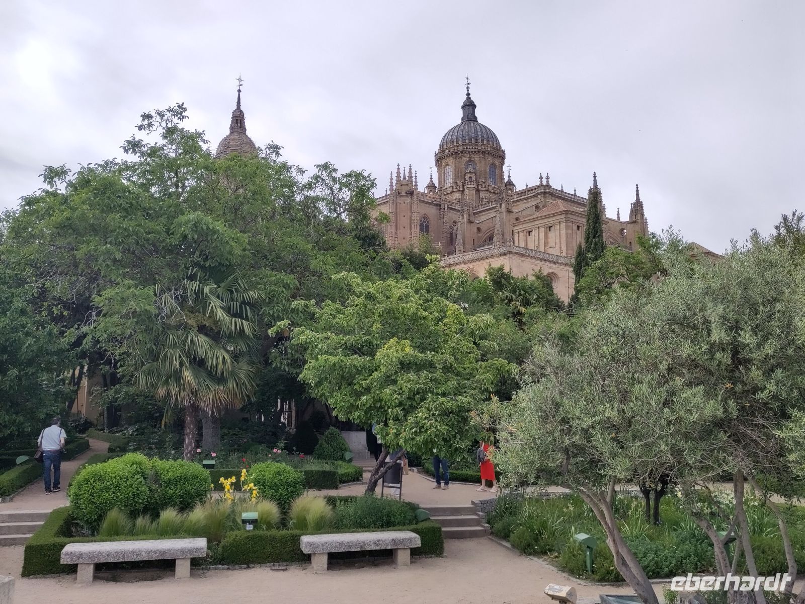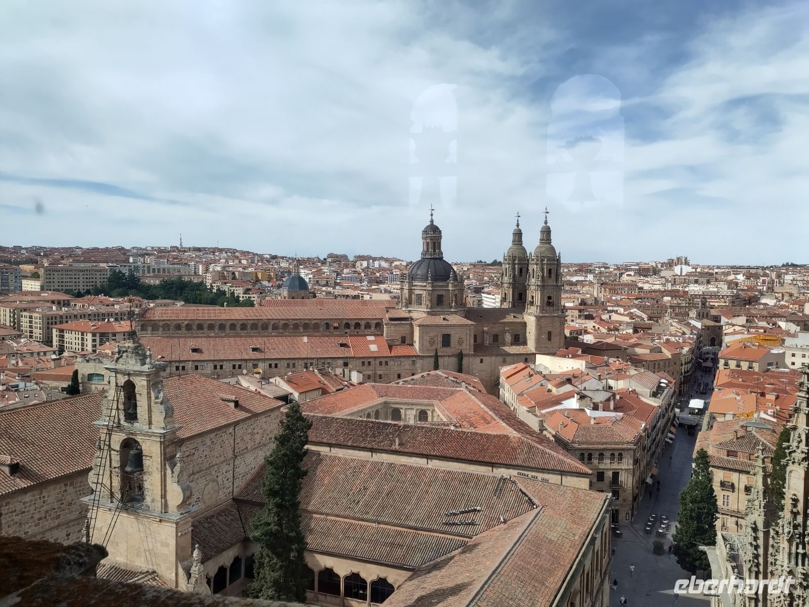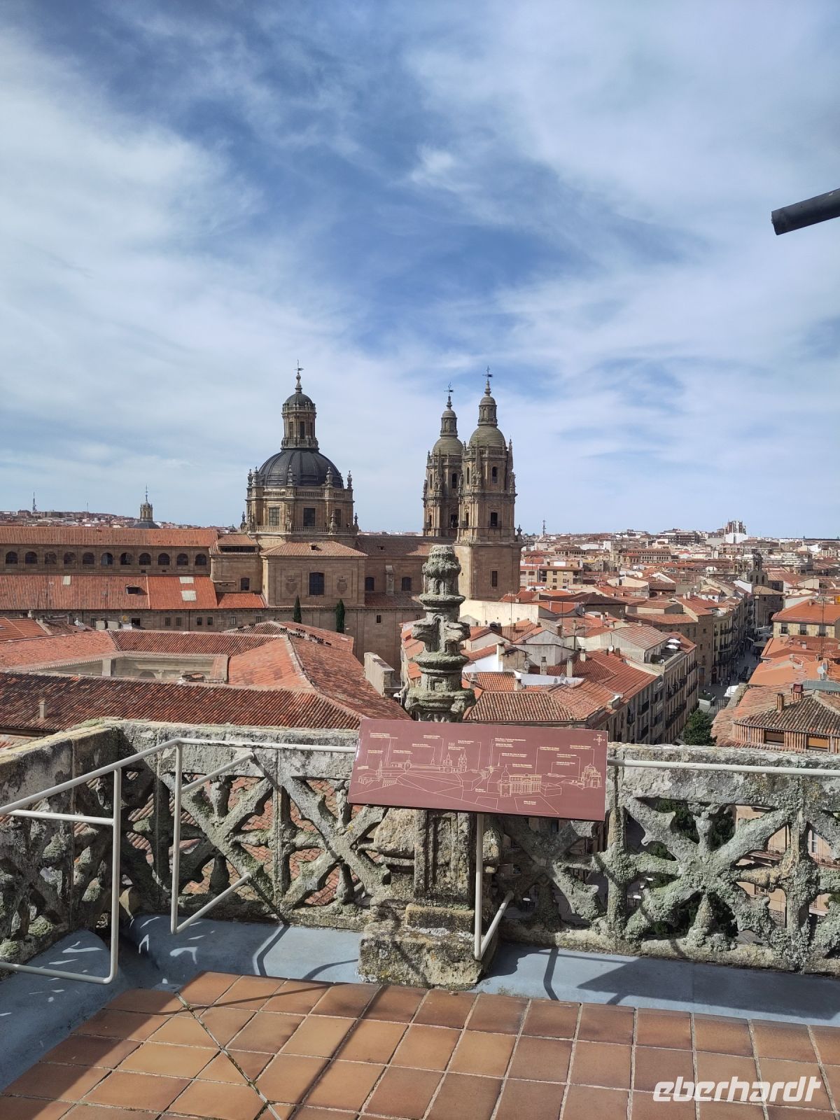 Zunächst führt Alicia uns zu einem kleinen Aussichtspunkt ganz in der Nähe unseres Hotels, damit wir die Dimensionen von Clerecía und Kathedrale wahrnehmen können, denn wenn man einmal in der Stadt ist, sagt sie, verschwinden die Gebäude fast. Zumindest lassen sich ihre Dimensionen nicht mehr so leicht erahnen.