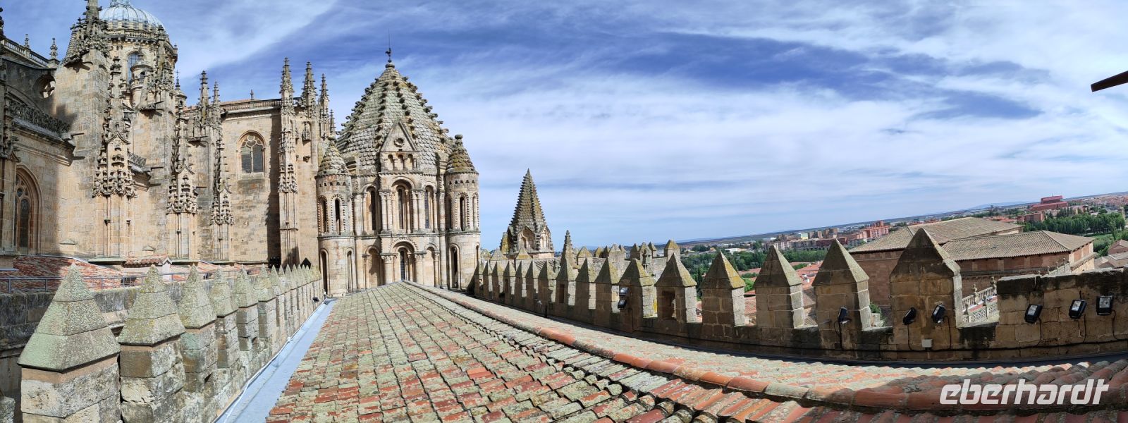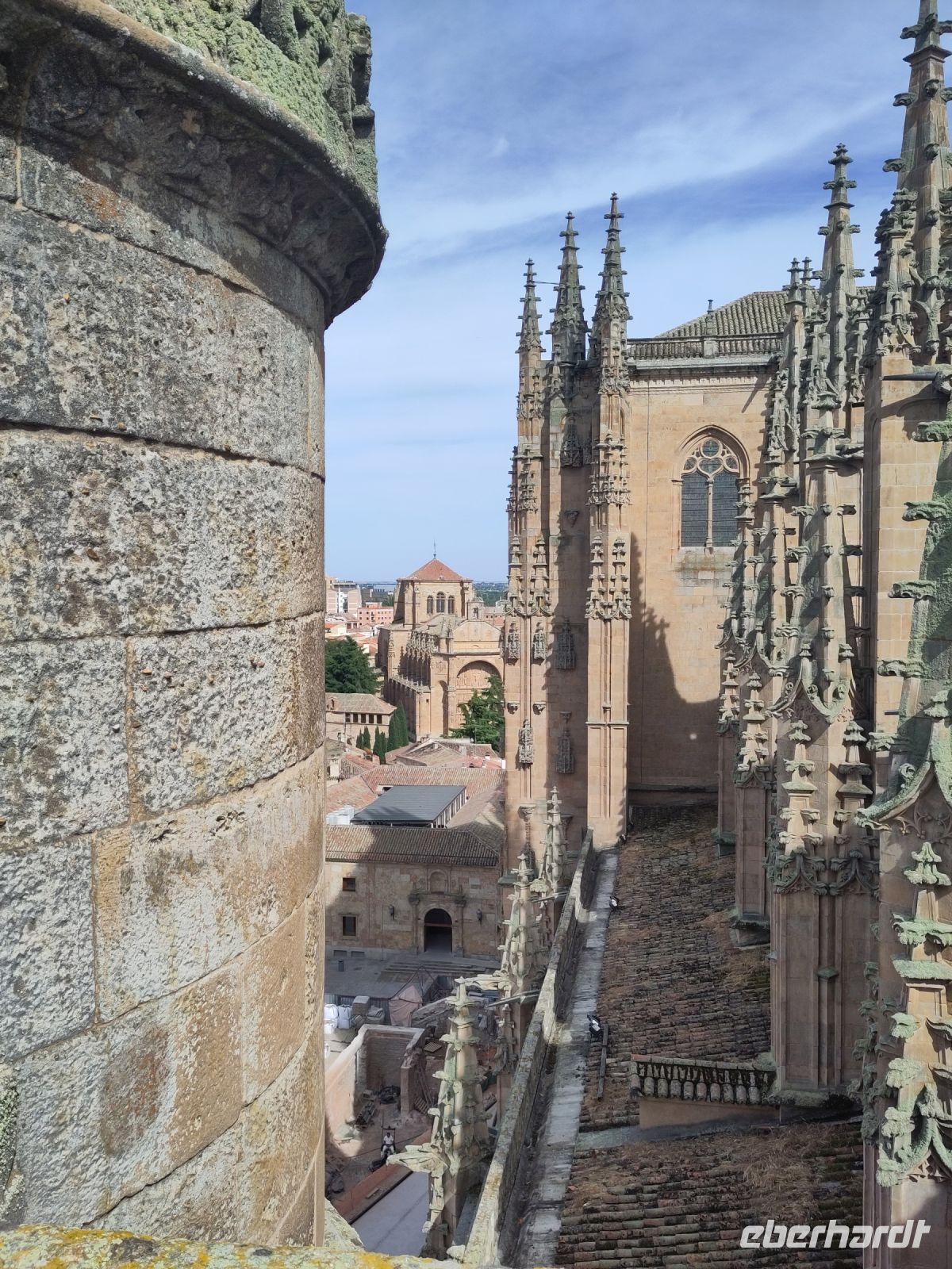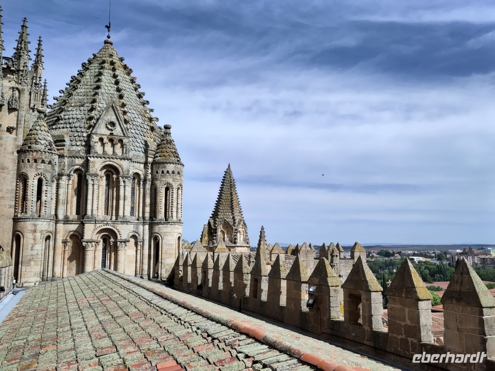 Zunächst führt Alicia uns zu einem kleinen Aussichtspunkt ganz in der Nähe unseres Hotels, damit wir die Dimensionen von Clerecía und Kathedrale wahrnehmen können, denn wenn man einmal in der Stadt ist, sagt sie, verschwinden die Gebäude fast. Zumindest lassen sich ihre Dimensionen nicht mehr so leicht erahnen.