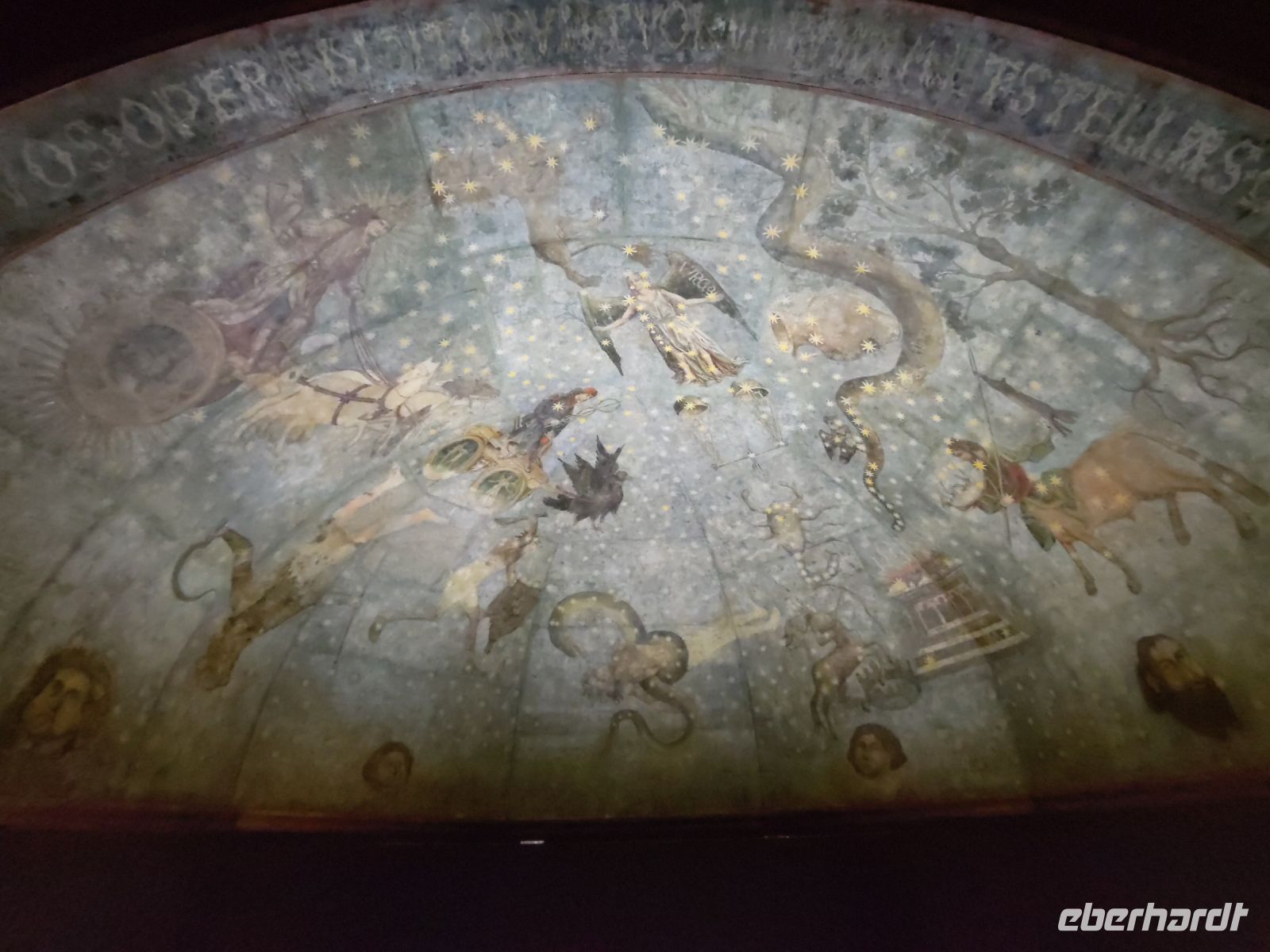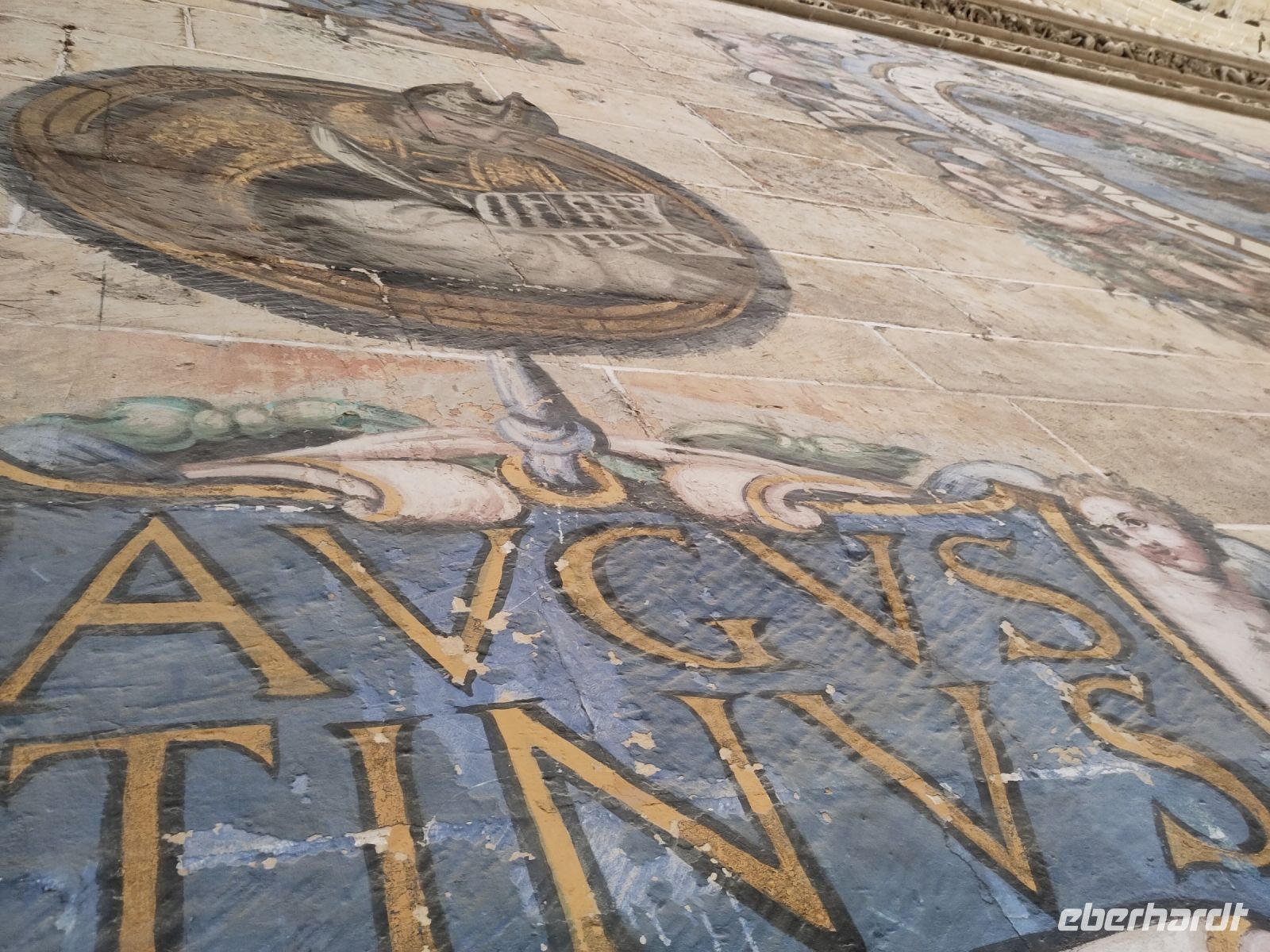 Dann besichtigen wir die Bibliothek, sehen arabische, aramäische, griechische und lateinische Schriften, aber auch das Schachzabelbuch Alfons des Weisen (+ 1284), diverse Geräte und natürlich verschiedene Fresken an der Decke der Bibliothek, welche die Sieben Freien Künste darstellen, dazwischen Anleihen an die römische Malerei, die in der Renaissance gerade „in“ waren. Wir hatten ähnliches auch schon in den Bourbonenpalästen gesehen, dort mit stilistischen Abweichungen, denn der Auftraggeber war Karl III. von Spanien, der zunächst König Neapels gewesen war und unter dessen Herrschaft die ersten Ausgrabungen in Pompei stattfanden, also 200 Jahre später. Die Malereien in Escorial orientieren sich an römischen Fresken aus Rom, die in den Bourbonenpalästen an Malereien aus dem 79 verschütteten Pompei. Den Unterschied erkennen vor allem die Spezialisten.