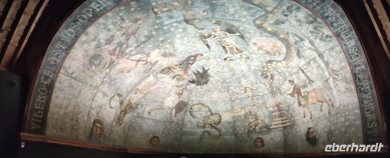 Im Anschluss folgen wir Salamancas "Schinkenstraße" der Calle Mayor, die Martinskirche (direkt dahinter die Plaza Mayor) und Kathedrale miteinander verbindet. Alicia zeigt uns einige Gebäude der Universität, und auch den Himmel von Salamanca (El cielo de Salamanca). Dieses Deckenfresko musste auf Befehl der Inquisition zerstört werden, und Kunsthistoriker dachten, das Werk sei verloren, doch vor einigen Jahren fand man heraus, dass schlicht ein Gewölbe vorgeblendet war und das Werk an sich zu einem Großteil noch erhalten ist. Menos mal (Umso besser)!