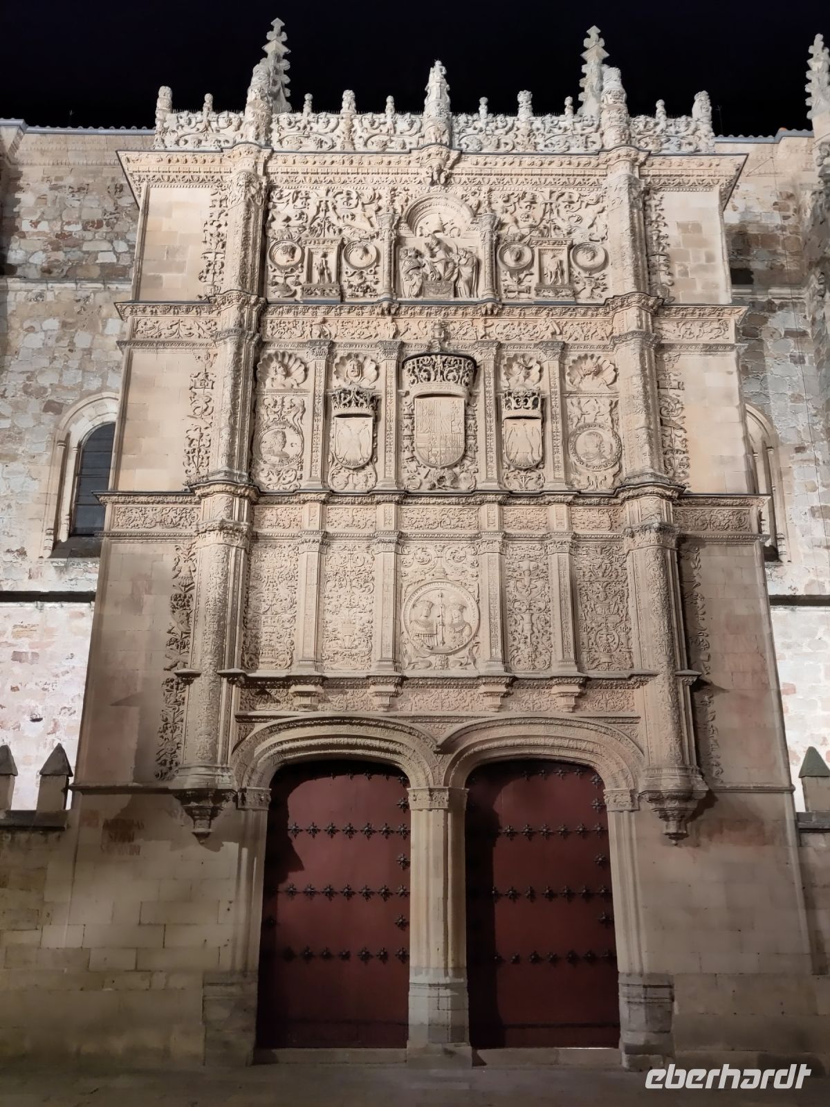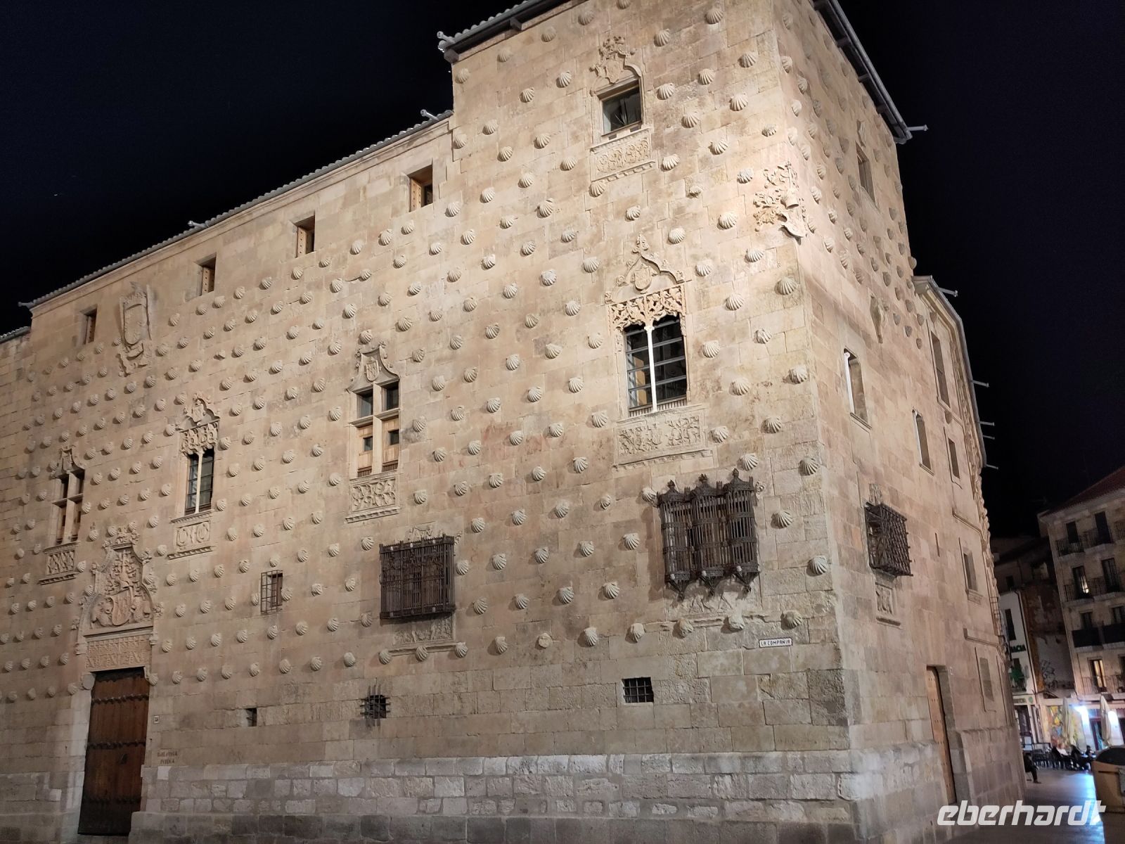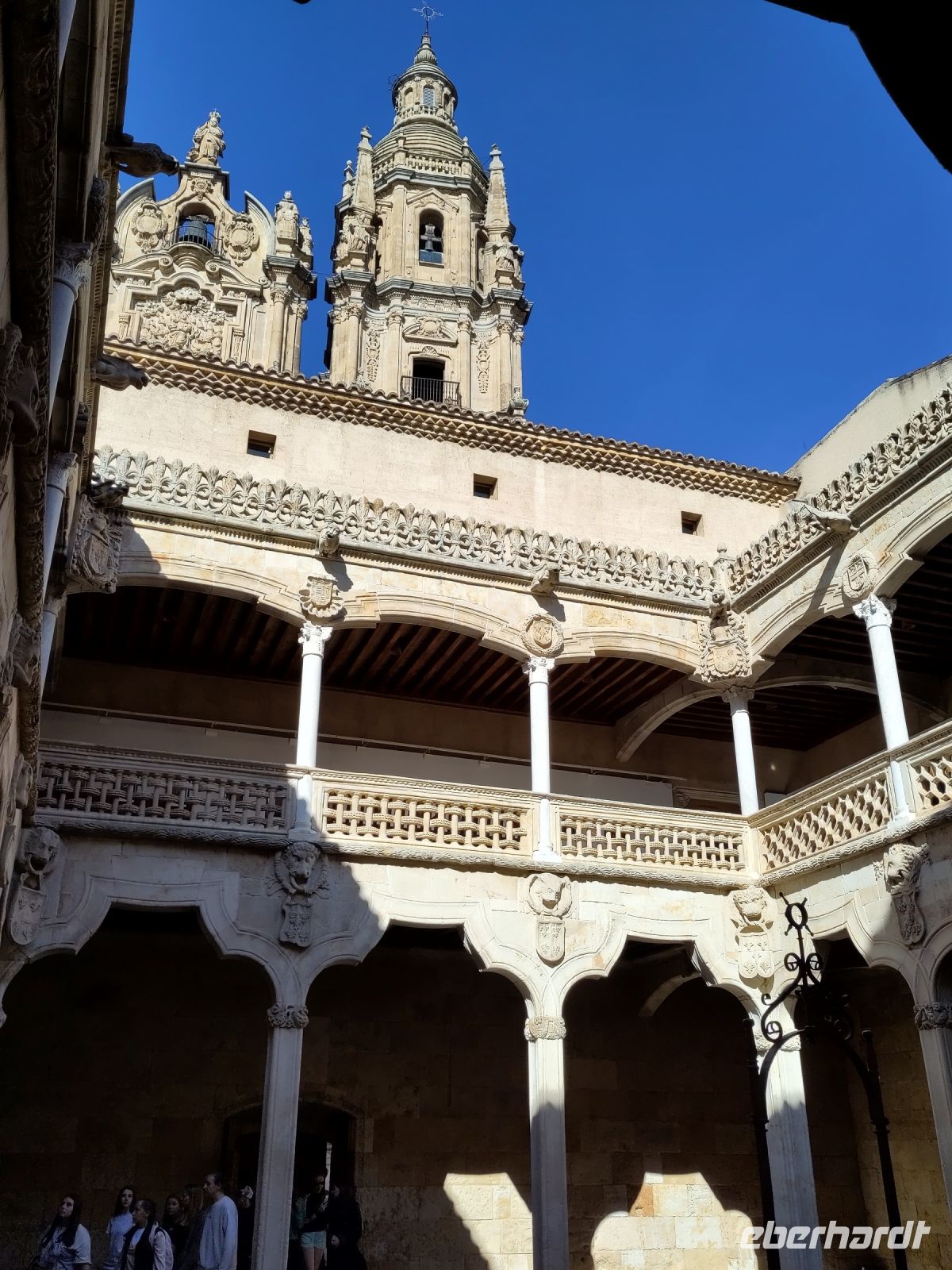 Alicia stellt uns auch Martín und Martina vor, wie sonst könnte das Storchenpaar wohl heißen, das seit Jahren den Turm der Martinskirche bezieht? Die Störche, die wir klappern hören, sitzen allerdings auf der Clerecía. Der gegenüber besuchen wir das Muschelhaus (Casa de la Concha), früher ein Adelspalast, heute die Stadtbibliothek von Salamanca. Die Gotik hat in Salamanca ihre eigene Bogenform entwickelt, von der wir hier ein erstes Beispiel sehen.