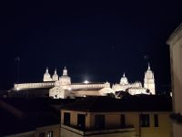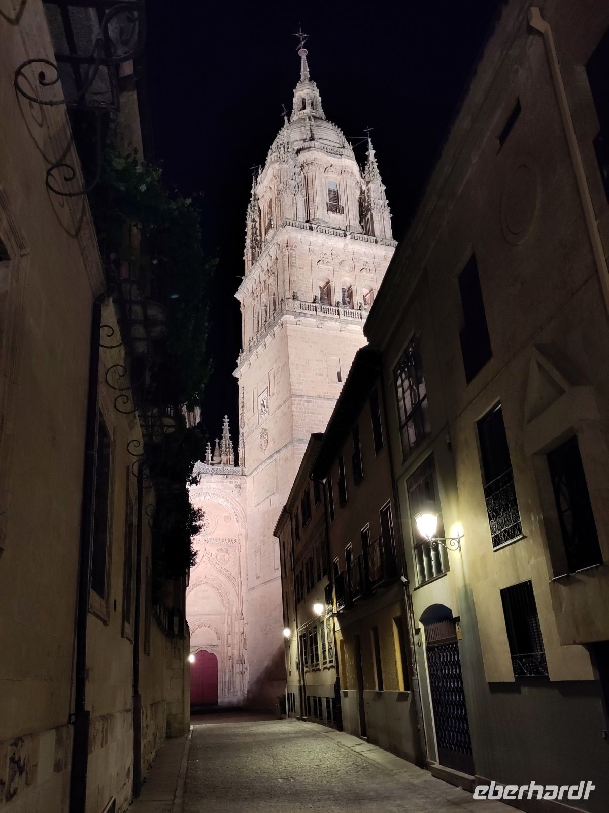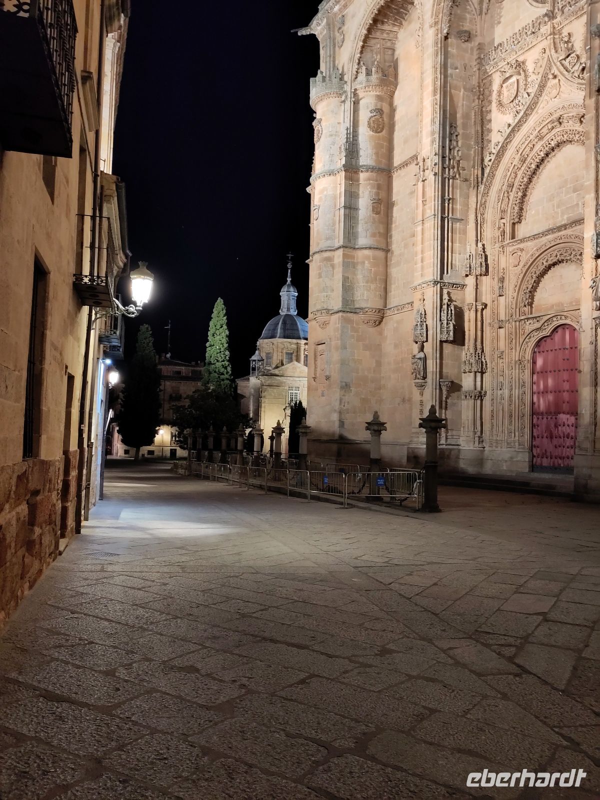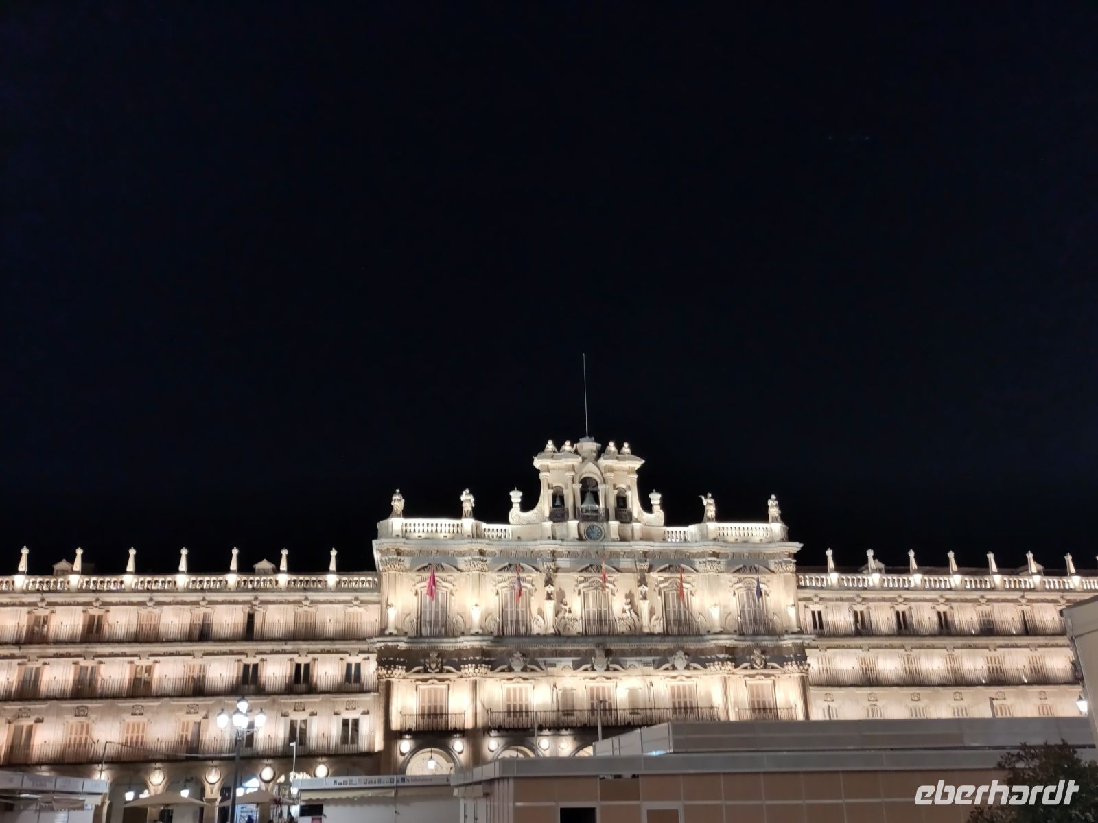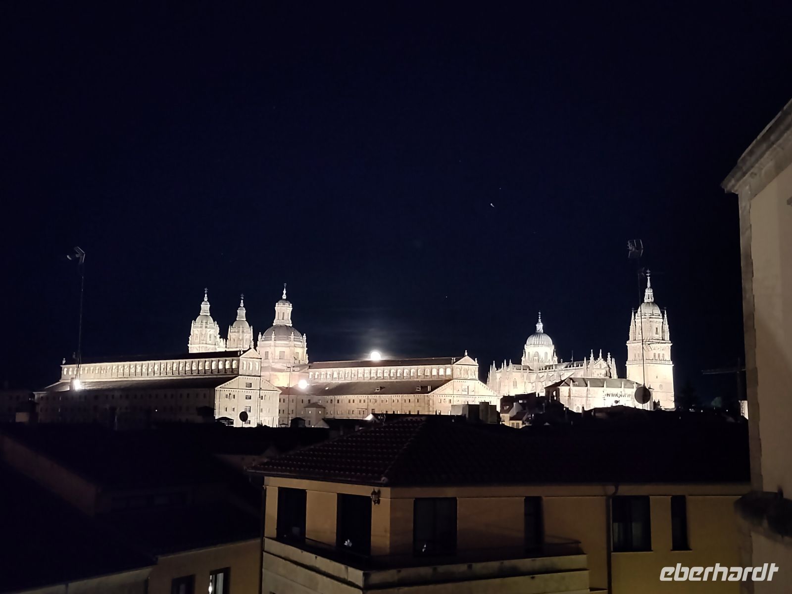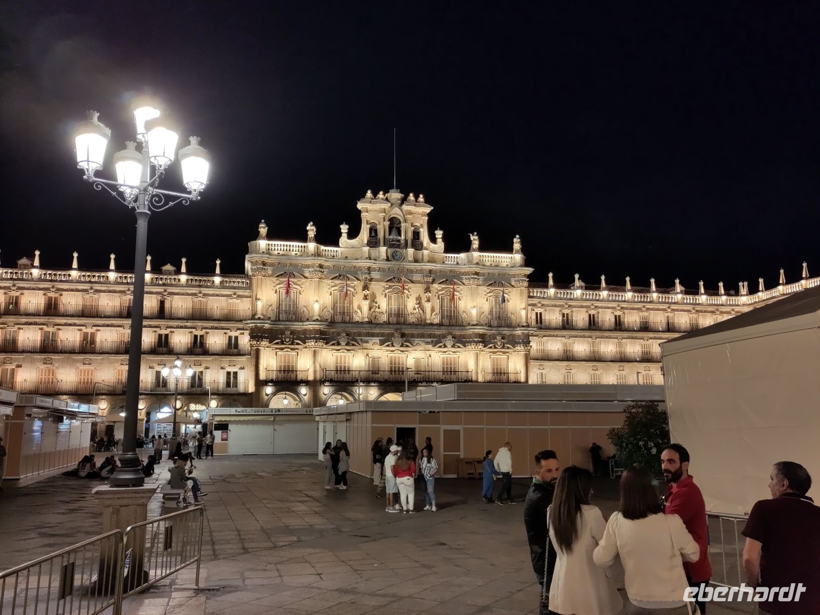 Am Abend kommen wir in Salamanca an, einige essen im Hotel, andere suchen sich etwas in der Stadt. Nach dem Essen machen wir zu dritt noch eine Runde an der Plaza Mayor vorbei, der Clerecía, der Universität und der Kathedrale. Leider müssen wir feststellen, dass auf der Plaza Mayor eine Büchermesse stattfindet (Feria del libro), das nimmt uns natürlich ein bisschen die Sicht auf diese Plaza Mayor, die als schönste Spaniens gilt.