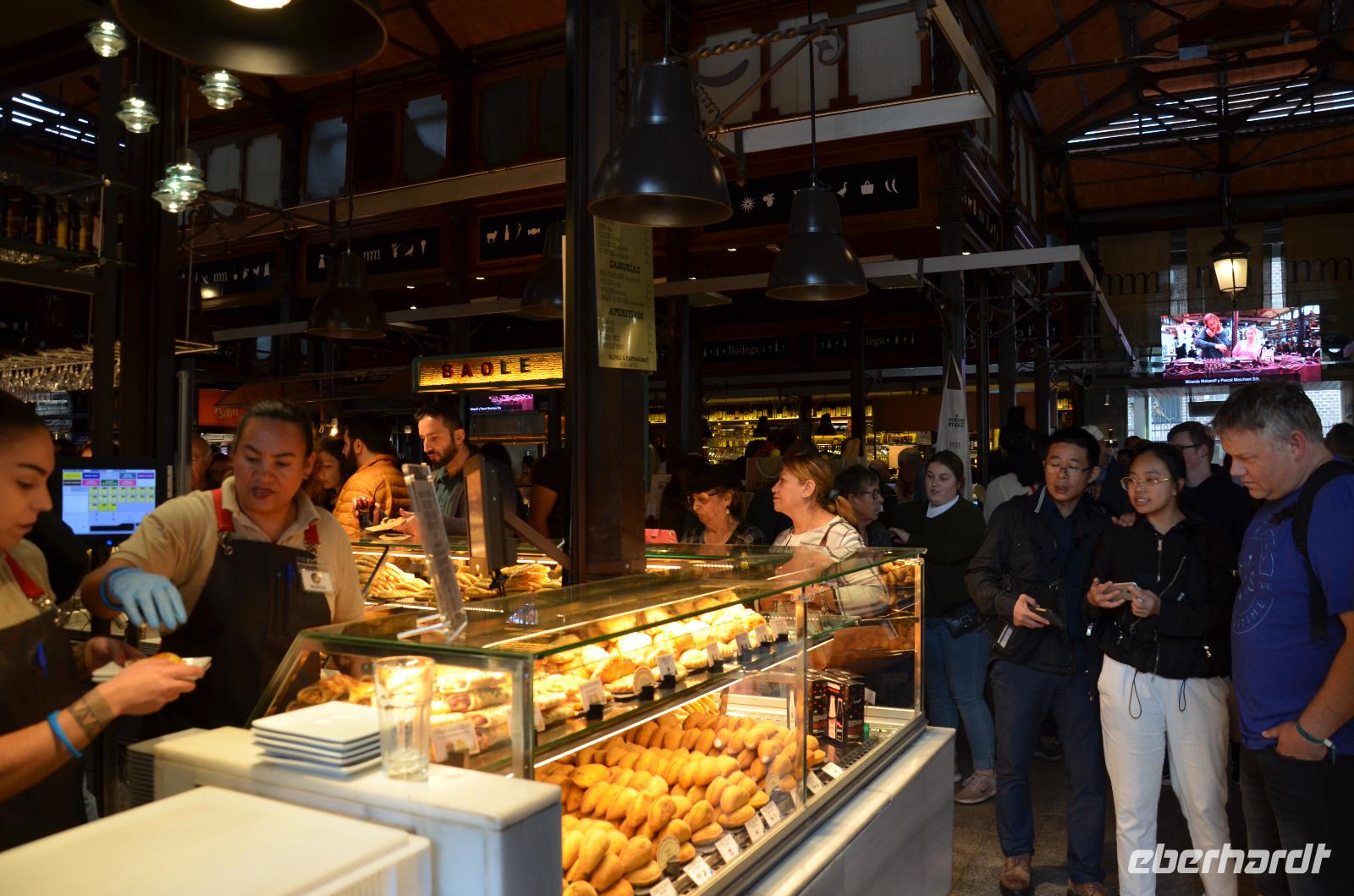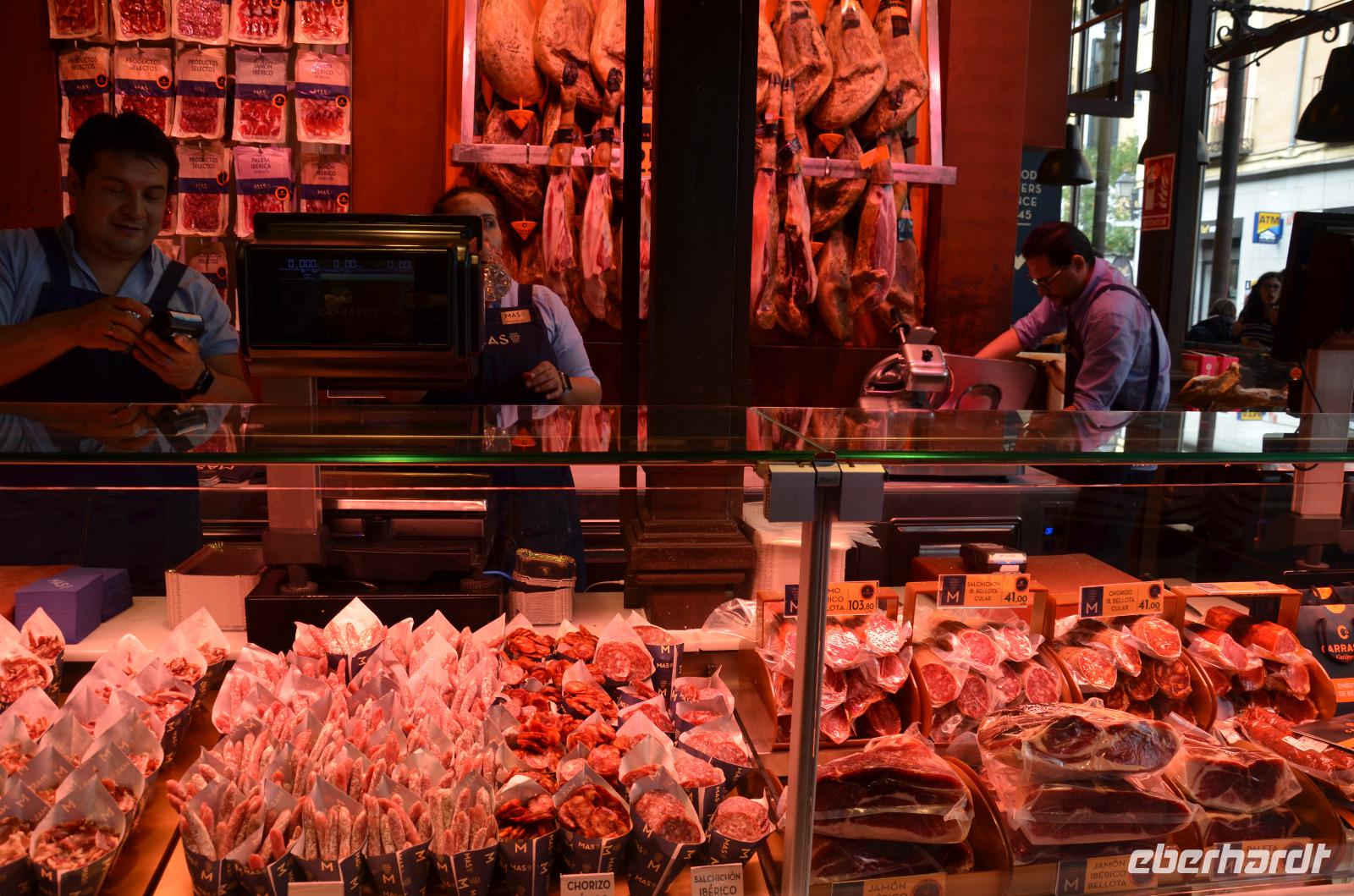 Nach einer kurzen Verschnaufpause stürzen wir uns auch schon in das Getümmel der Stadt. Während die kleine Straße direkt vor unserem Hotel noch ruhig wirkt, strömen die Menschenmassen auf der angrenzenden Einkaufsstraße nur so daher. Wir mischen uns unauffällig mit darunter und lassen uns treiben. Auf der großen Prachtstraße, der „Gran Vía", angelangt, reiht sich ein Geschäft ans andere. Da wir trotz Oktober einen wundervoll, sommerlichen Abend genießen können, ist der Bummel eine wahre Freude, zumal es mehr als ausreichend zu bestaunen gibt. Nur mit einem haben wir nach wie vor unsere Probleme - entgegen der deutschen Gegebenheiten, sind hier auf den Fußwegen Fußgängerampeln versteckt. Durch die vielen Menschen sind die Seitenstraßen schlecht auszumachen und da sich niemand an die Ampelphasen hält, eben auch die Ampeln. So passiert es hin und wieder, dass wir die „Straße" bei Kirschgrün überqueren und erst damit konfrontiert werden, als Autofahrer erbost hupen. Wir geloben allerdings Besserung oder zumindest die Bemühung darum :). Im Restaurant „El Jamón de Gran Vía" angekommen, erwartet uns bereits eine große, eingedeckte Tafel. Da dies ein typisch spanisches Tapas-Restaurant ist, verwundert es nicht, dass überall die großen Schinken als Auslage, aber auch zur Dekoration prangen. Genau diese testen wir als Vorspeise, neben Käsespezialitäten und Tortillas. Und als der Magen schon fast voll ist, kommt die üppige Hauptspeise in Form von gebratenem Rindfleisch mit den traditionellen Pimientos. Als wir unser Einstiegsmahl langsam abschließen, füllt sich das Restaurant zusehends mit Gästen. Die spanische Mentalität was die Essenszeiten betrifft, ist halt doch eine völlig andere. Wir haben also die spanischen Köstlichkeiten genossen und probiert, aber angenehm zur deutschen Abendbrotzeit. Im Anschluss bummeln wir noch etwas durch die Stadt, lauschen Musikanten, bestaunen den riesigen Mond und genießen einfach nur das elektrisierende Flair der belebten Stadt.