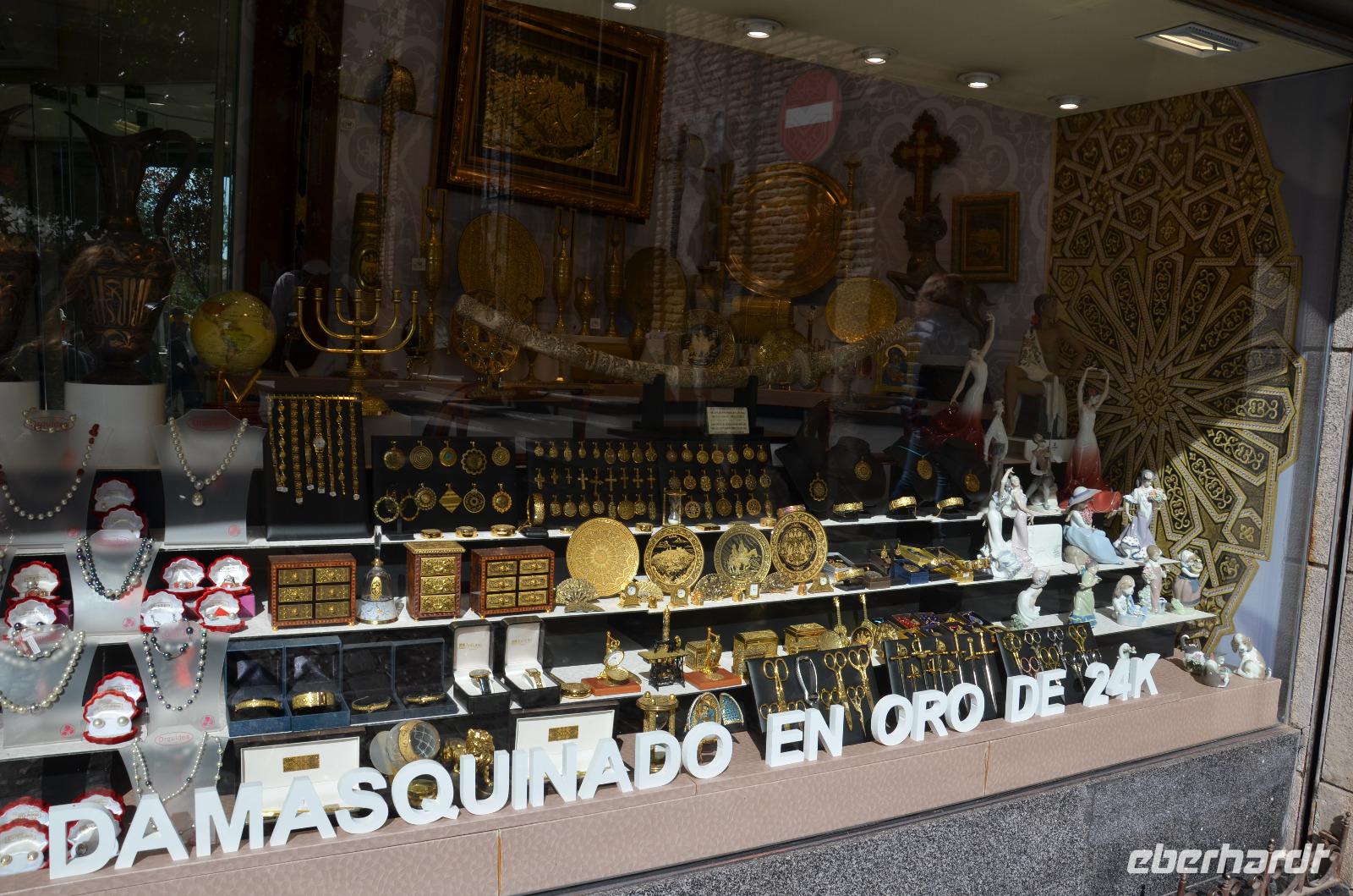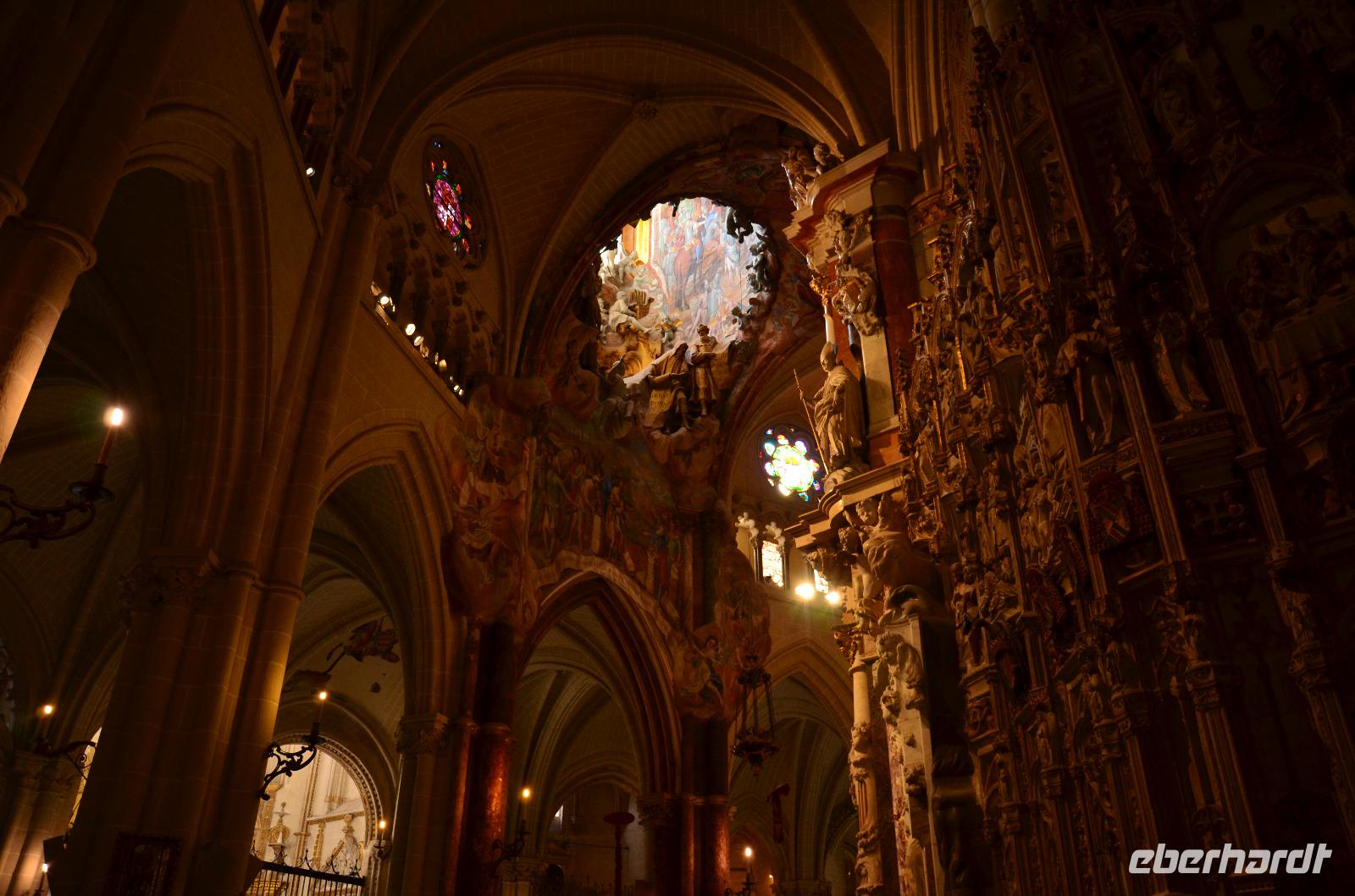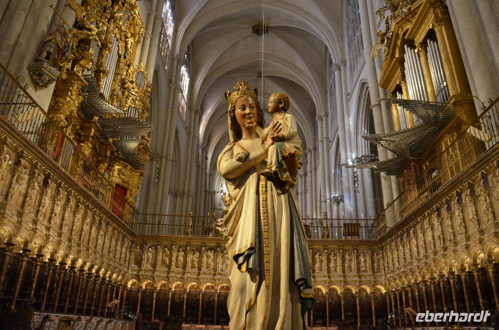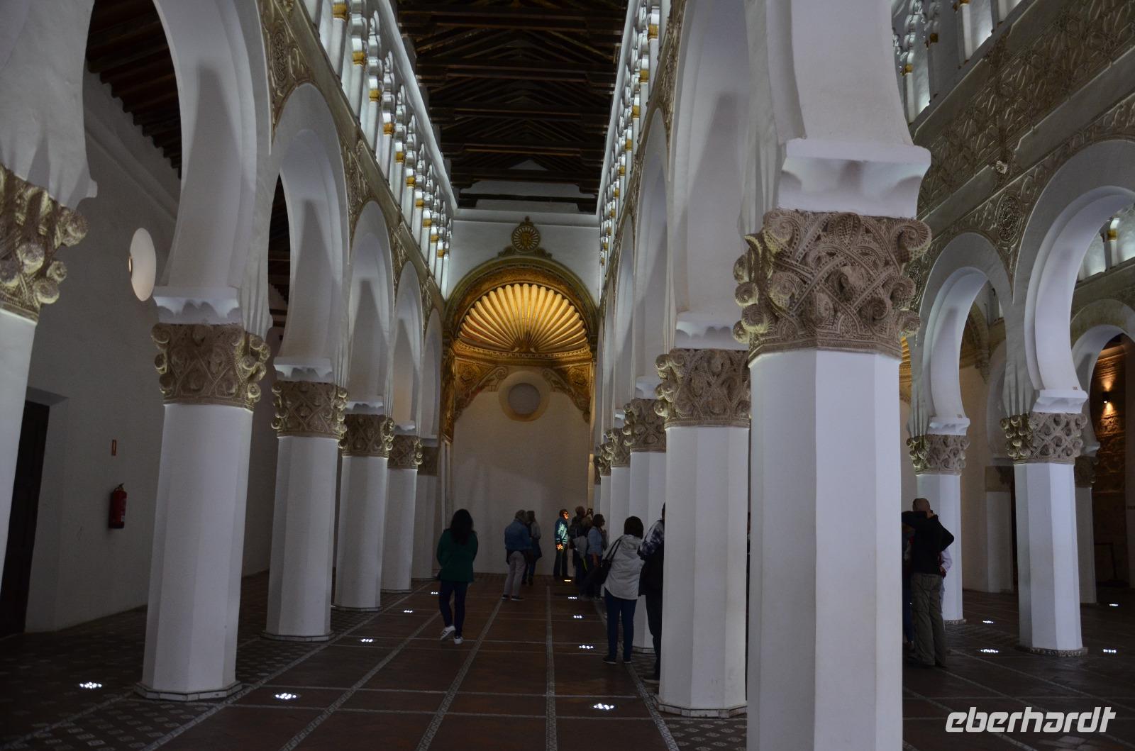 Toledo - am Fluss Tajo gelegen, ist eine facettenreiche Kulturstadt mit insgesamt 16 „Barrios". Hier kommen drei Weltreligionen zusammen, die den größten Teil der Geschichtsschreibung friedlich nebeneinander bestanden haben. Unser erster Eindruck bildet sich, als wir einen Fotostopp auf einer Anhöhe außerhalb der Stadt machen und einen spektakulären Blick auf die Stadtkulisse genießen können. Im Anschluss beginnen wir unseren ereignisreichen Stadtrundgang am „Bisagra Tor". Nach einer Fahrt mit den unzähligen Rolltreppen, schlängeln wir uns durch die kleinen, süßen Gassen der Stadt, die immer wieder mit traditionellen Läden gesäumt sind. Die Haupthandwerke sind dabei die Töpfereikunst, die Marzipanherstellung, die Goldschmiedekunst und insbesondere die Damaszener Edelmetallkunst sowie die Stahlherstellung und -verarbeitung zu edlen und kunstvollen Produkten wie Dolchen oder Messern. Was also Souvenir-Einkäufe anbelangt, bleibt hier kein Wunsch unerfüllt und man könnte mit Leichtigkeit einige Tage hier verbringen, ohne sich zu langweilen. Kulturell sticht Toledo ebenso hervor. Hier steigen wir mit der „Kathedrale von Toledo" ein oder der „Catedral de Santa María de la Asunción de Toledo", wie sie im Spanischen heißt, die als Hauptwerk der spanischen Gotik gilt. Auch hier könnte man sich in den zahlreichen, prunkvoll ausgestatteten Räumen über Stunden verlieren, wobei jede Passage des Anwesens ganz anders gestaltet ist. Wir erleben einen Abriss und besichtigen unter anderem den Hauptaltar, den Chorraum mit seinen eindrucksvollen Orgeln, das Bischofsgrab und zahlreiche Nebenräume, die von ausgeklügelten Deckenmalereien geprägt sind. Durch die große Bedeutung dieser Kathedrale hängen in vielen Räumlichkeiten auch Kunstschätze großer, spanischer Maler. Der Haupteingang des eindrucksvollen Bauwerks öffnet nur ein Mal im Jahr an Fronleichnam seine massiven Türen. Direkt gegenüber auf dem „Plaza del Consistorio" befindet sich das Rathaus von Toledo. Nach einer ausgiebigen Besichtigung der Kathedrale begeben wir uns ins „Jüdische Viertel" der Stadt, welches unübersehbar auf den Pflastersteinen der Straße vermerkt ist. Hier stoppen wir in einem Juweliergeschäft und können einem Meister seiner Kunst hautnah über die Schulter schauen. Das Handwerk der Damaszener Edelmetallkunst ist vom Aussterben bedroht, da sich die Jugend wenig für diese filigrane und anspruchsvolle Arbeit begeistern kann. Schön anzuschauen ist der Schmuck auf jeden Fall! Von der Qualität der Töpfereikunst können wir uns im folgenden Laden überzeugen und schon geht es weiter zum nächsten kulturellen Höhepunkt - der Synagoge „Santa María La Blanca". Ganz einfach und ganz schlicht erstrahlt sie in einem völlig anderen Licht, als die prunkvolle Kathedrale. Der Gegensatz könnte nicht größer sein. Die einstige Synagoge wurde zu Anfang des 15. Jahrhunderts nach zahlreichen Übergriffen auf das Jüdische Viertel, die die Abwanderung seiner Bewohner zur Folge hatte, an den Calatravaorden übergeben und avancierte somit zur katholischen Kirche. Heute dient sie ausschließlich als Museum.