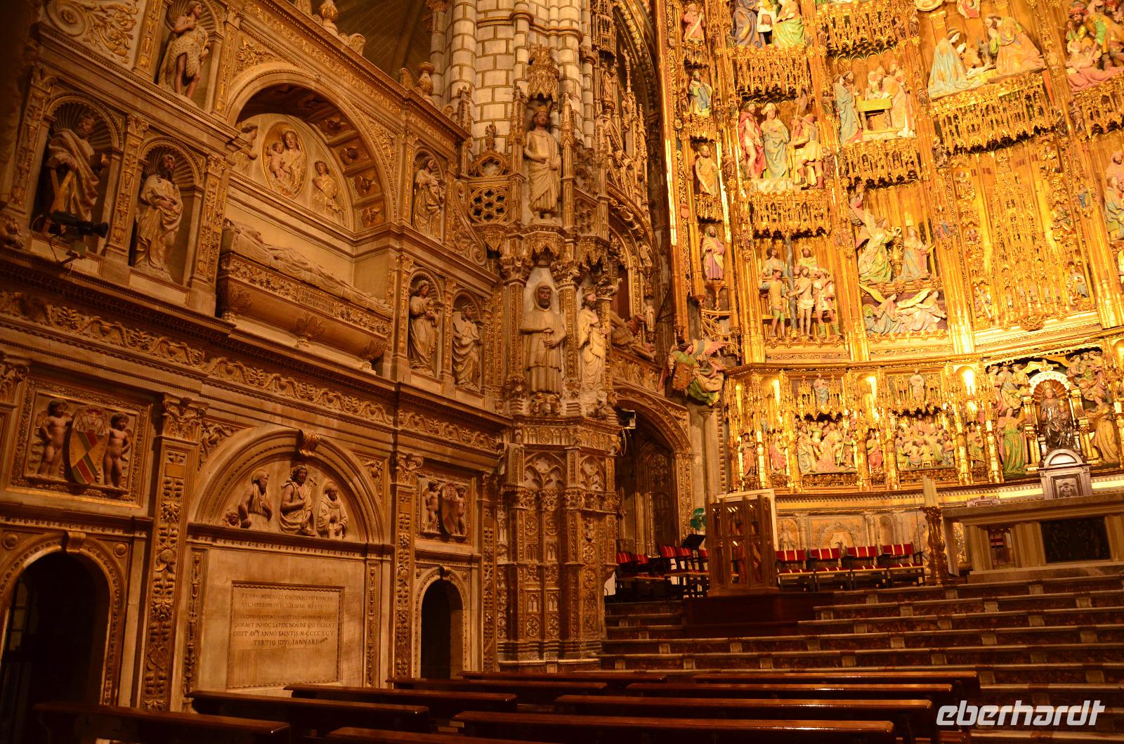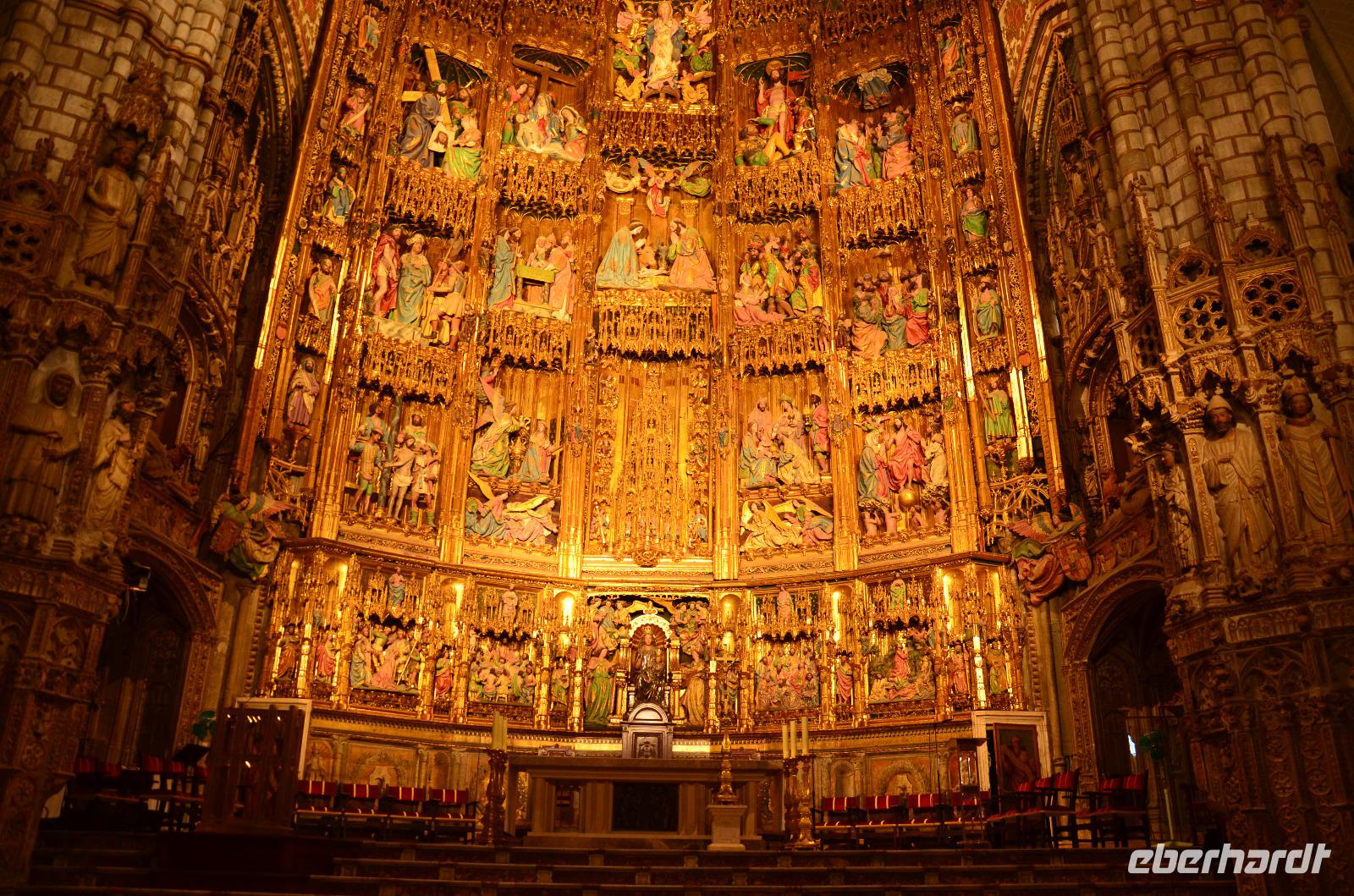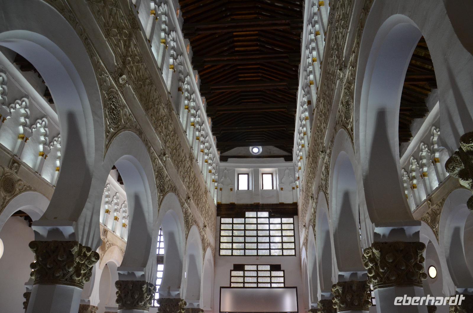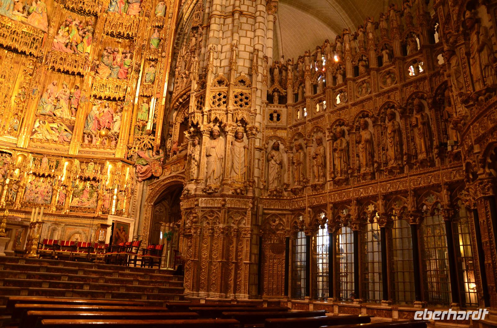 Toledo - am Fluss Tajo gelegen, ist eine facettenreiche Kulturstadt mit insgesamt 16 „Barrios". Hier kommen drei Weltreligionen zusammen, die den größten Teil der Geschichtsschreibung friedlich nebeneinander bestanden haben. Unser erster Eindruck bildet sich, als wir einen Fotostopp auf einer Anhöhe außerhalb der Stadt machen und einen spektakulären Blick auf die Stadtkulisse genießen können. Im Anschluss beginnen wir unseren ereignisreichen Stadtrundgang am „Bisagra Tor". Nach einer Fahrt mit den unzähligen Rolltreppen, schlängeln wir uns durch die kleinen, süßen Gassen der Stadt, die immer wieder mit traditionellen Läden gesäumt sind. Die Haupthandwerke sind dabei die Töpfereikunst, die Marzipanherstellung, die Goldschmiedekunst und insbesondere die Damaszener Edelmetallkunst sowie die Stahlherstellung und -verarbeitung zu edlen und kunstvollen Produkten wie Dolchen oder Messern. Was also Souvenir-Einkäufe anbelangt, bleibt hier kein Wunsch unerfüllt und man könnte mit Leichtigkeit einige Tage hier verbringen, ohne sich zu langweilen. Kulturell sticht Toledo ebenso hervor. Hier steigen wir mit der „Kathedrale von Toledo" ein oder der „Catedral de Santa María de la Asunción de Toledo", wie sie im Spanischen heißt, die als Hauptwerk der spanischen Gotik gilt. Auch hier könnte man sich in den zahlreichen, prunkvoll ausgestatteten Räumen über Stunden verlieren, wobei jede Passage des Anwesens ganz anders gestaltet ist. Wir erleben einen Abriss und besichtigen unter anderem den Hauptaltar, den Chorraum mit seinen eindrucksvollen Orgeln, das Bischofsgrab und zahlreiche Nebenräume, die von ausgeklügelten Deckenmalereien geprägt sind. Durch die große Bedeutung dieser Kathedrale hängen in vielen Räumlichkeiten auch Kunstschätze großer, spanischer Maler. Der Haupteingang des eindrucksvollen Bauwerks öffnet nur ein Mal im Jahr an Fronleichnam seine massiven Türen. Direkt gegenüber auf dem „Plaza del Consistorio" befindet sich das Rathaus von Toledo. Nach einer ausgiebigen Besichtigung der Kathedrale begeben wir uns ins „Jüdische Viertel" der Stadt, welches unübersehbar auf den Pflastersteinen der Straße vermerkt ist. Hier stoppen wir in einem Juweliergeschäft und können einem Meister seiner Kunst hautnah über die Schulter schauen. Das Handwerk der Damaszener Edelmetallkunst ist vom Aussterben bedroht, da sich die Jugend wenig für diese filigrane und anspruchsvolle Arbeit begeistern kann. Schön anzuschauen ist der Schmuck auf jeden Fall! Von der Qualität der Töpfereikunst können wir uns im folgenden Laden überzeugen und schon geht es weiter zum nächsten kulturellen Höhepunkt - der Synagoge „Santa María La Blanca". Ganz einfach und ganz schlicht erstrahlt sie in einem völlig anderen Licht, als die prunkvolle Kathedrale. Der Gegensatz könnte nicht größer sein. Die einstige Synagoge wurde zu Anfang des 15. Jahrhunderts nach zahlreichen Übergriffen auf das Jüdische Viertel, die die Abwanderung seiner Bewohner zur Folge hatte, an den Calatravaorden übergeben und avancierte somit zur katholischen Kirche. Heute dient sie ausschließlich als Museum.