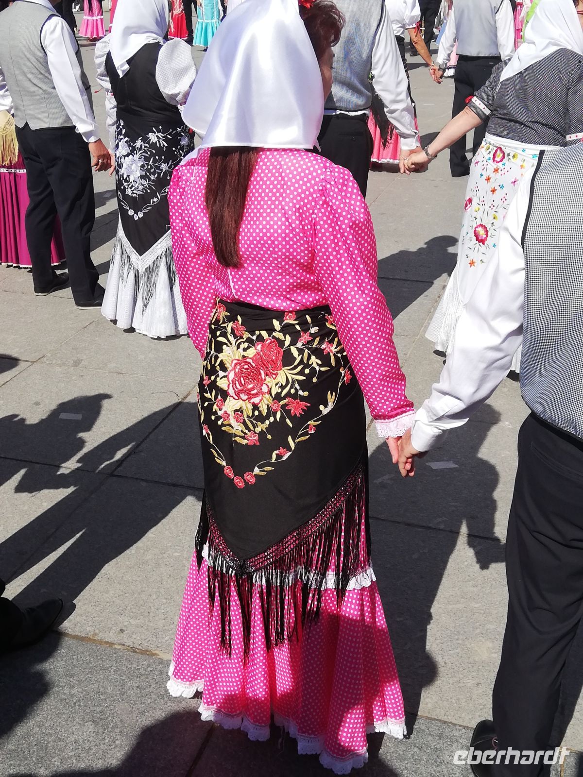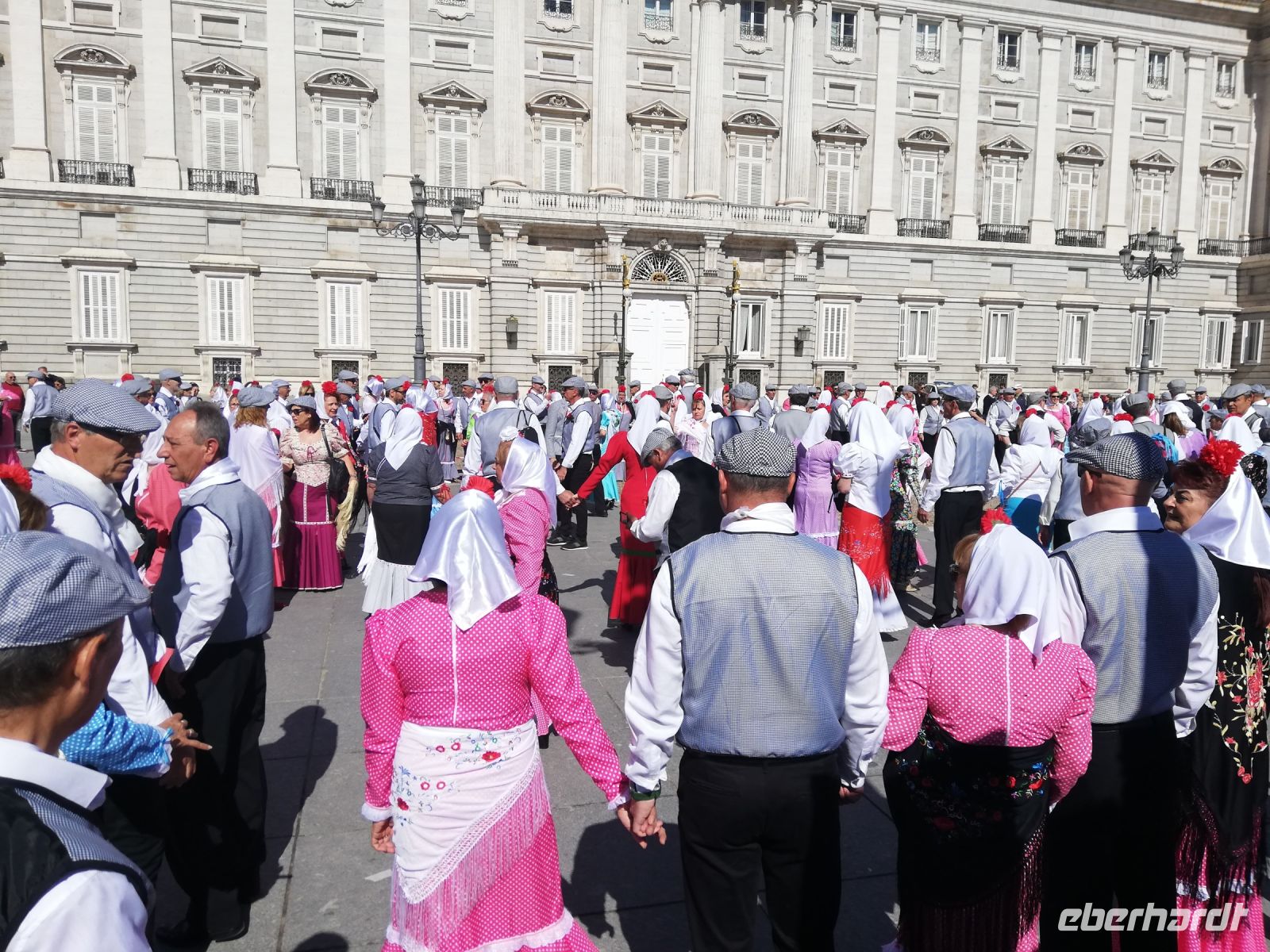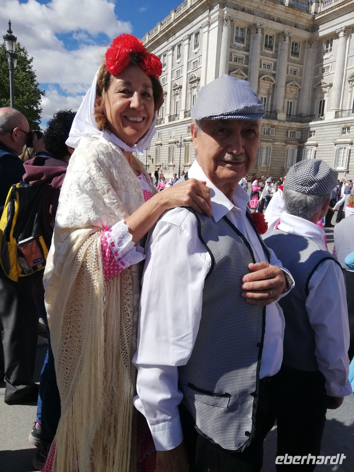 Langsam nähern wir uns der Plaza Oriental und stehen vor dem Palacio Real de Madrid. Hier legen wir noch eine kleine Pause ein. Die Madrilenen feiern Ihren Schutzpatron, den heiligen Isidor. Vor dem Palacio hat sich eine Gruppe von ca. 200 Volkstänzern in „Madrilener Tracht“ für den Auftritt versammelt. Die Tänzer folgen den Anweisungen des „Dirigenten“ und nehmen Ihre Position ein.