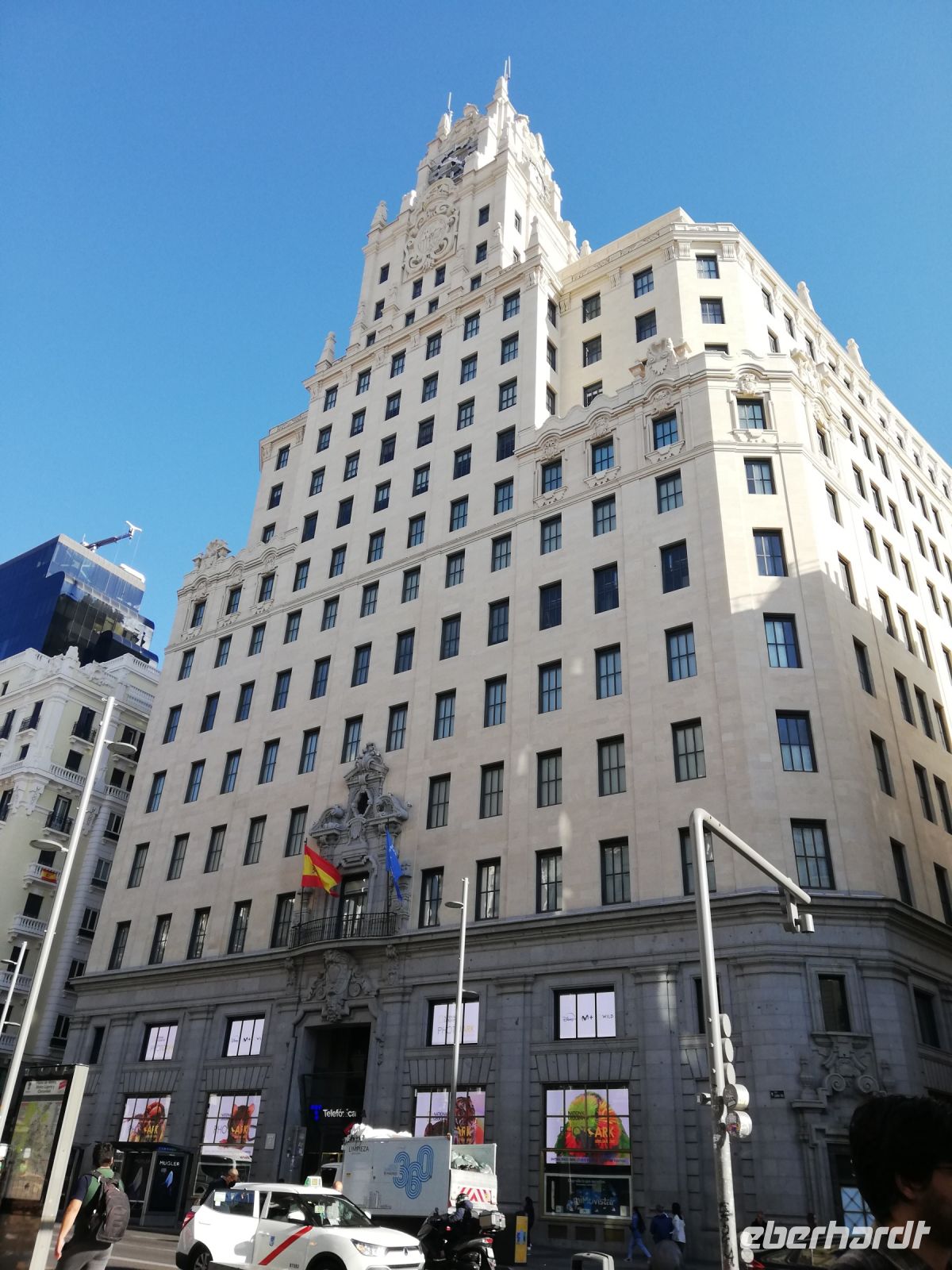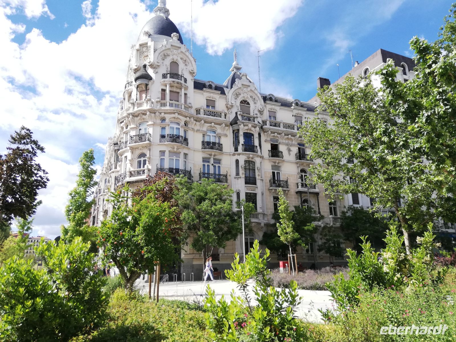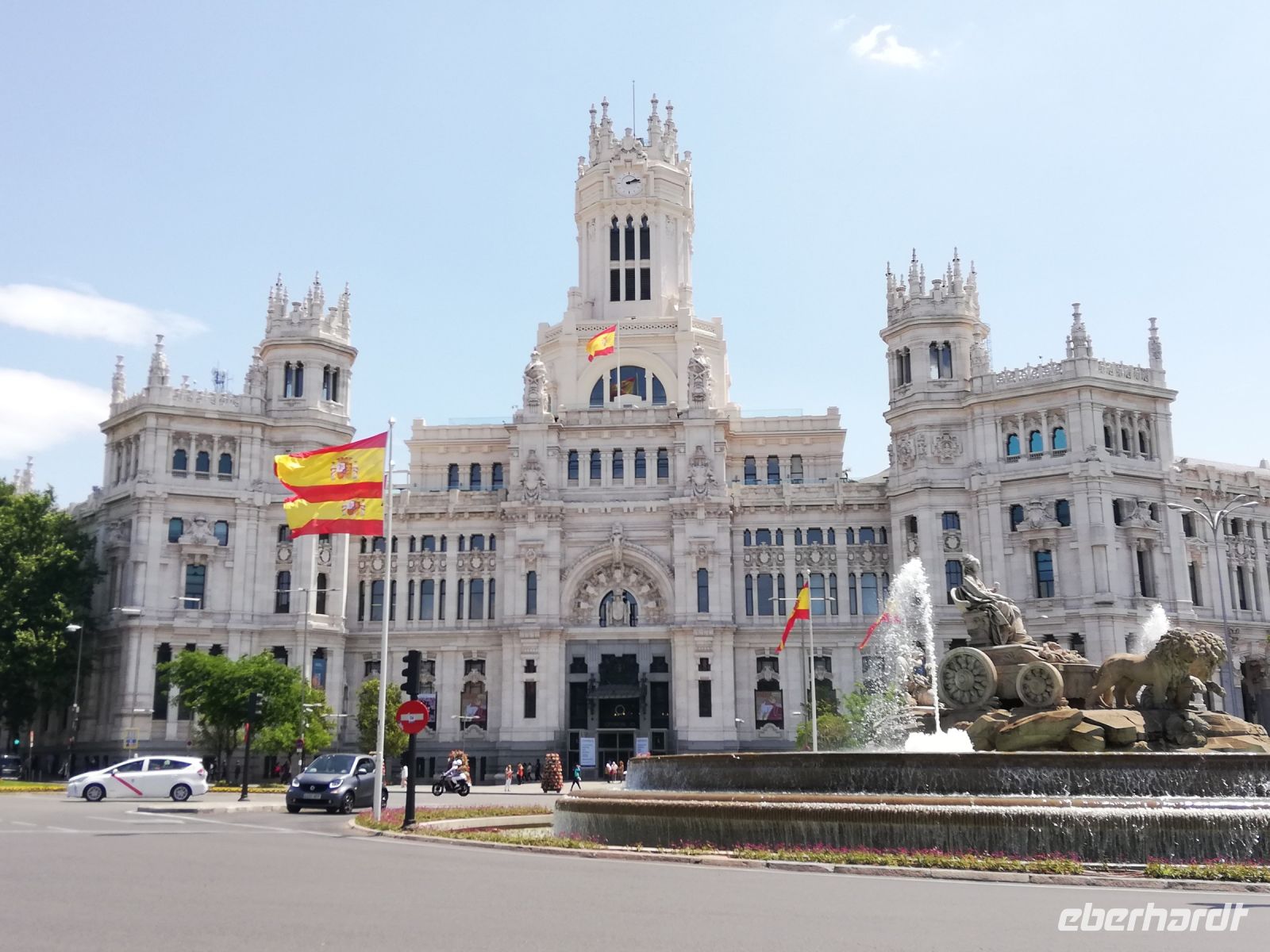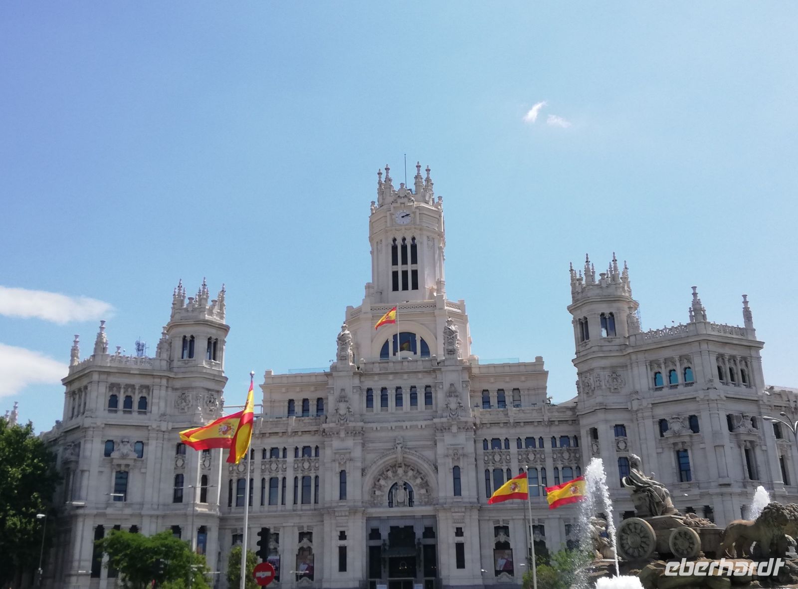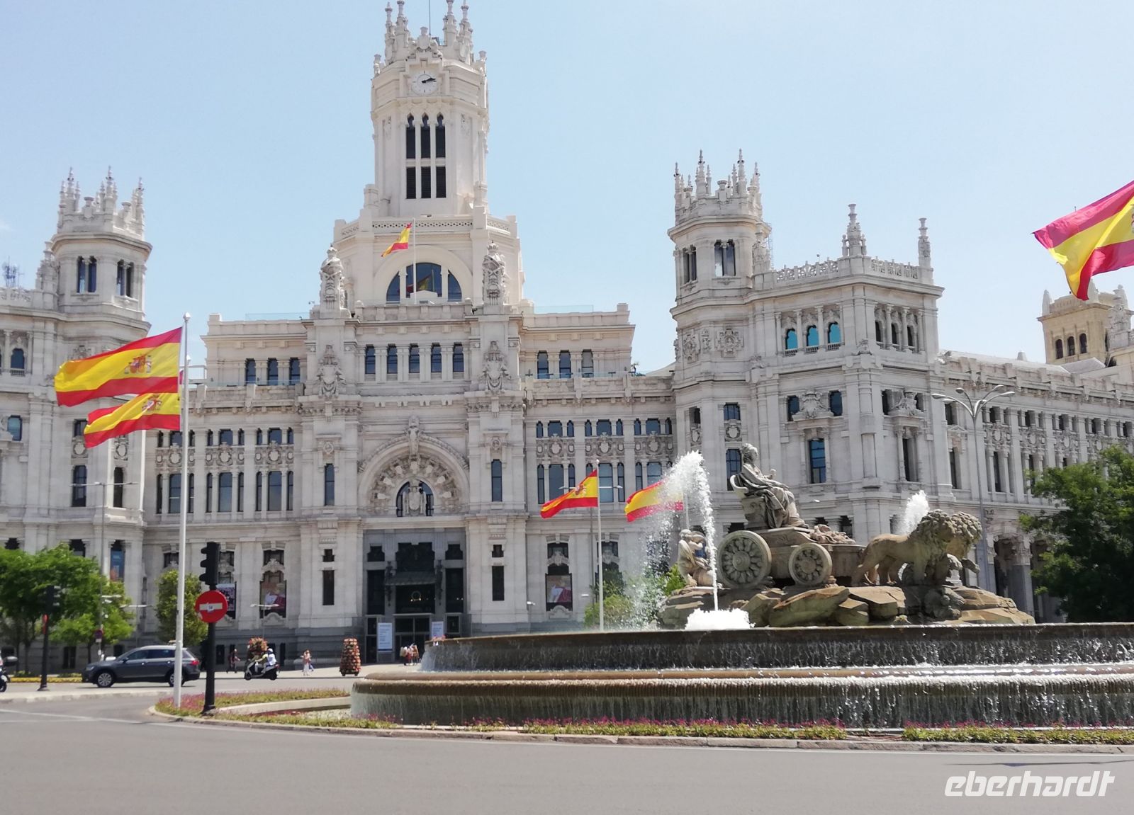 Etwas müde kommen wir wieder in die sonnenüberfluteten Grünanlagen des Parks am „Paseo de Prado“ an der Neptuno und Apolo Fontaine vorbei zu „Plaza de Cibeles“ mit „Fuente de Cibeles“. Es ist der griechischen Göttin Kybele gewidmet, welche für die Erde, die Landwirtschaft und die Fruchtbarkeit steht. Das „Palacio Cibeles“, erbaut 1919 (früher Palacio de Comunicaciones) ist heute der Sitz der Stadtverwaltung von Madrid und nicht nur für mich eines der schönsten, wenn nicht „Das schönste“ Gebäude von Madrid. Hier verabschieden wir uns von Thomas und versuchen bei dem wunderbaren „Bilderbuch-Wetter“ das Palacio zu fotografieren. Etwas schwierig, das sehr viel Verkehr durch den großen Kreisel fliest. Aber wir haben ein paar schöne Fotos „im Kasten“. Dann laufen wir einzeln die Gran Via hoch Richtung Hotel und nach einer kleinen Erfrischung haben wir uns eine kleine Siesta im Hotel verdient.