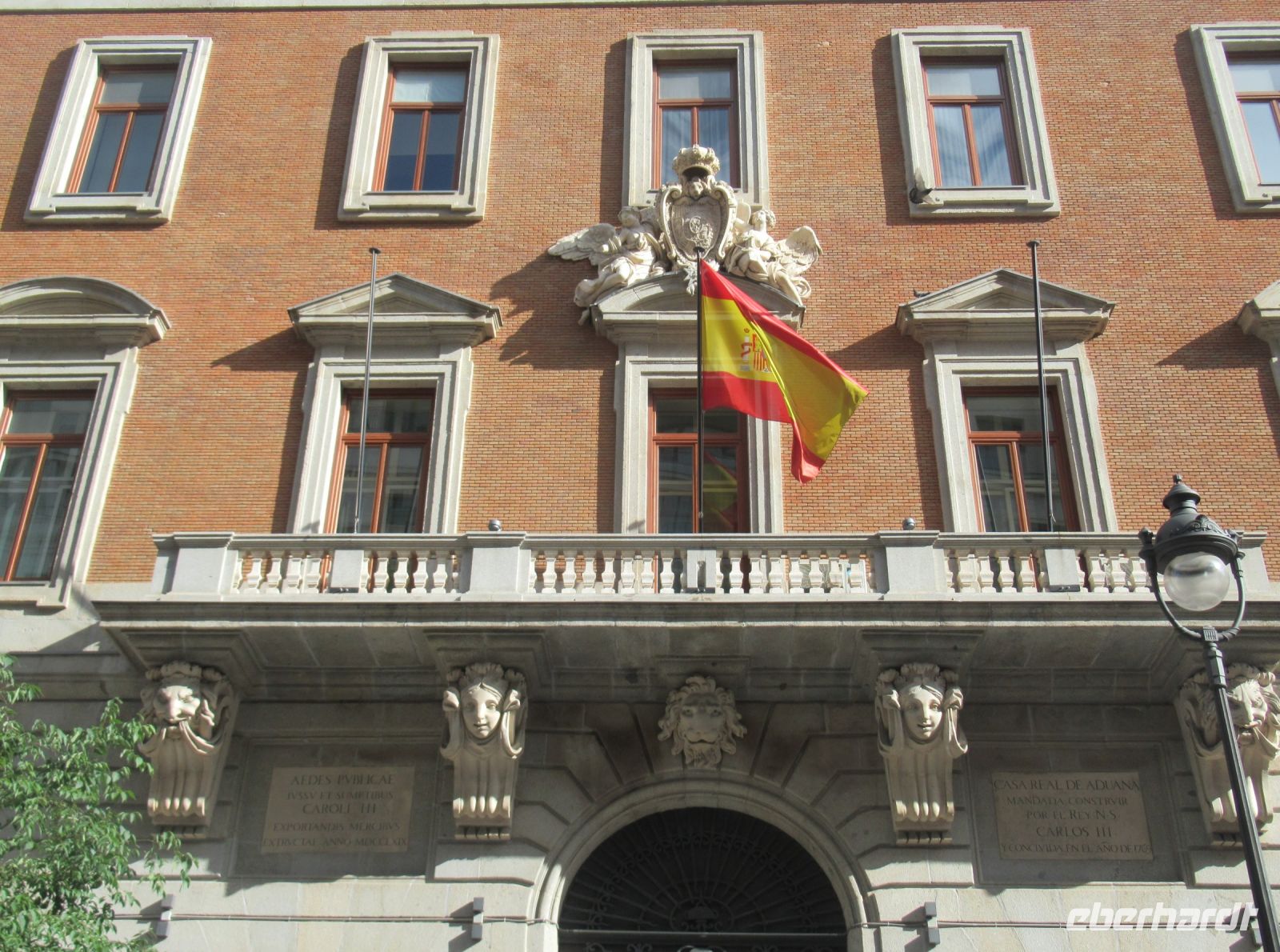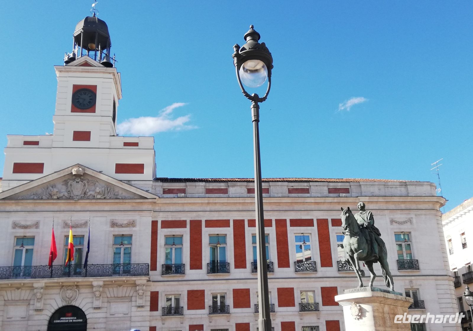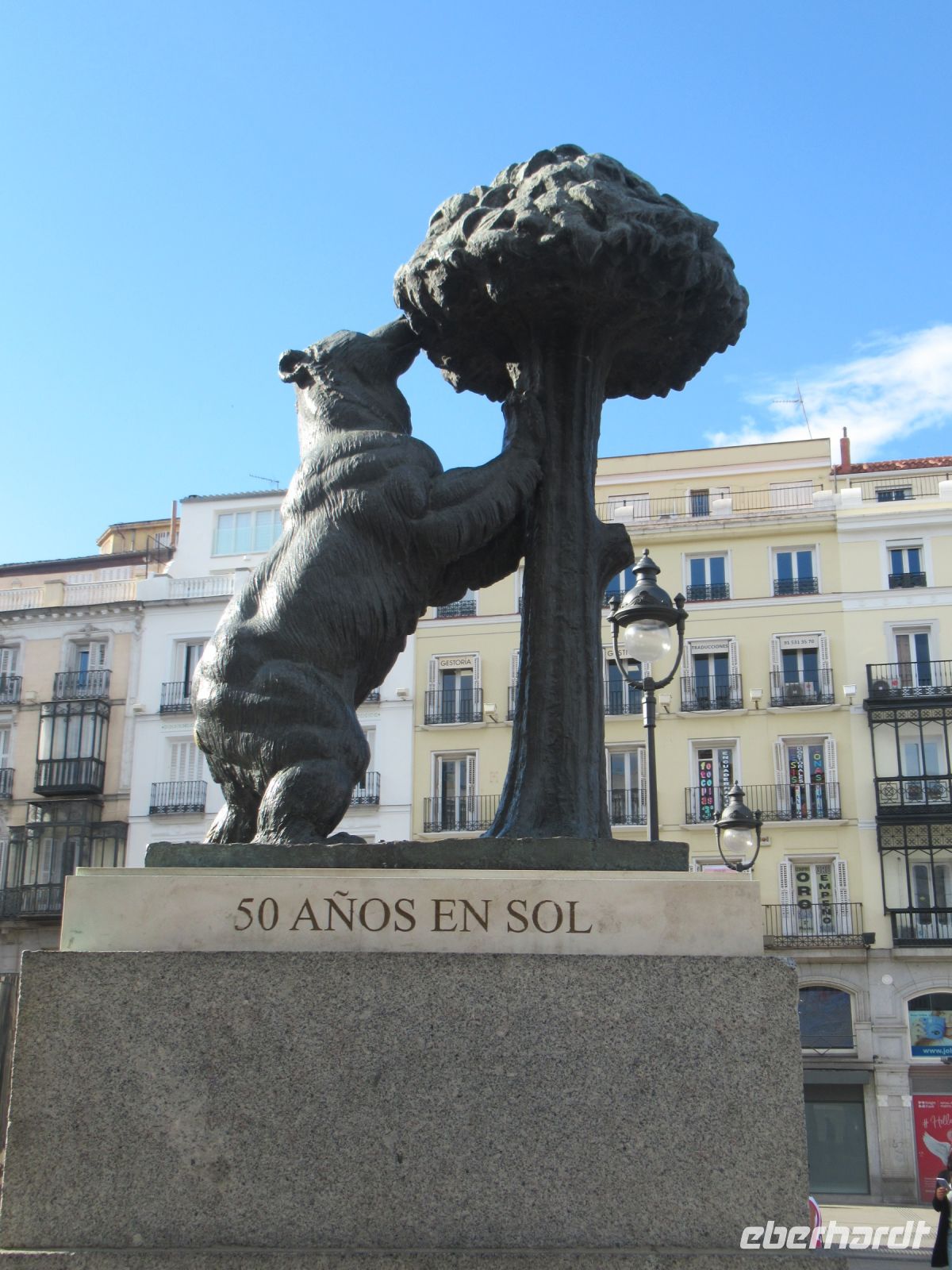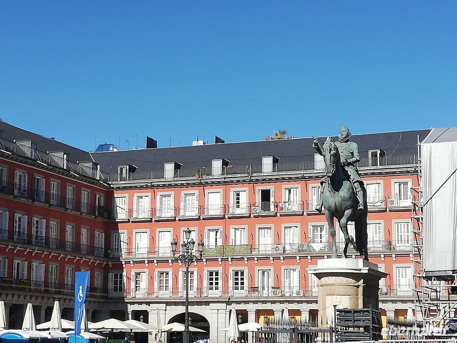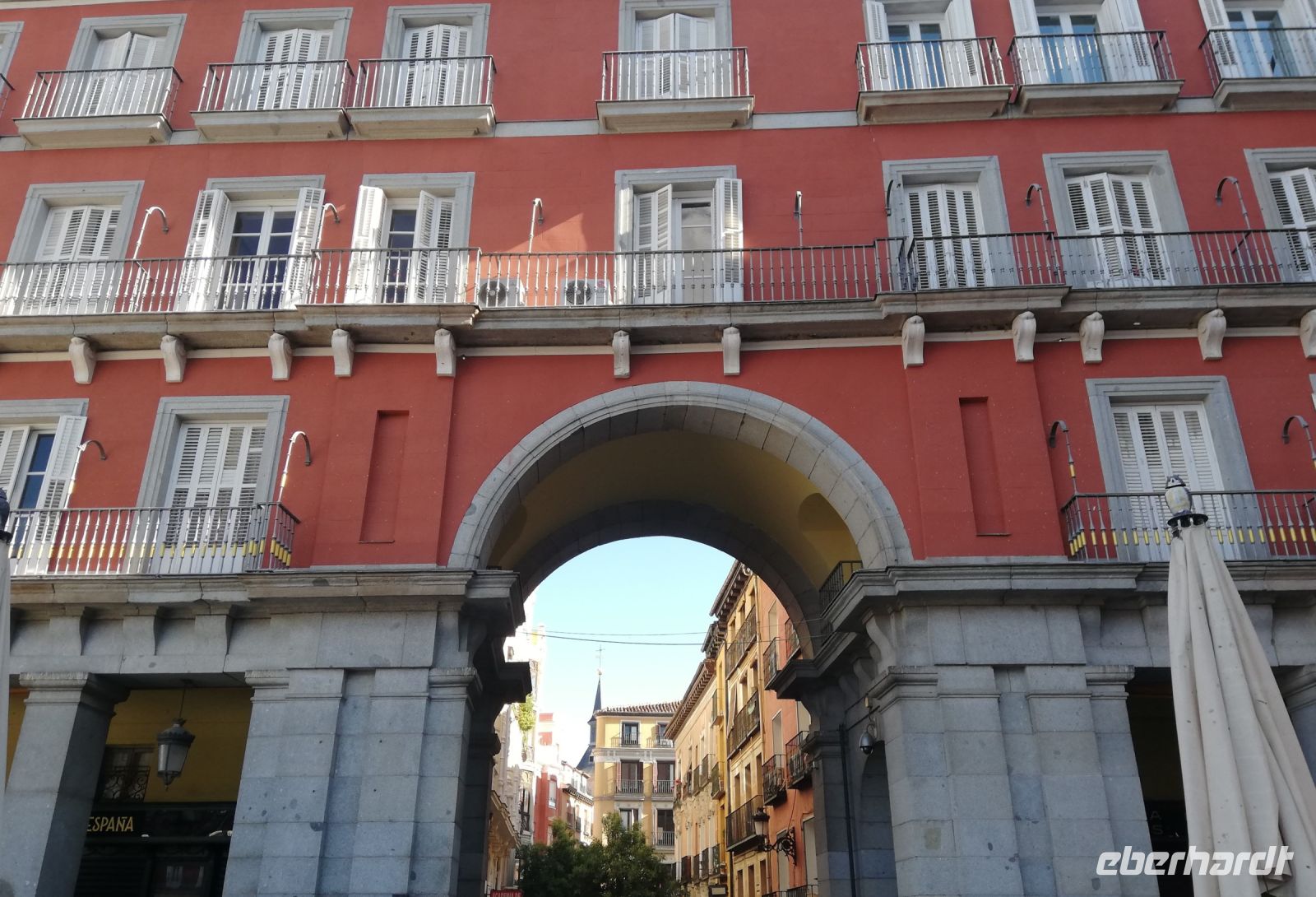 Hier steht auch die Reiterstatue von Carlos III. und an einer anderen Stelle das Symbol der Stadt Madrid: der Bär der sich gegen einen Erdbeerbaum reckt. (Erdbeerbaum auf spanisch – Madroño). Wir gelangen auf den größten Platz Madrids – „Plaza Mayor“ dem historischen Zentrum der Stadt.