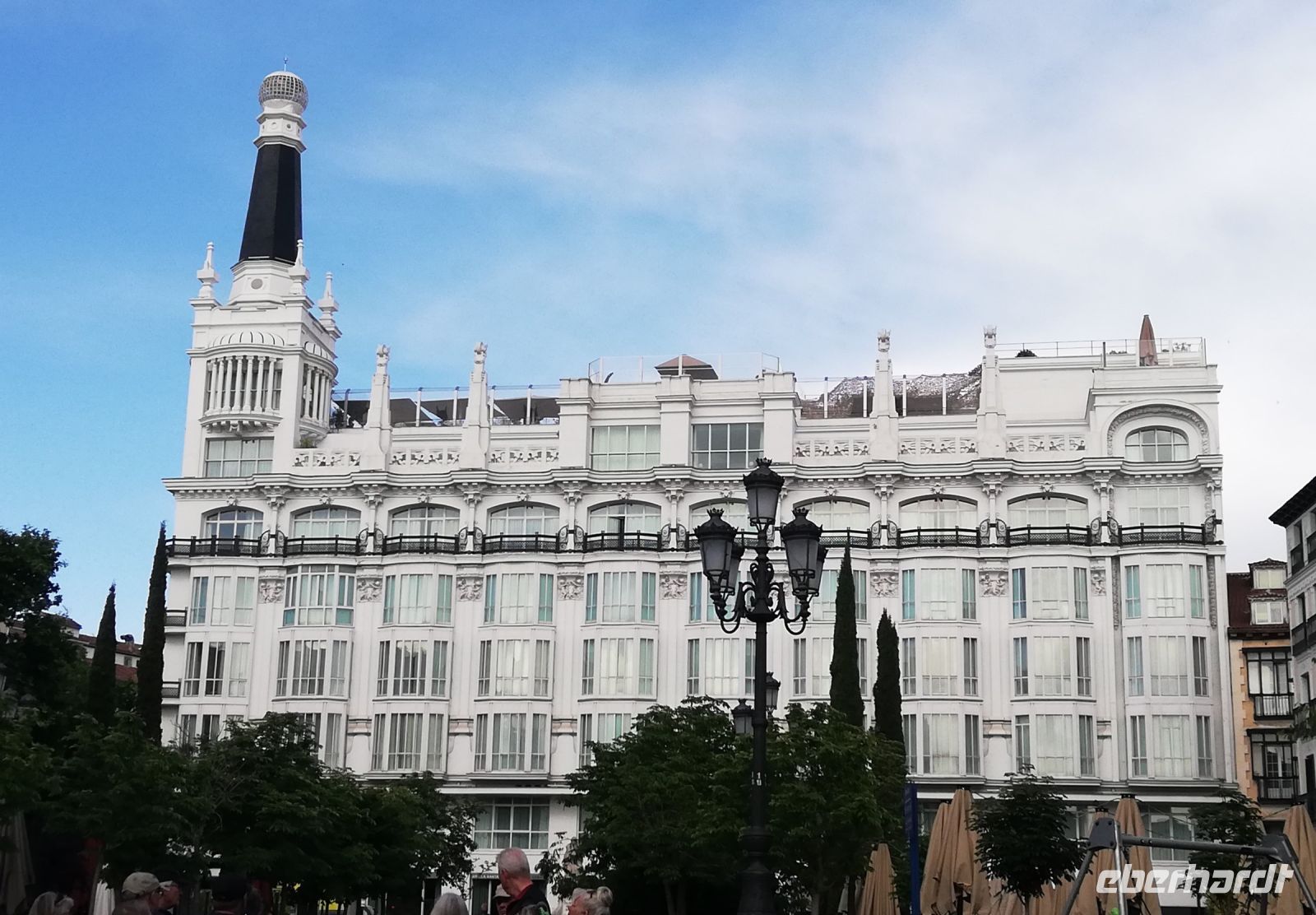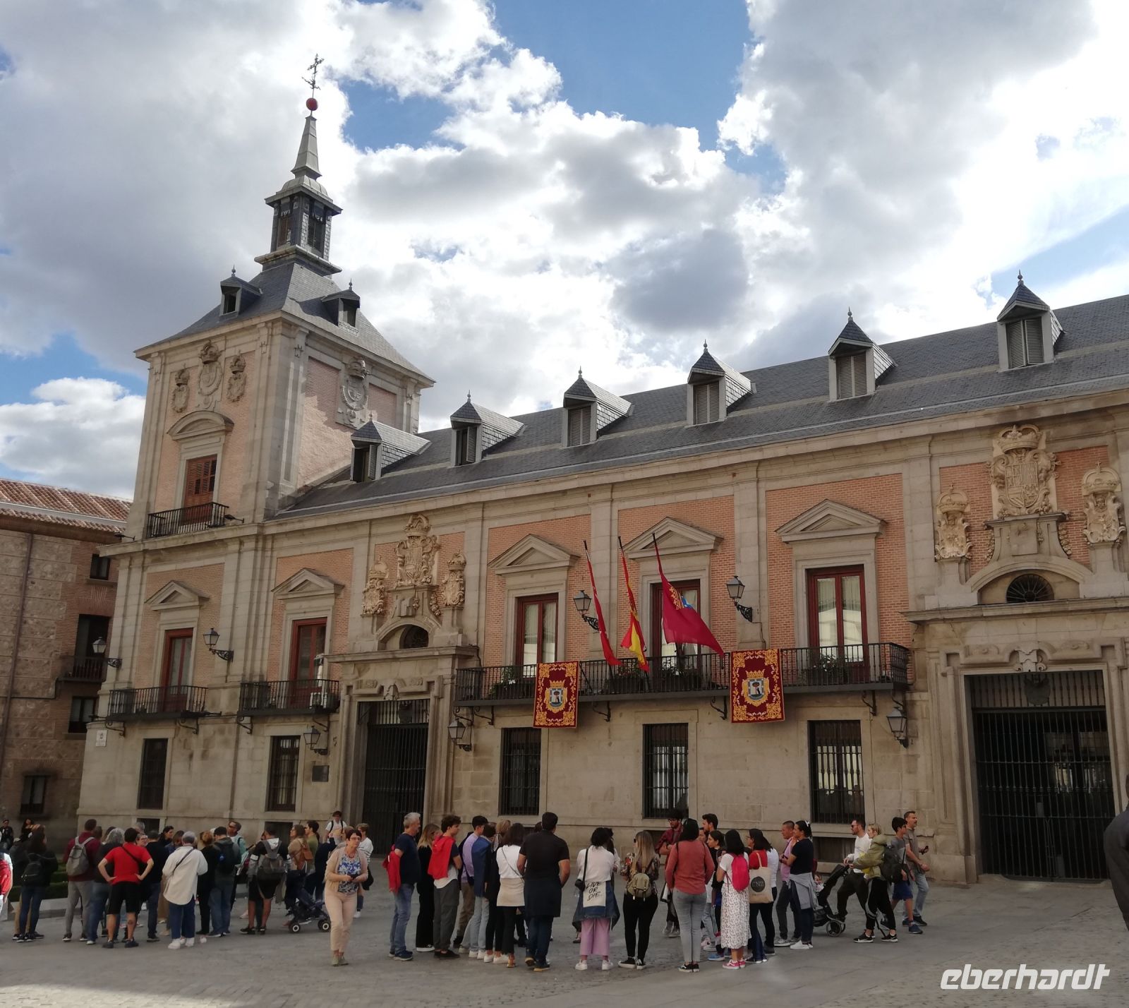 Ein viereckiger Platz, 129 m lang und 94 Meter breit, der einheitlich mit viergeschossigen Gebäuden umbaut ist. Heute war hier eine große Bühne für das Fest des heiligen Isidor aufgebaut und so wurde das besondere Gebäude „Casa de la Panadería“ mit sehr schönen Malereien etwas verdeckt.