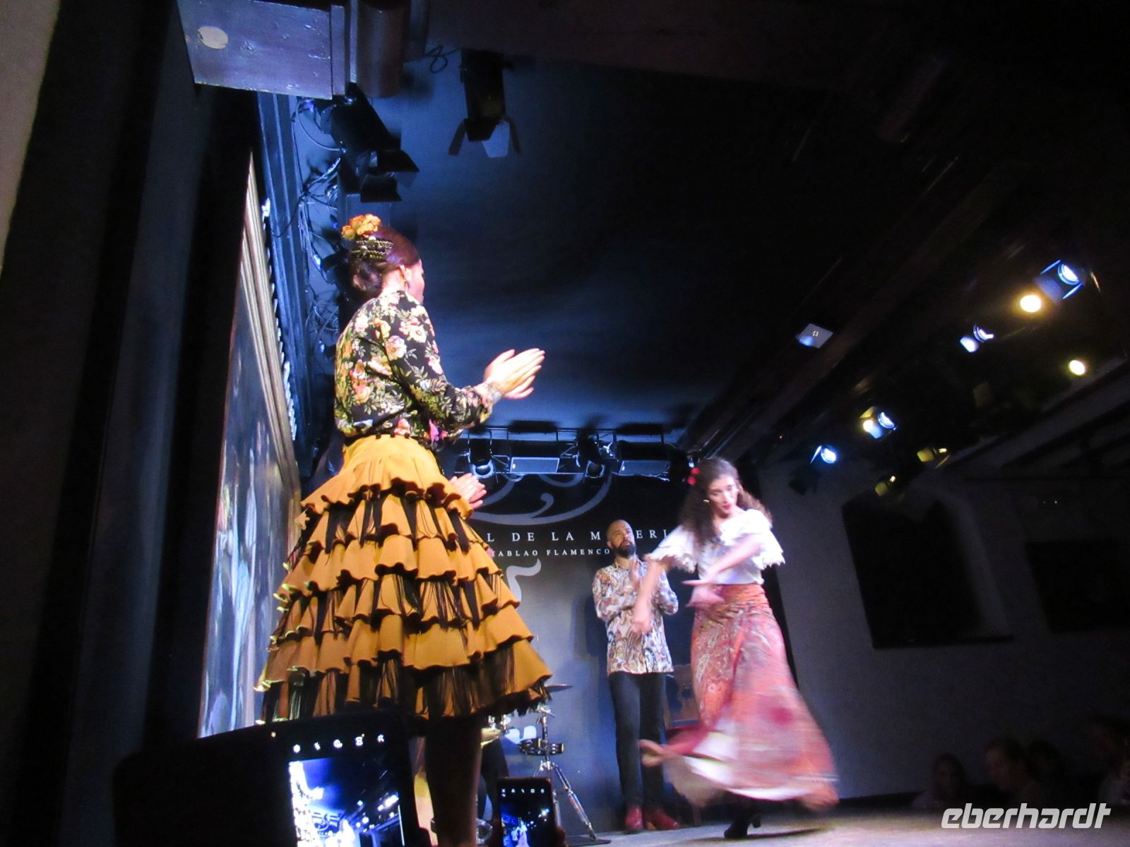 Wir haben die Tische gleich unter der Bühne erhalten und der Abend begann erst mit einem 3-Gang-Menü: „Coca“ Gemüsevorspeise, geröstetem Lachsfilet und Dessert aus fünf Schokoladen Delikatessen, sowie Getränken inklusive Wein. Zuvor konnten wir unserer Geburtstags-Dame zu Ihrem runden Geburtstag gratulieren und ich habe Ihr ein kleines Geschenk überreicht. Der Saal war bis zum letzten Platz besetzt, und wir hatten eine sehr gute Sicht. Die Show begann mit Gesang und Flamenco Tänzen, begleitet von Gitarre und Rhythmen von Händeklatschen, Kastagnetten und „Cajón“ – Kistentrommel. Die Tänzerinnen sprühten von Leidenschaft, Trauer, Freude und das tänzerische Können ist einfach sagenhaft. Die Tänzerinnen wechseln die Kleider und Stil der Musik, der Holzboden bebt unter den temperamentvollen Schritten der Tänzerinnen und des Tänzers. Feuer im Blut der Tänzerinnen wechseln zu sanften Klängen der Gitarre und unsere Hände sind heiß vom Klatschen…