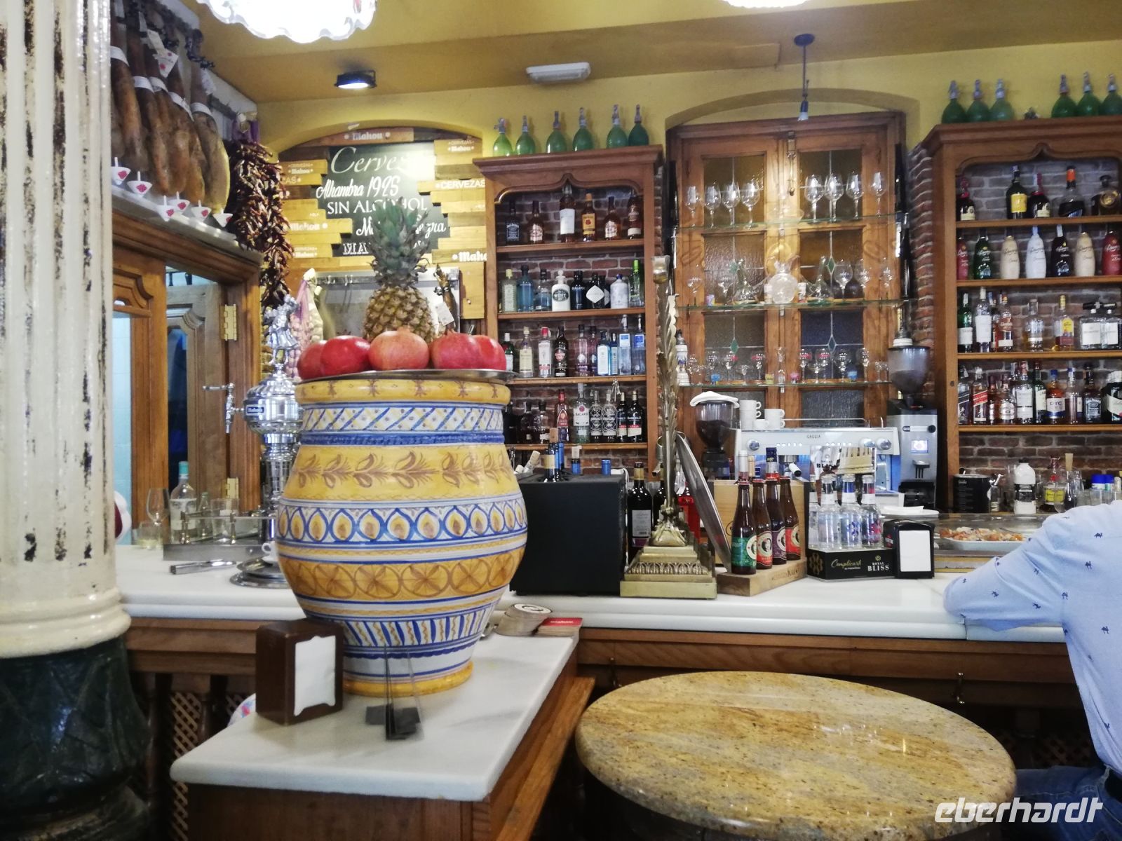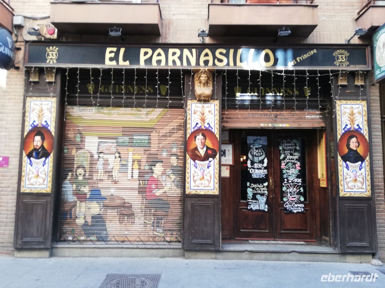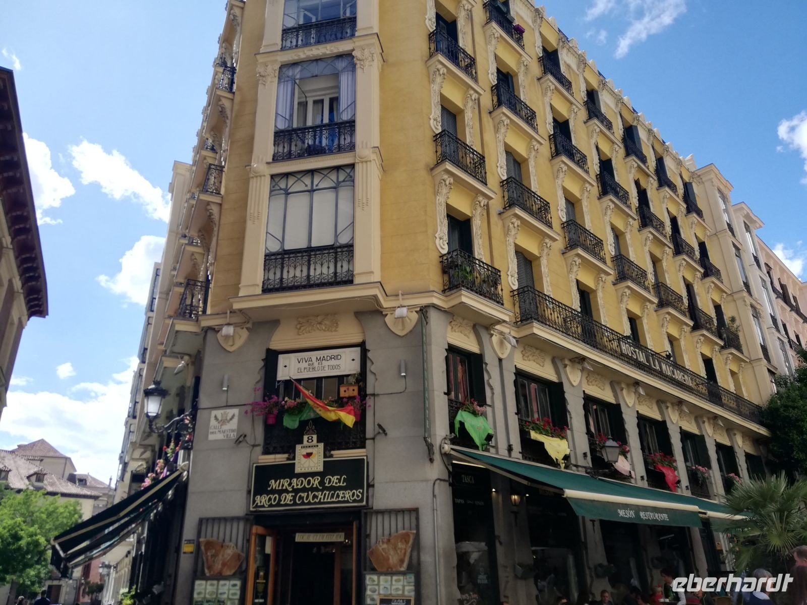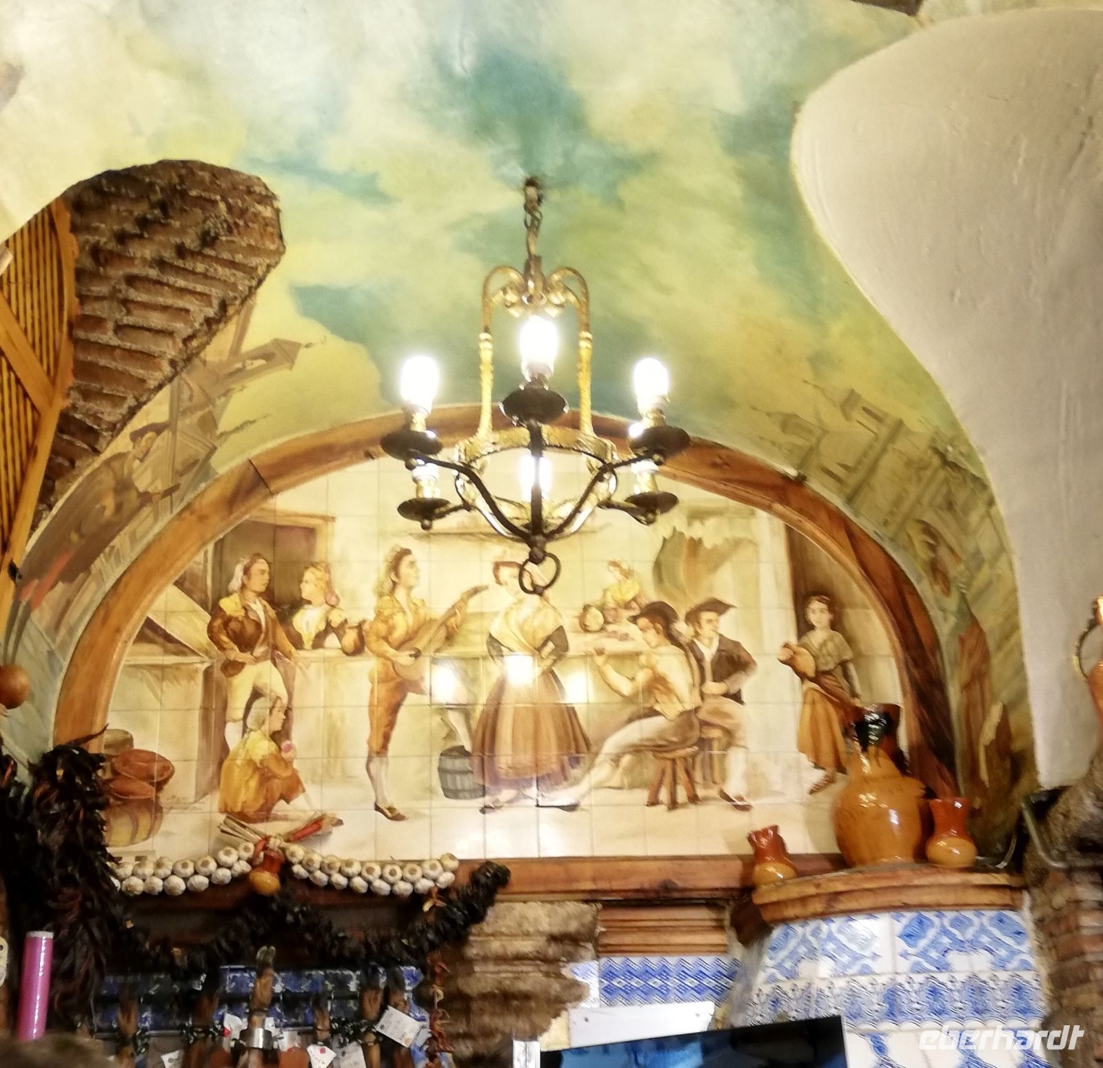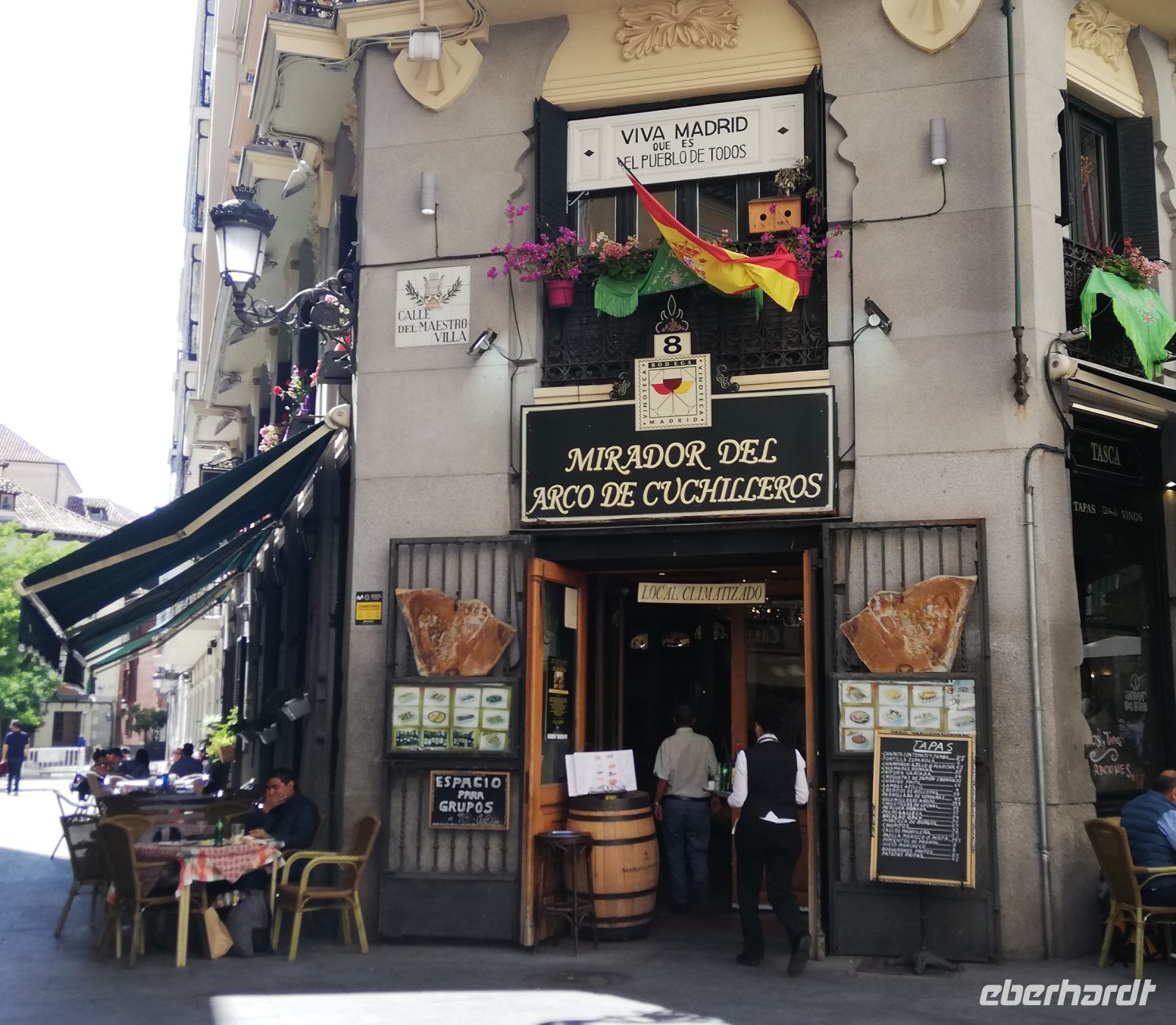 Wir laufen weiter über die Calle Mayor und machen einen kleinen Stopp mit Erfrischung in der Eisdiele. Danach noch eine kleine Freizeitpause mit der Möglichkeit sich die Markthalle „Mercado de San Miquel“ anzuschauen. Dann laufen wir zu unserem ersten Abendessen in Madrid zum traditionellen „ältesten Restaurant der Welt“ „Restaurante Botin“ in der Calle de Cuchilleros. Schon Ende des 16. Jahrhunderts stand an dieser Stelle eine Schankstube. Aus einem Protokoll ist zu entnehmen, dass für den Neubau die amtliche Zulassung als Herbergsbetrieb im Jahre 1590 beantragt wurde. Im Jahr 1725 wurde das Gebäude umgebaut und diese Zahl ist im Stein über der Eingangstür gemeißelt. Aus dieser Zeit stammt auch der Bratofen, ein sehr wichtiges Requisit des Hauses. Das Restaurant wurde um 20:00 Uhr geöffnet und war sehr schnell mit Gruppen gefüllt. Wir saßen etwas eng an einer Tafel im ersten Stock. Dennoch war die Bedienung sehr flott und freundlich. Wasser und Rotwein waren schnell auf den Tisch und so konnten wir unserem Geburtstagskind gratulieren. Ich überreichte ein kleines Geschenk im Namen von Eberhardt Travel und wir alle konnten mit dem Jubilar anstoßen.