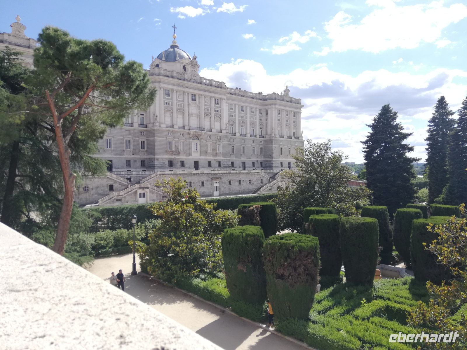 So starten wir mit einem lockeren Spaziergang an der Plaza de España, nur zwei Minuten von unserem Hotel entfernt, schlendern weiter an den Sabatini Gärten vorbei zu Palacio Real. Nicht nur Touristen, sondern auch viele Madrilenen mit Kindern kamen uns entgegen und genossen sichtlich den wunderschönen sonnigen Tag. Straßenkünstler belustigten die fröhlichen Menschen mit lustigen Auftritten und uns auch.