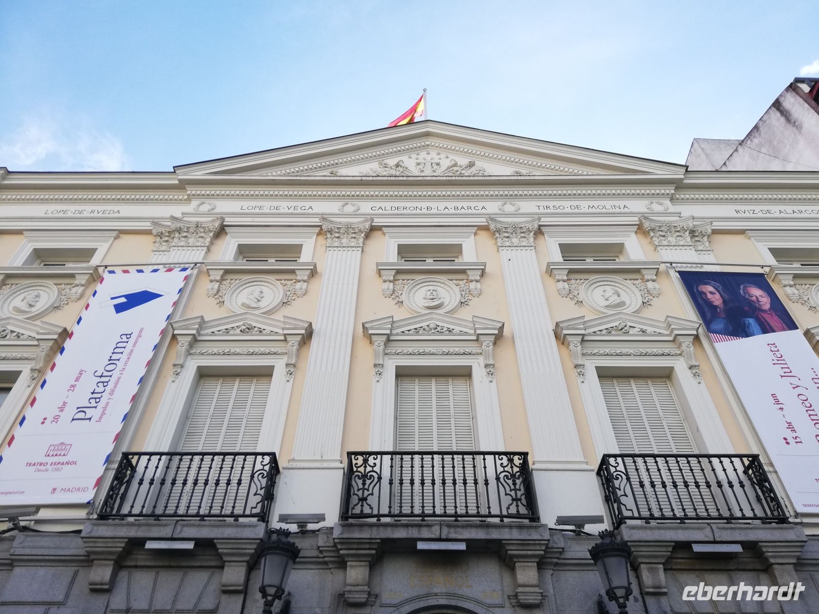 So starten wie den Spaziergang durch den Dichterviertel – erst über die „Gran Via“, die erst seit 100 Jahren existiert. Gebaut von 1910 bis 1931 läutete sie die Modernisierung der Stadt ein und ersetzte als neue Ader der Stadt die kleinen Sträßchen und Häuser, die Ihr weichen mussten. Hier entstanden auch die ersten Wolkenkratzer nach dem Baustil aus USA. Bekannt ist das Gebäude der „Telefonica“ auf der Plaza de Callao mit 81 Meter Höhe, damals das höchste Gebäude Madrids. Weiter bewundern wir am Weg die wunderschöne Architektur in unterschiedlichen Stilen. An der Plaza de Canalejas ein imposantes Gebäude des neuen „Four Seasons“ Hotels. Um 1900 entstand das Bankenzentrum mit repräsentativen Gebäuden – eine architektonische Collage. Wir bewundern die Architektur und versuchen es in unsere „Handy-Fotoapparate“ einzufangen“. An der Plaza Santa Ana ein anderes imposantes Gebäude: in dem ehemaligen Palast aus dem 19. Jahrhundert mit modernistischer Fassade ist heute das Hotel „ME Melia Reina Viktoria“ angesiedelt. Plaza Santa Ana im beliebten Viertel „Huertas“ – hier findet man die typischen Tapas Bar und kleine Kneippen mit Charme. Nicht nur Wein wird in Madrid getrunken, sondern auch Bier hat hier eine große Tradition. Vor allem „Cervecería Alemana“ ist bekannt – hier soll schon Hemingway gerne das Bier genossen haben. Und hier sind wir schon auch Mitten im Dichterviertel – „Barrio de los Poetas“. Wir stehen direkt vor dem „Teatro Español“ mit der historischen Fassade. Das Theatergebäude aus dem 16. Jahrhundert hatte ursprünglich 1.200 Plätze. Im 1849 wurde es nach dem Umbau mit der Aufführung von Romeo und Julia eröffnet. Auf der Bühne des Theaters wurden die Werke von Cervantes, Lope de Vega, Tirso de Molina, Calderón und vielen anderen bedeutenden Dichter und Dramatiker aufgeführt.
