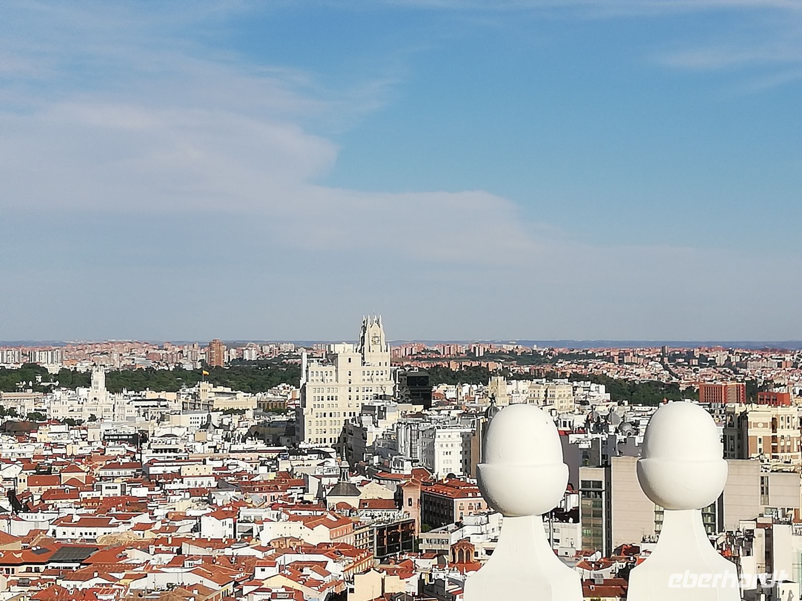Es ist unser letzter Abend und so bietet sich noch an, an den sonnigen Nachmittag mit klarer Sicht die wunderschöne Stadt Madrid von oben zu sehen. Nicht alle Gäste waren interessiert, auch etwas müde von dem interessanten Ausflug. Dennoch hatten drei Gäste Interesse Madrid von oben zu sehen. Nach einer kleinen Erfrischung im Hotel und Online Check In unserer Flüge fahren wir mit dem Aufzug des bekannten „RIU Hotels“ auf der Plaza de España in die Sky Bar 360 in die 26. Etage des Hotels. Bei fantastischer Sicht konnten wir in alle Richtungen von oben Madrid sehen, einiges was wir bisher in Madrid erkundet haben und einiges, was sicher noch sehenswert wäre. Madrid liegt uns zu Füssen und wir sagen „Adieu Madrid“. Vielleicht ist das nicht der letzte Besuch einer Stadt, die so viel von Historie, Architektur, Kunst und Live Style zu bieten hat.