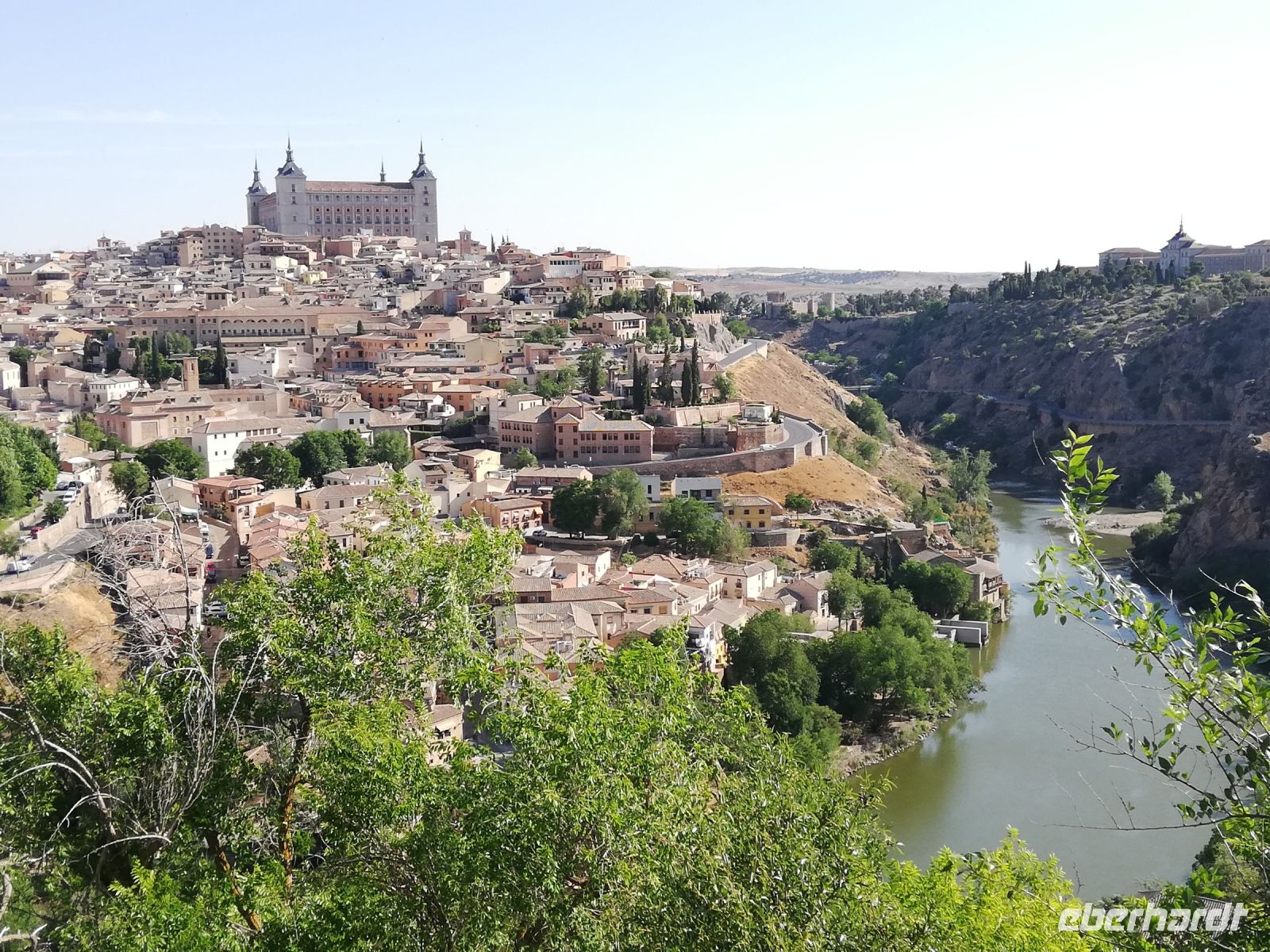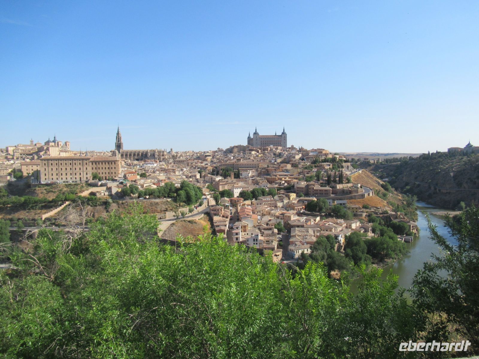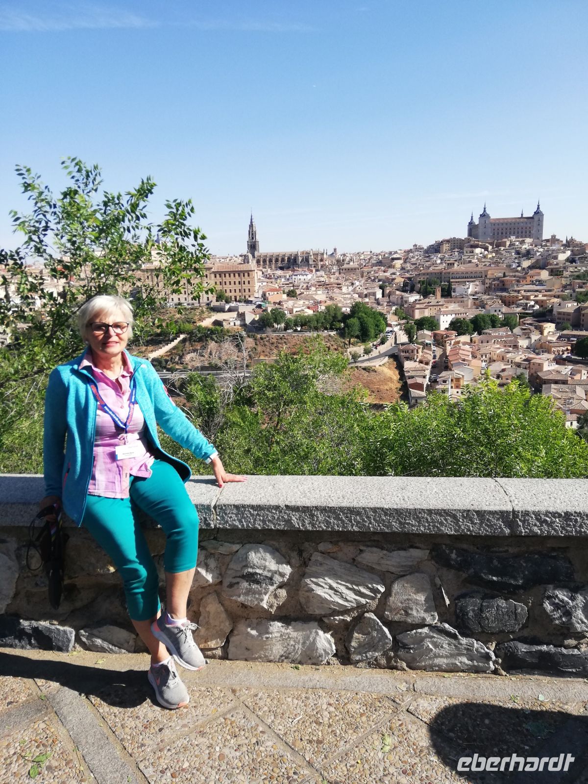 Die ehemalige Hauptstadt von Spanien, liegt an einem 100 Meter hohem Hügel, den der Fluss Tajo umfließt. Das historische Zentrum von Toledo zählt zum UNESCO-Weltkulturerbe. Zunächst fahren wir beim schönsten Wetter rund um die Stadt, um von einem Aussichtspunkt die Silhouette von Toledo zu sehen. Ein wunderschönes Panorama-Bild eröffnet sich vor uns, auch mit den Schluchten rund um und den Fluss Tajo.
