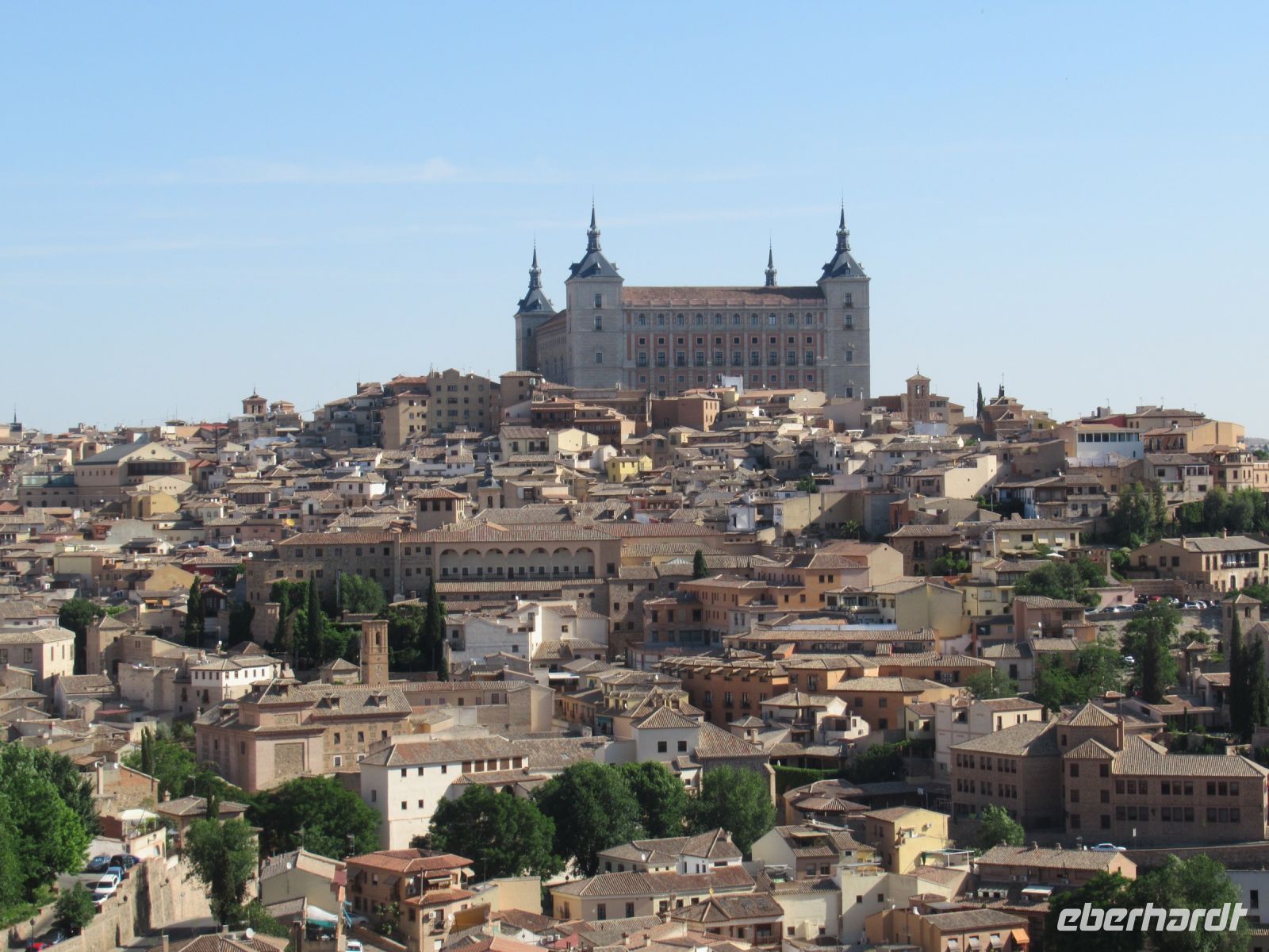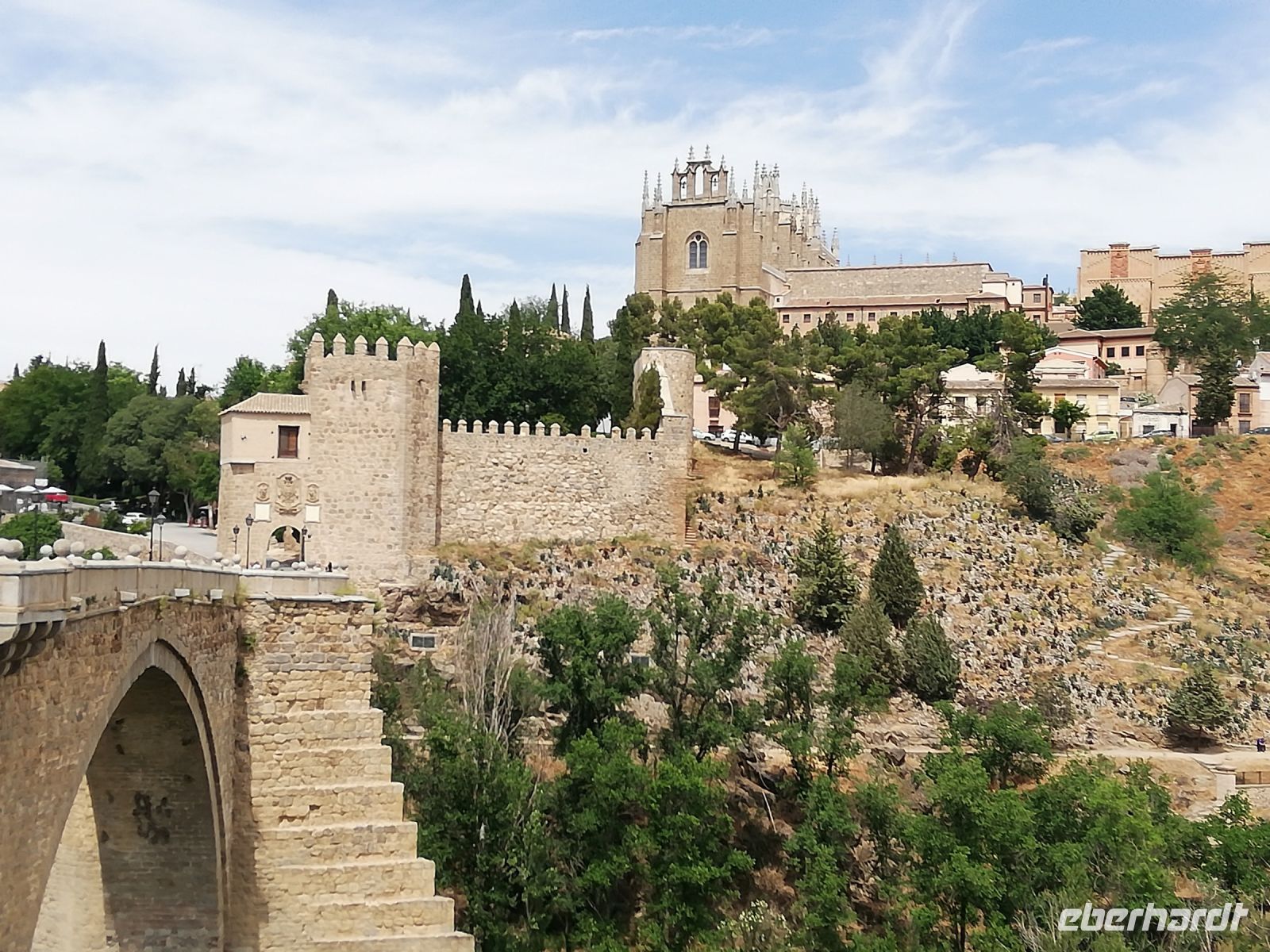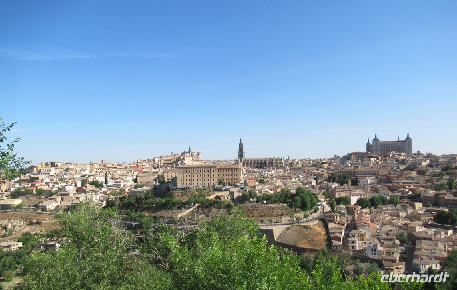 Die ehemalige Hauptstadt von Spanien, liegt an einem 100 Meter hohem Hügel, den der Fluss Tajo umfließt. Das historische Zentrum von Toledo zählt zum UNESCO-Weltkulturerbe. Zunächst fahren wir beim schönsten Wetter rund um die Stadt, um von einem Aussichtspunkt die Silhouette von Toledo zu sehen. Ein wunderschönes Panorama-Bild eröffnet sich vor uns, auch mit den Schluchten rund um und den Fluss Tajo.