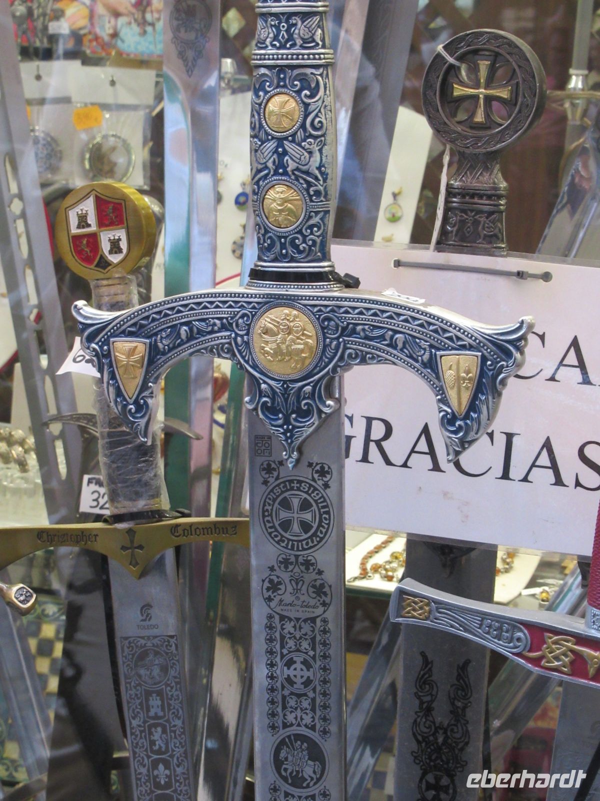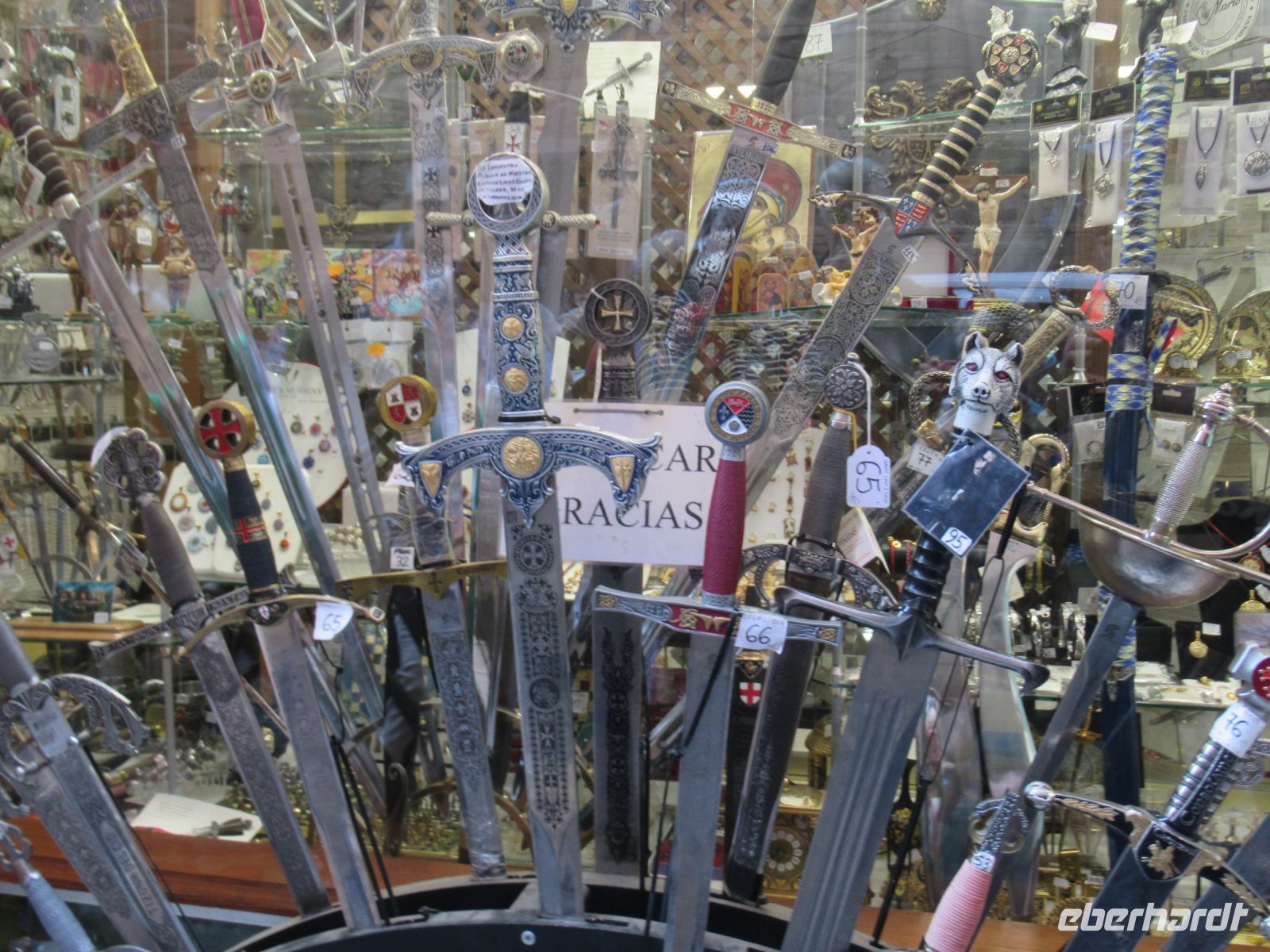 Dann geht es durch die engen Sträßchen von Toledo, an diversen Boutiquen mit Keramik, Schmuck und historischen Waffen wie Schwerte, vorbei. Toledo ist für Schwertschmieden berühmt, die hier mit Stolz präsentiert werden. Allerdings ist es als „Souvenir“ etwas ungeeignet…