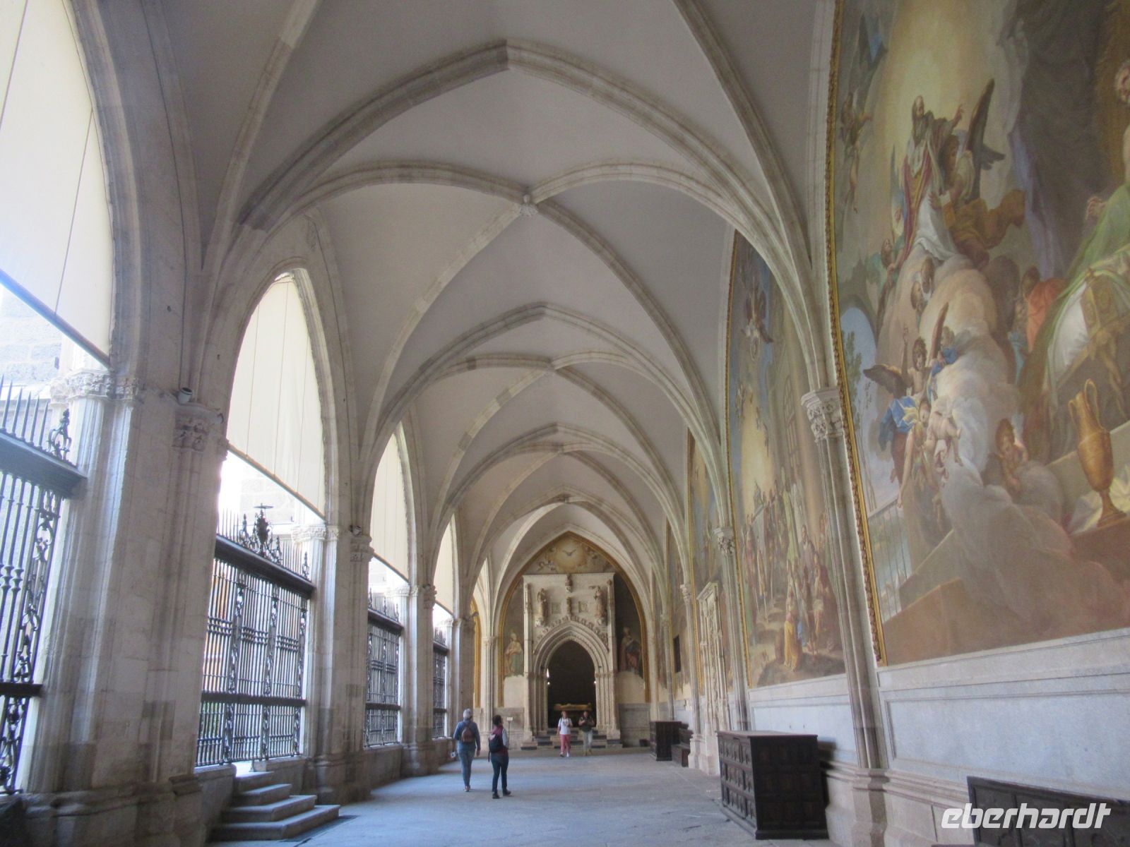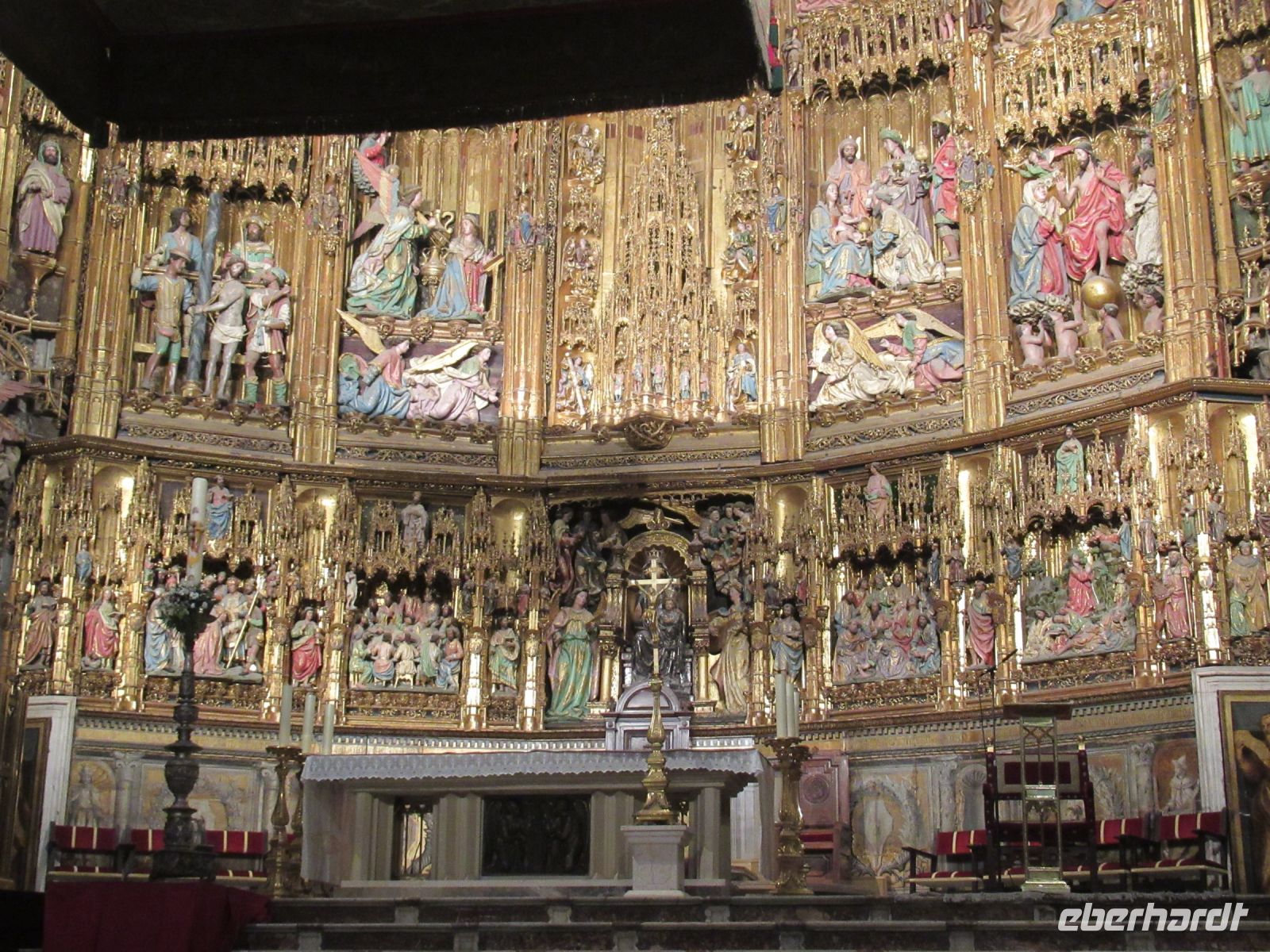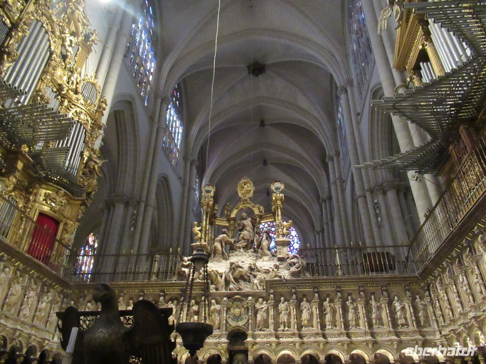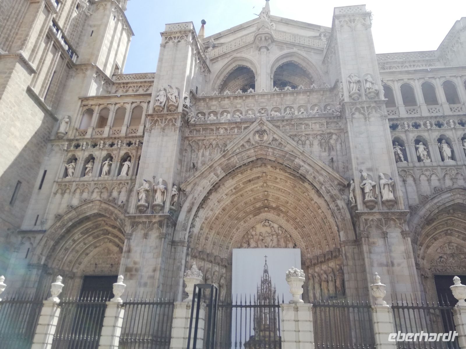 Wir schlendern weiter durch die verwinkelten Gassen der Altstadt und gelangen zu der Kathedrale Santa María. Die Kirche hat gewaltige Ausmaße: 112 m lang, 56 Meter breit und 44 Meter hoch. Die Kathedrale hat aufgrund der langen Bauzeit zwischen 1227 und 1493 unterschiedlicher Baustile, dennoch gilt sie als eine der wichtigsten gotischen Kirchen in Spanien. Die fünfschiffige Kathedrale mit zwei Orgeln gilt als zweitgrößte gotische Kathedrale in Spanien. Thomas erklärt uns die einzelnen Altäre und den Hauptaltar. Die Kirche hat 32 Kapellen. In der der Sakristei konnten wir die Werke von El Greco - „Entkleidung Christi“ und Werke von Goya, Ribera, Raffael und van Dyk bewundern.