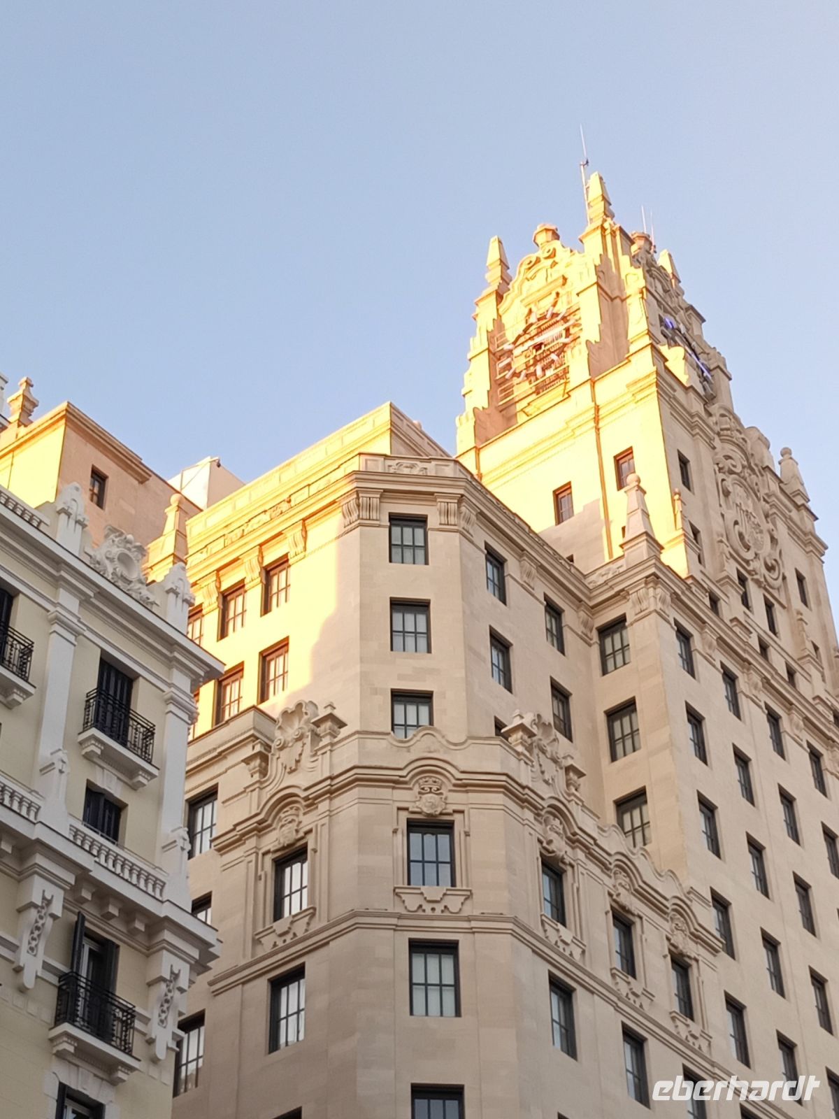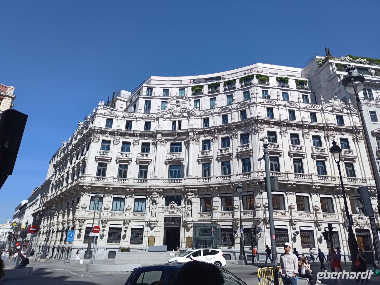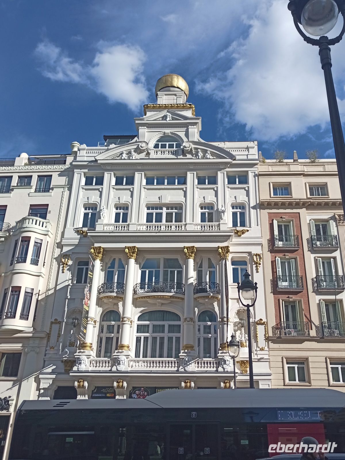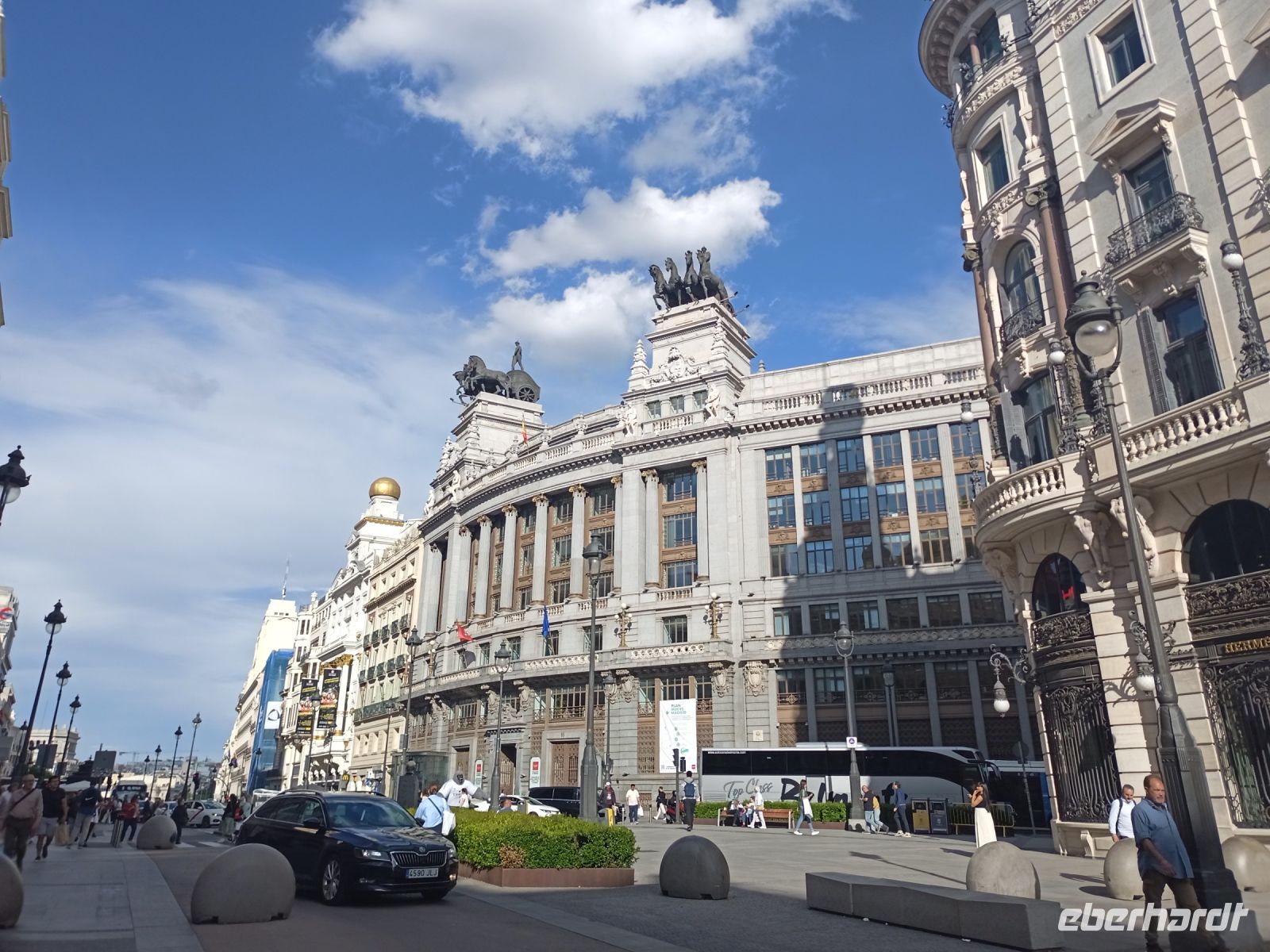 Weiter entlang der Straße bewunderten wir die eleganten Fassaden zahlreicher Hotels, Theater und Bürogebäude, viele im Stil des Eklektizismus, Jugendstils oder Art Déco gehalten, sowie das markante Telefónica-Gebäude, eines der ersten Hochhäuser Europas, das mit seinem nüchternen Stil an amerikanische Wolkenkratzer erinnert.
