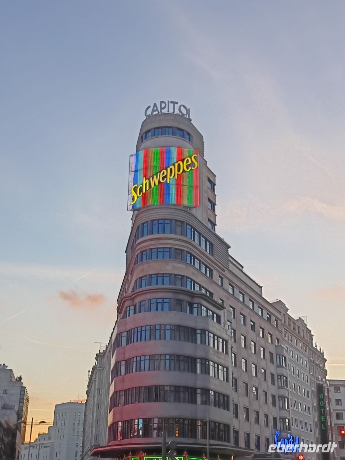 Am Callao erreichten wir das berühmte Capitol-Gebäude, auch bekannt als Edificio Carrión, mit seiner geschwungenen Fassade und der leuchtenden „Schweppes“-Reklame – ein echtes Wahrzeichen der Stadt und beliebtes Fotomotiv.