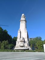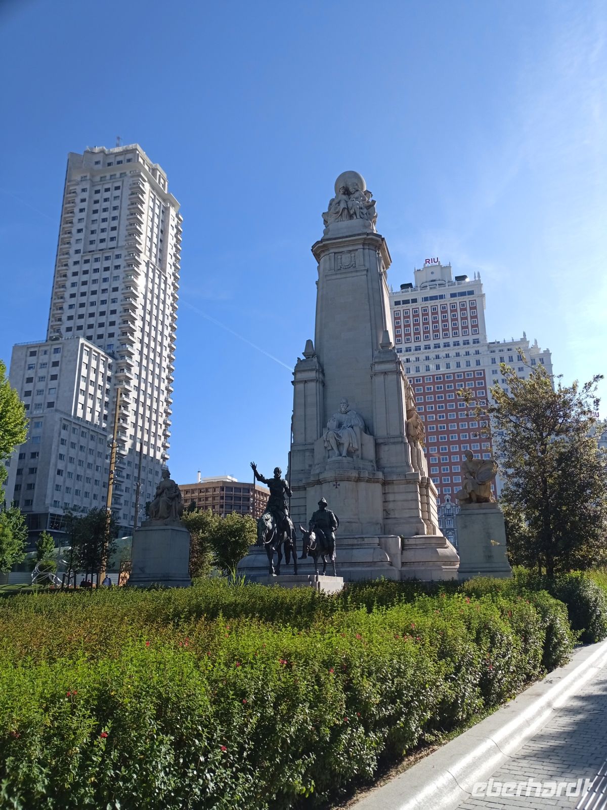 Wir starten an der Plaza de Oriente und spazieren vorbei an den Sabatini-Gärten, die derzeit renoviert werden. Unser nächstes Ziel ist die Plaza de España. Dort erklärt uns Thomas das Cervantes-Denkmal, das mit einer bittersüßen Geschichte rund um den Bau verbunden ist. Die Umgebung wird architektonisch modernisiert, unter anderem mit neueren Hotelbauten wie dem "Riu Plaza España".
